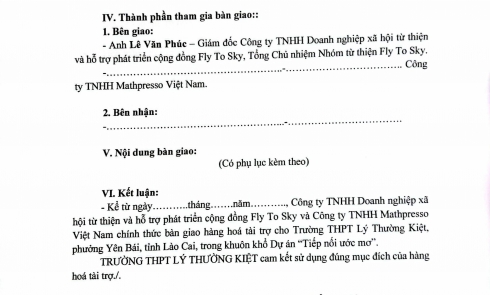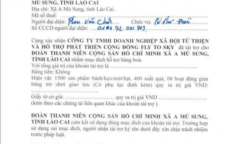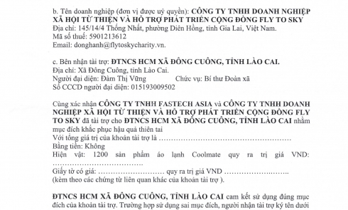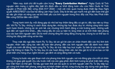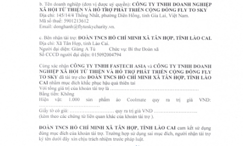 • Mọi đóng góp đều được cấp Giấy xác nhận ủng hộ. Giấy xác nhận sẽ được gửi qua Zalo trong vòng 7–10 ngày kể từ khi Fly To Sky nhận được thông tin đầy đủ (tên, SĐT/Email, số tiền hoặc danh sách hiện vật).