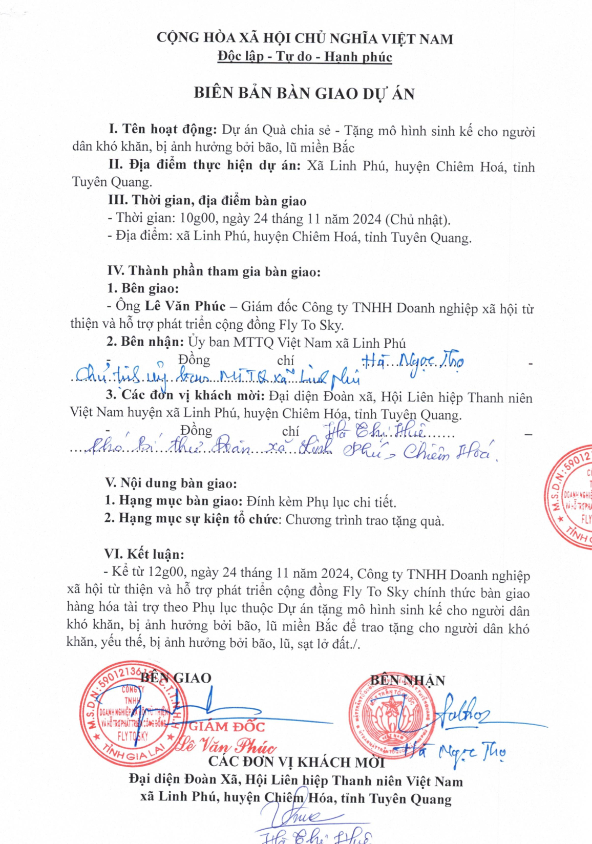 Biên bản bàn giao dự án QUÀ CHIA SẺ tại xã Linh Phú, huyện Chiêm Hóa, tỉnh Tuyên Quang