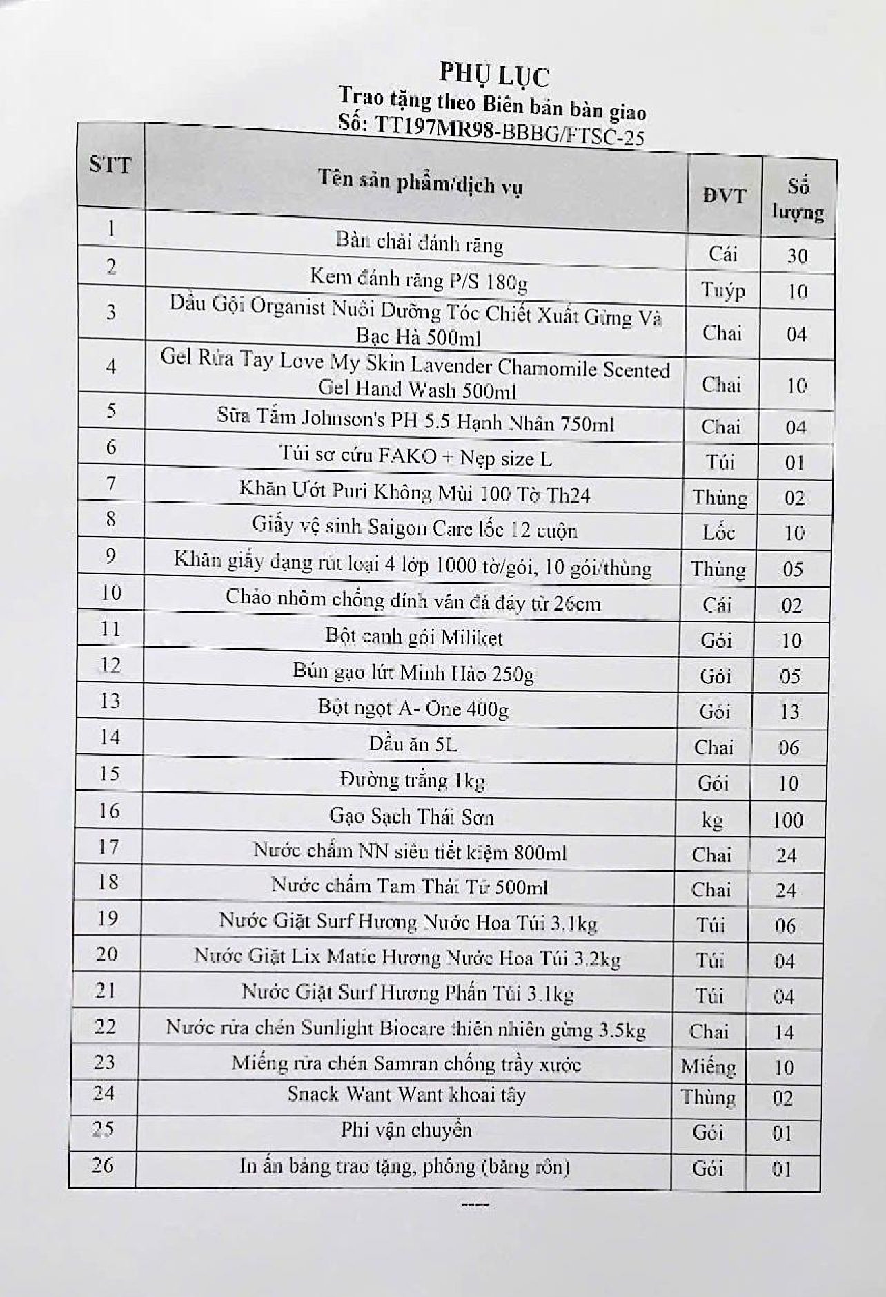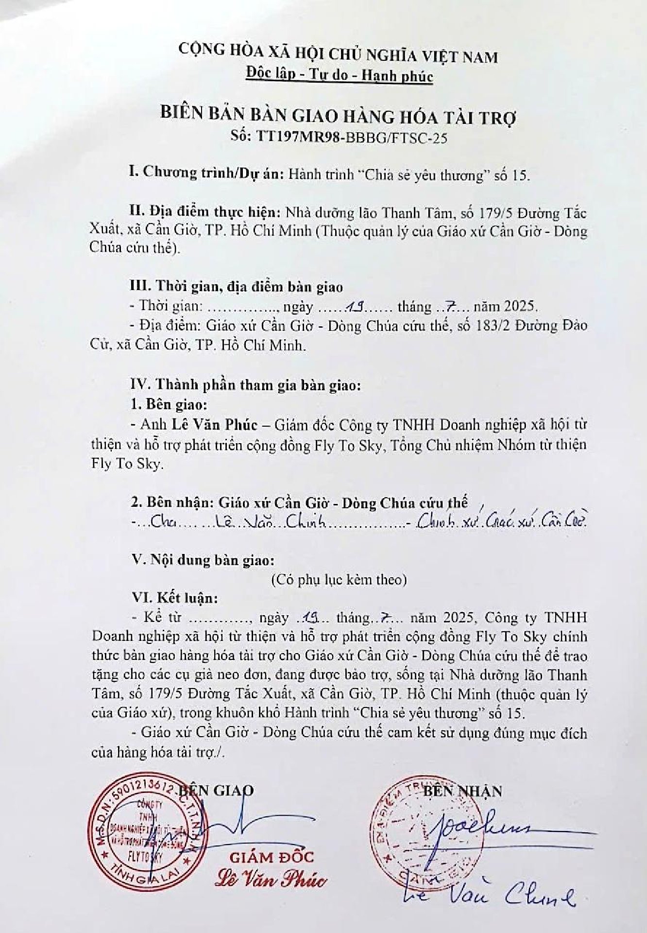 Biên bản bàn giao hàng hóa tài trợ cho Cơ sở bảo trợ và nuôi dưỡng trẻ mồ côi Long Hoa, số 1250/41 Huỳnh Tấn Phát, phường Tân Mỹ, TP. Hồ Chí Minh
