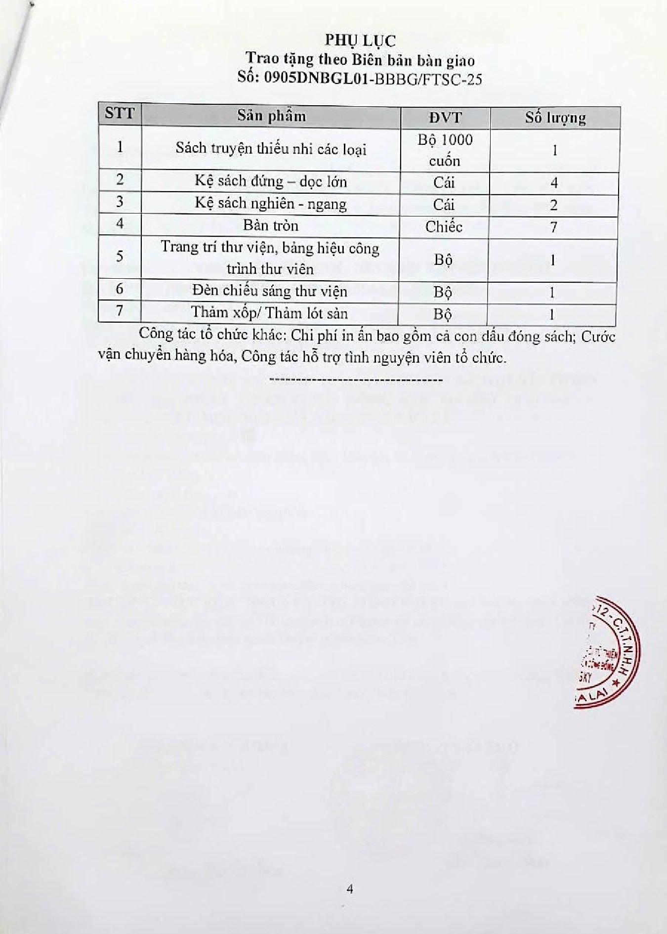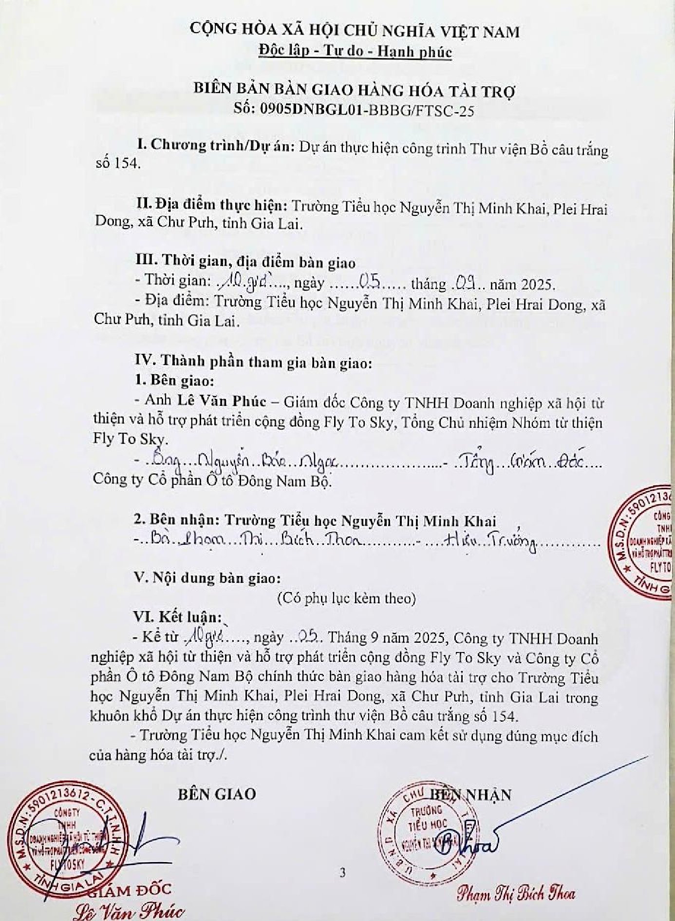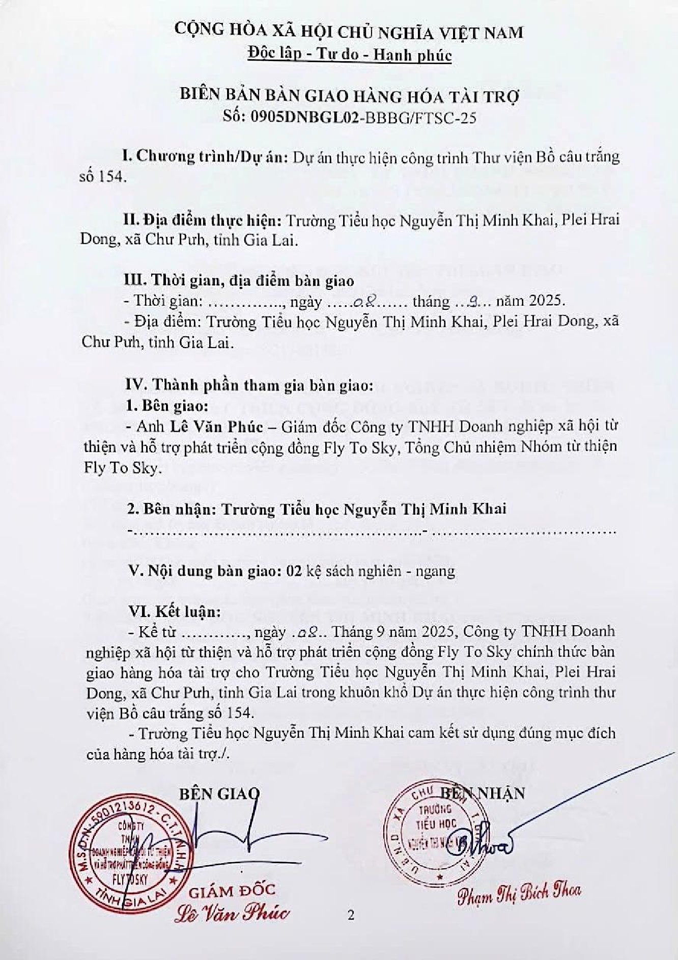 Biên bản bàn giao hàng hóa tài trợ cho Trường Tiểu học Minh Khai, Plei Hrai Dong, xã Chư Pưh, tỉnh Gia Lai