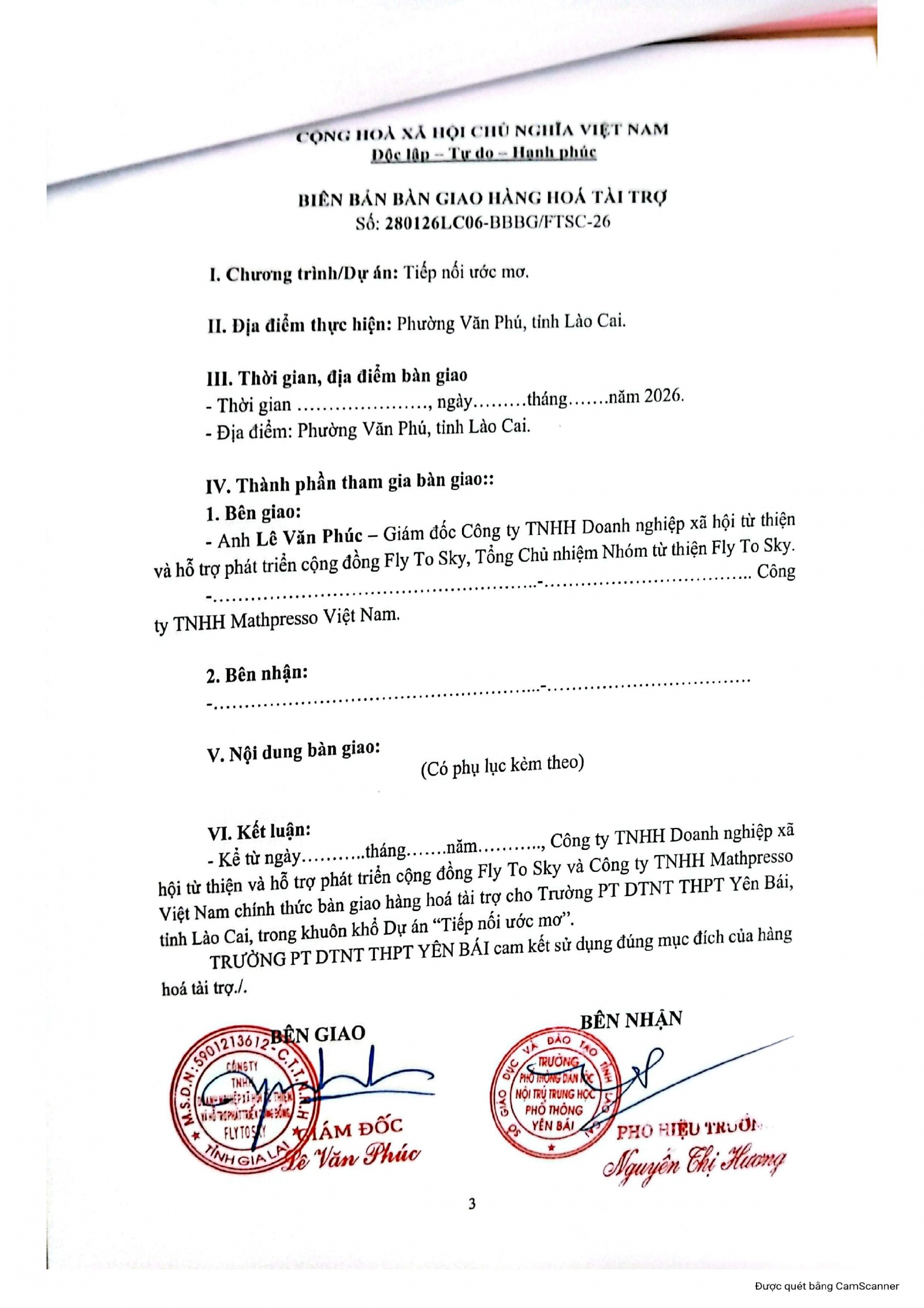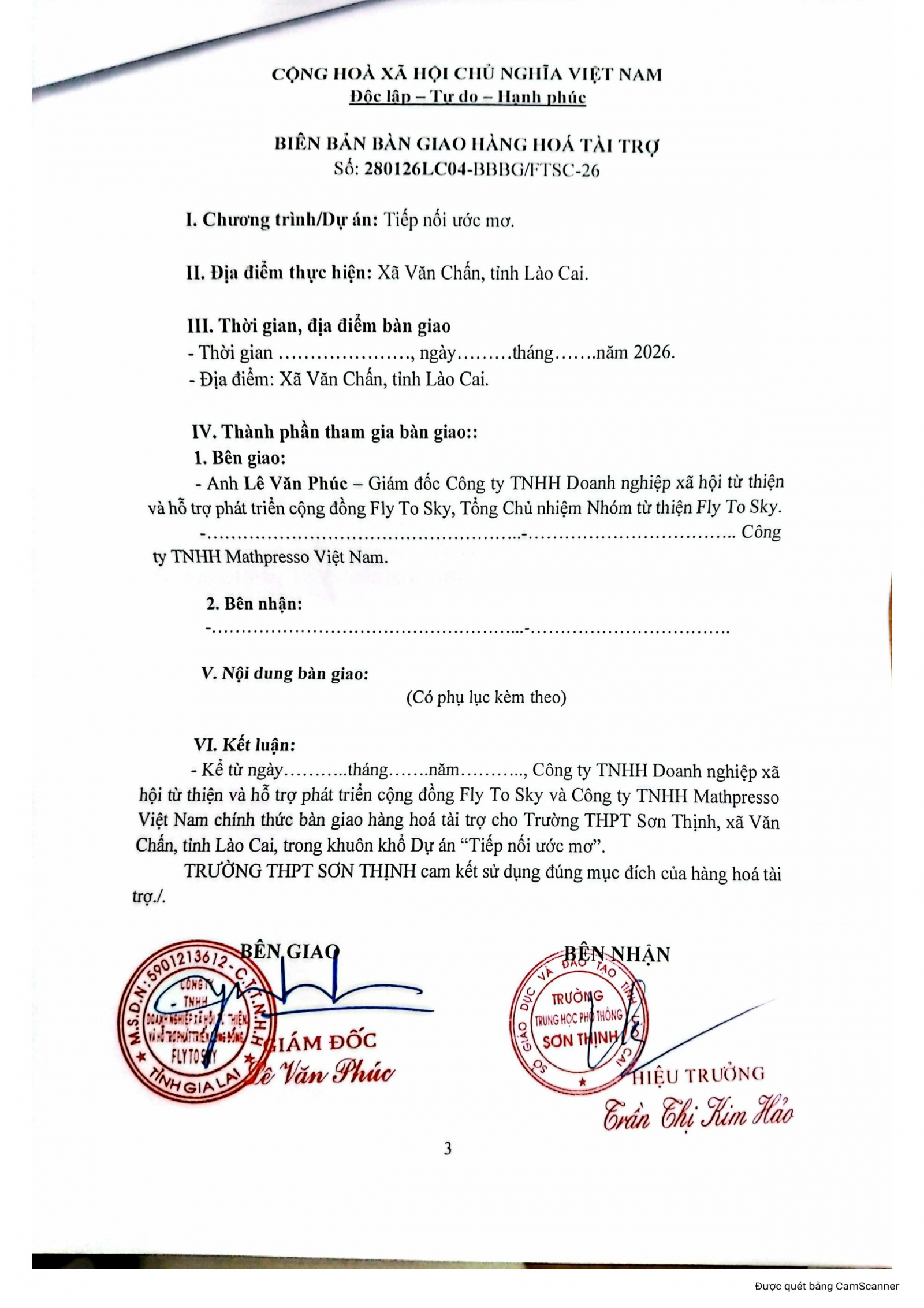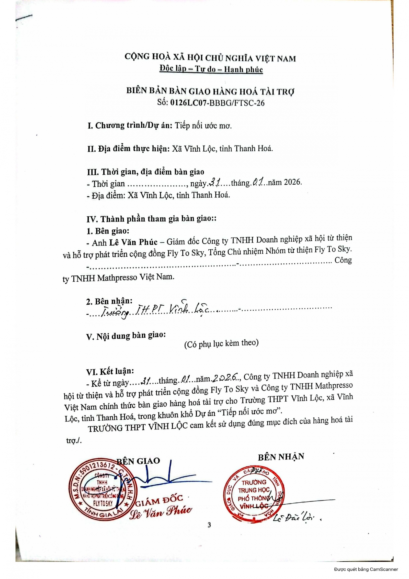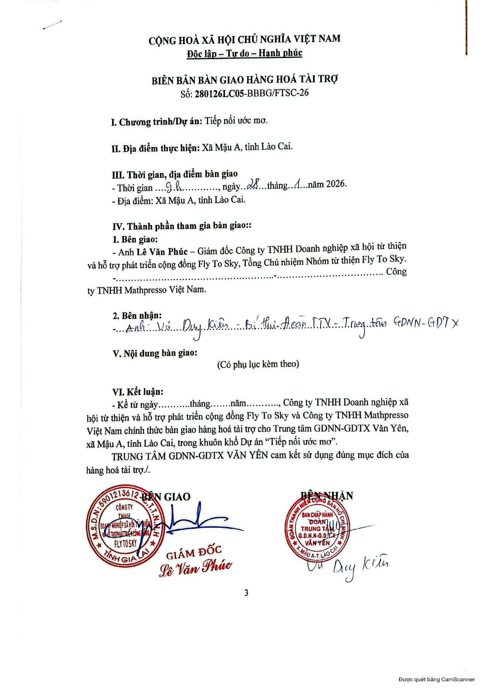 - Các đơn vị, cá nhân mong muốn đồng hành, hợp tác, tài trợ hoặc tư vấn thực hiện các Dự án CSR, ESG theo yêu cầu xin liên hệ số điện thoại 0375.136.800 hoặc 0935.939.446 hoặc email lienhe@flytoskycharity.vn – donghanh@flytoskycharity.vn