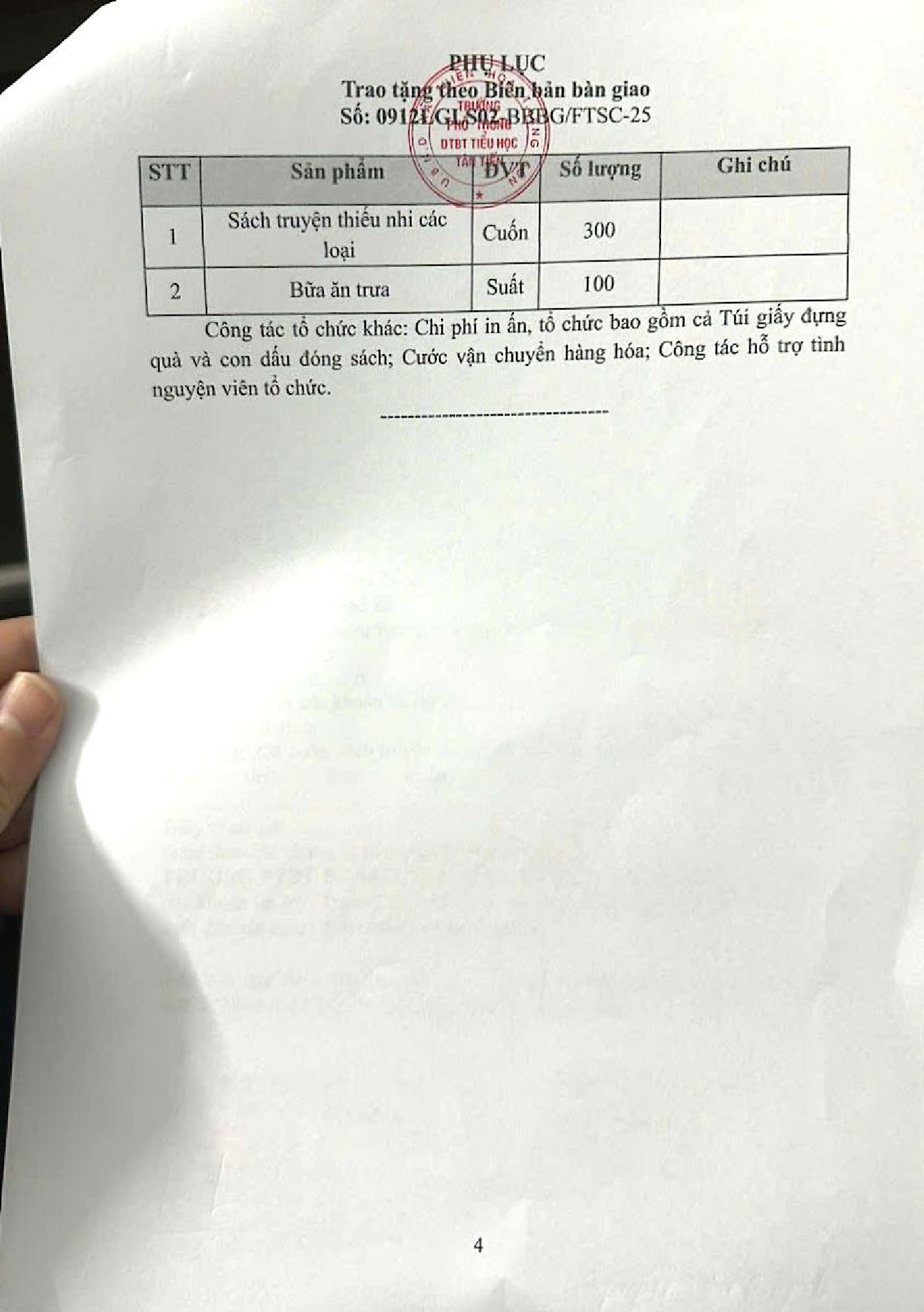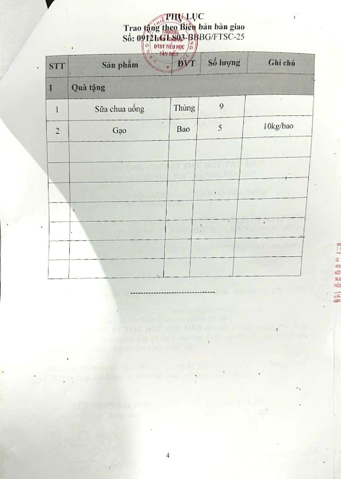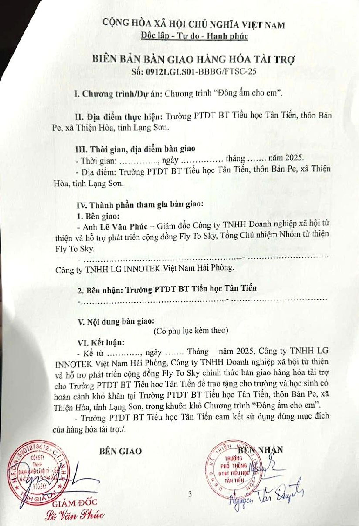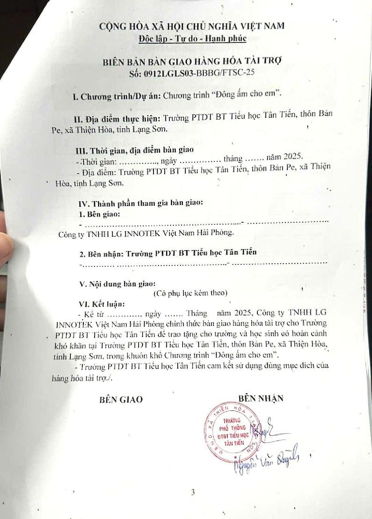 Biên bản bàn giao tài trợ chương trình ĐÔNG ẤM CHO EM cho trường PTDT BT Tiểu học Tân Tiến, thôn Bản Pe, xã Thiện Hòa, tỉnh Lạng Sơn