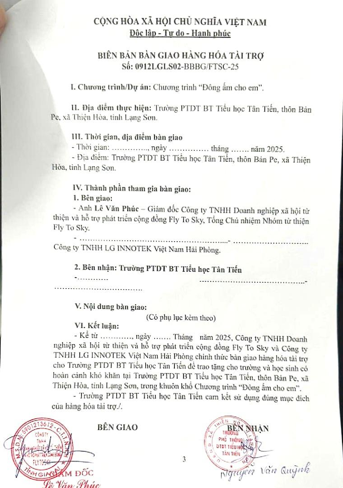 Biên bản xác nhận và Biên bản bàn giao tài trợ cho Trường Mầm non Hòa Bình, thôn Vĩnh Yên, xã Yên Bình, tỉnh Lạng Sơn.