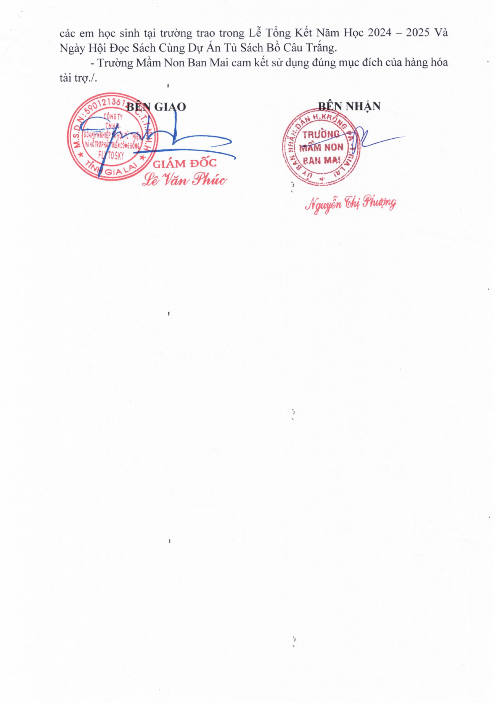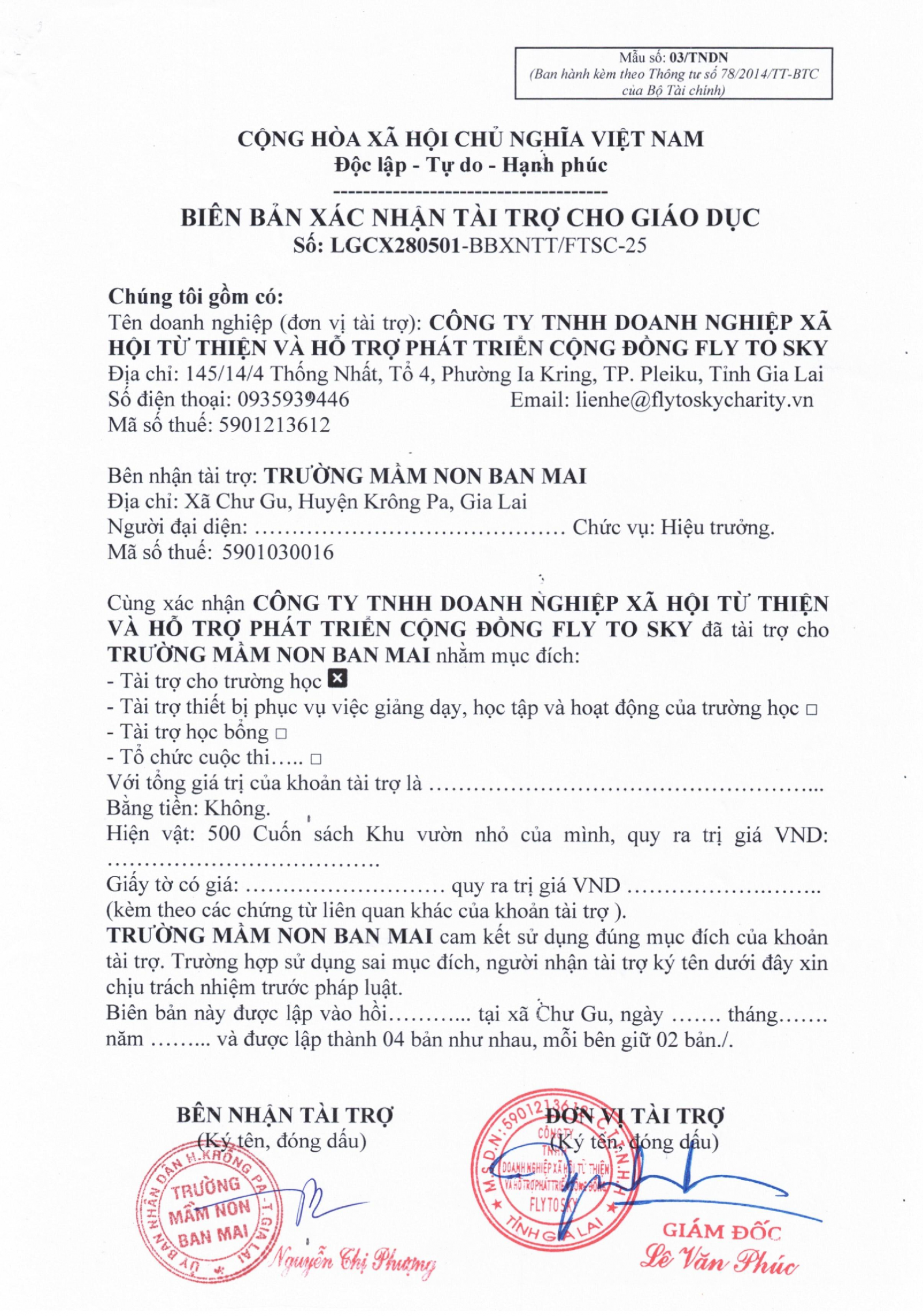 Biên bản xác nhận tài trợ cho giáo dục và Biên bản bàn giao hàng hóa tài trợ cho Trường Mầm non Ban Mai