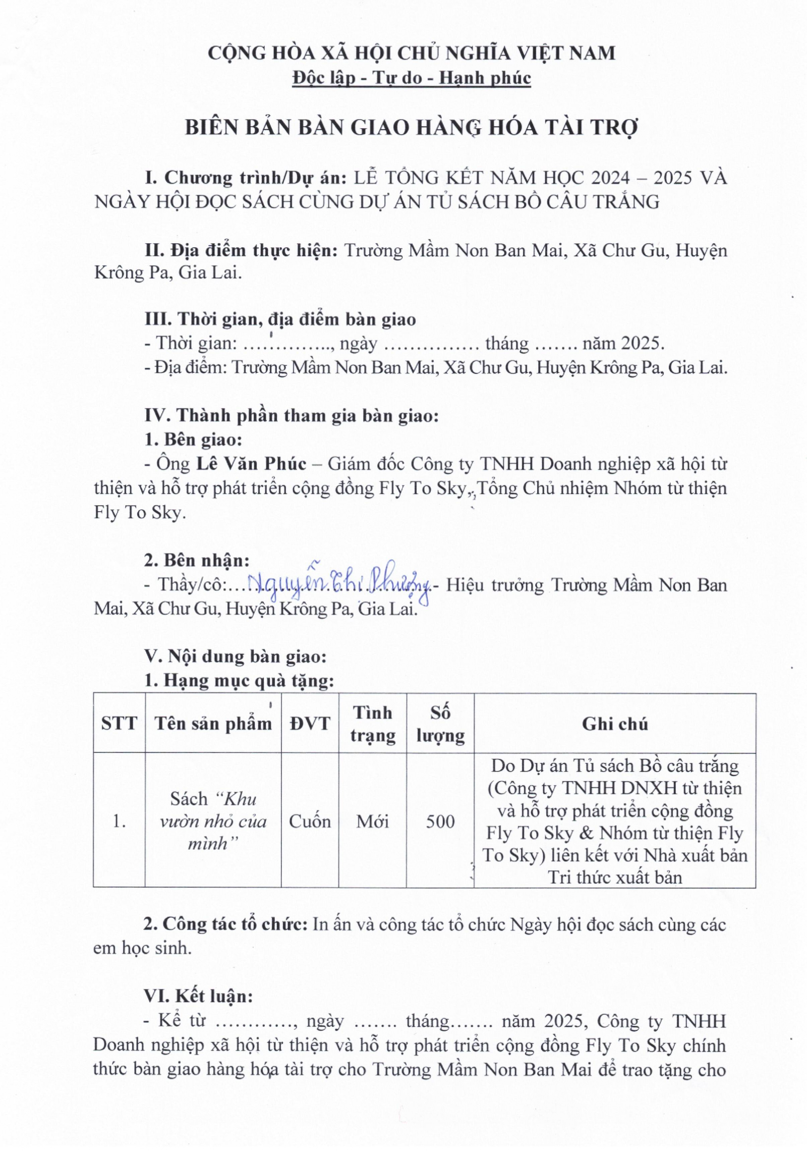 Biên bản xác nhận và Biên bản bàn giao tài trợ cho Trường Mầm non Hòa Bình, thôn Vĩnh Yên, xã Yên Bình, tỉnh Lạng Sơn.