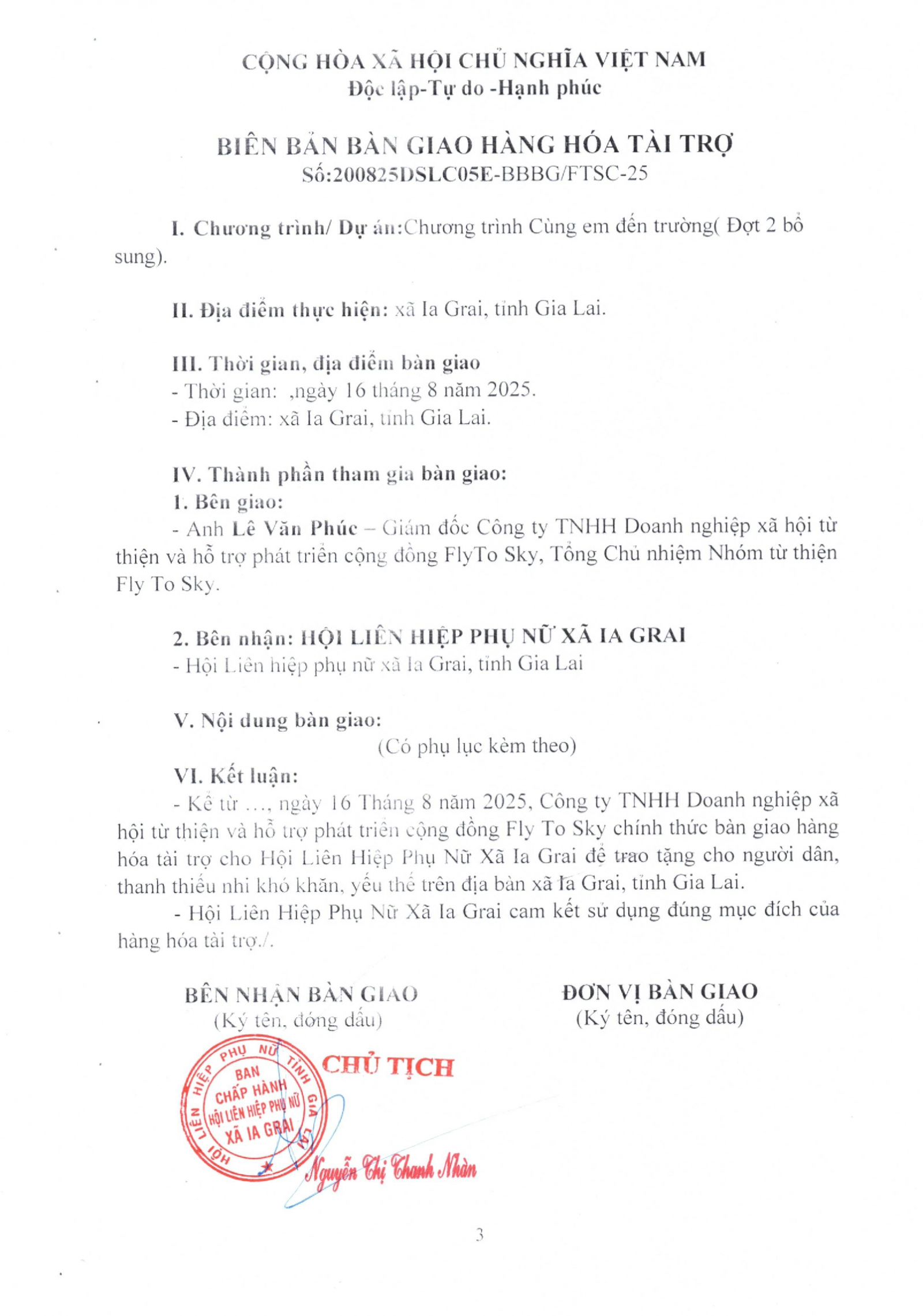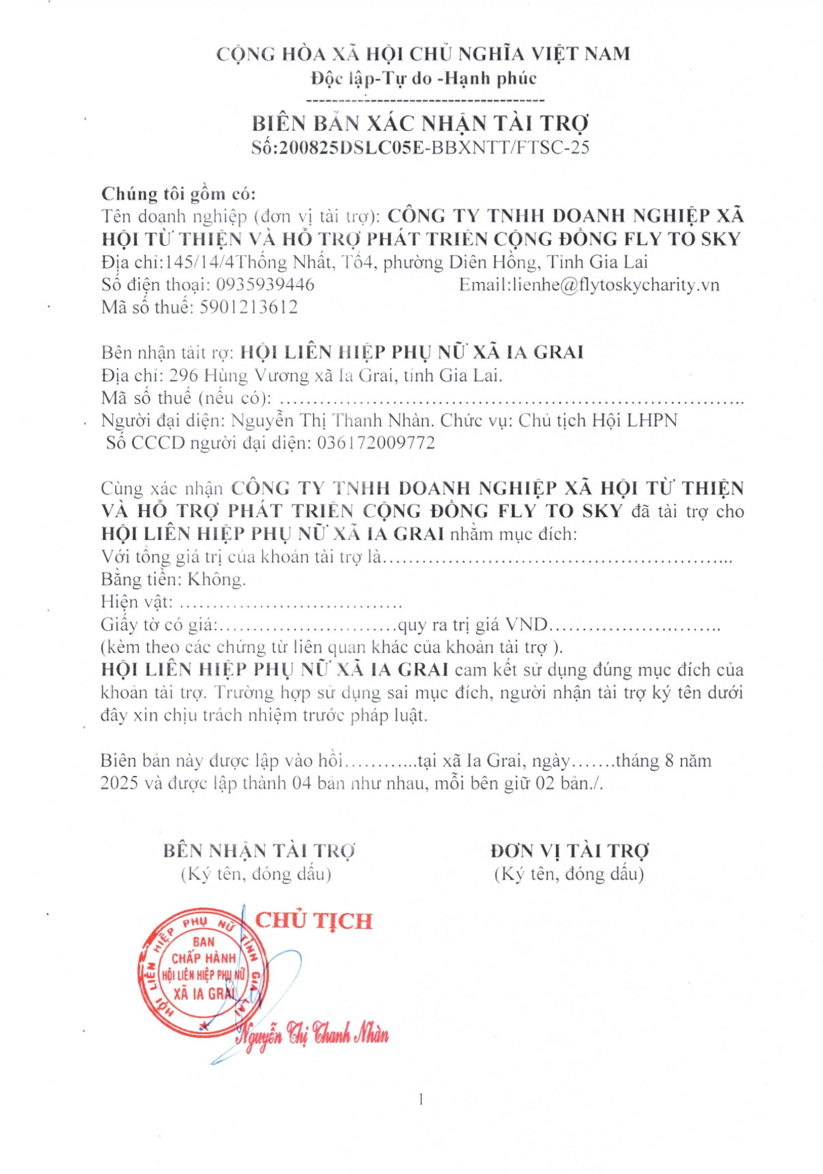 Biên bản xác nhận tài trợ và Biên bản bàn giao hàng hóa tài trợ cho Hội Liên hiệp Phụ nữ Xã IA Grai, Tỉnh Gia Lai