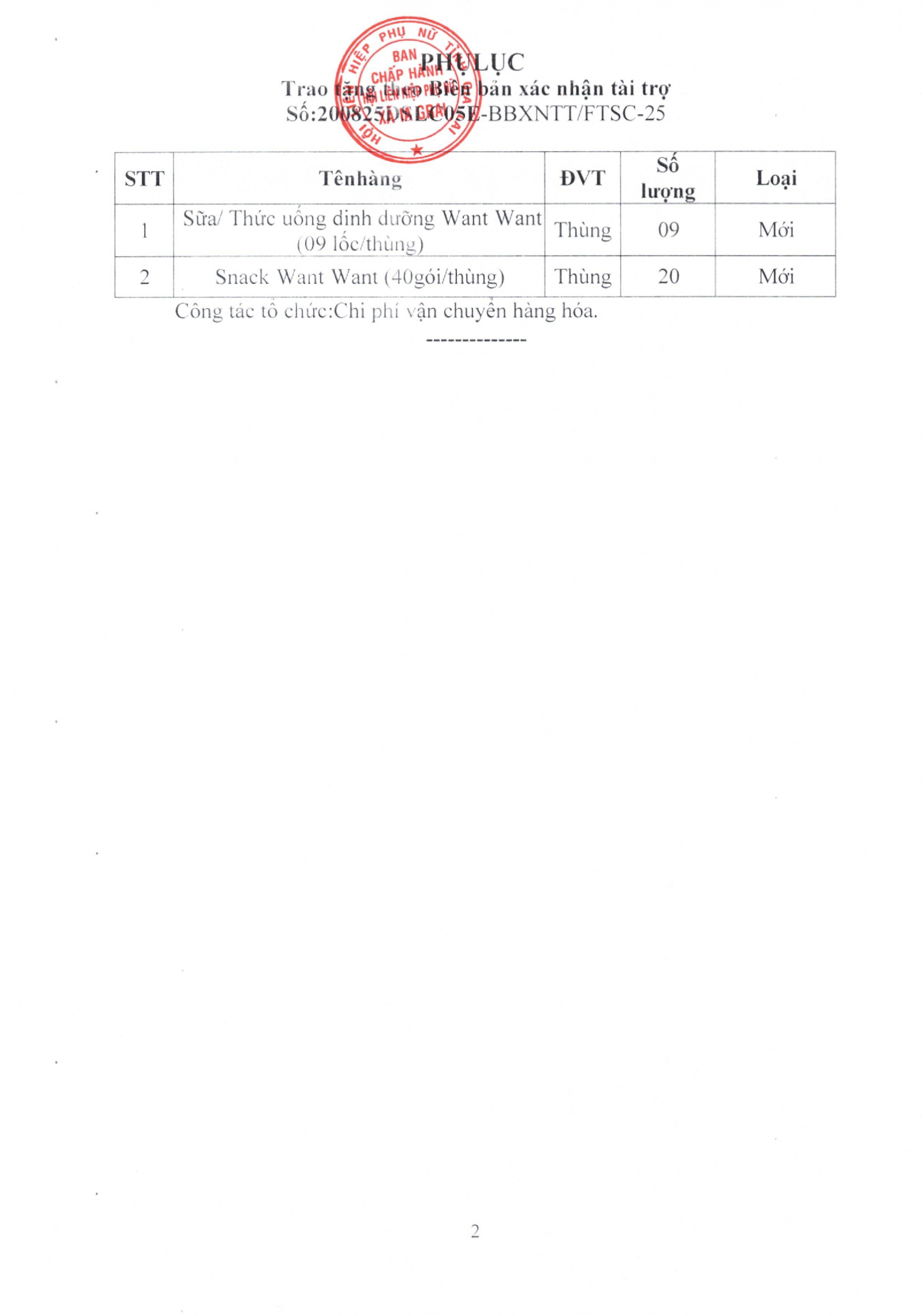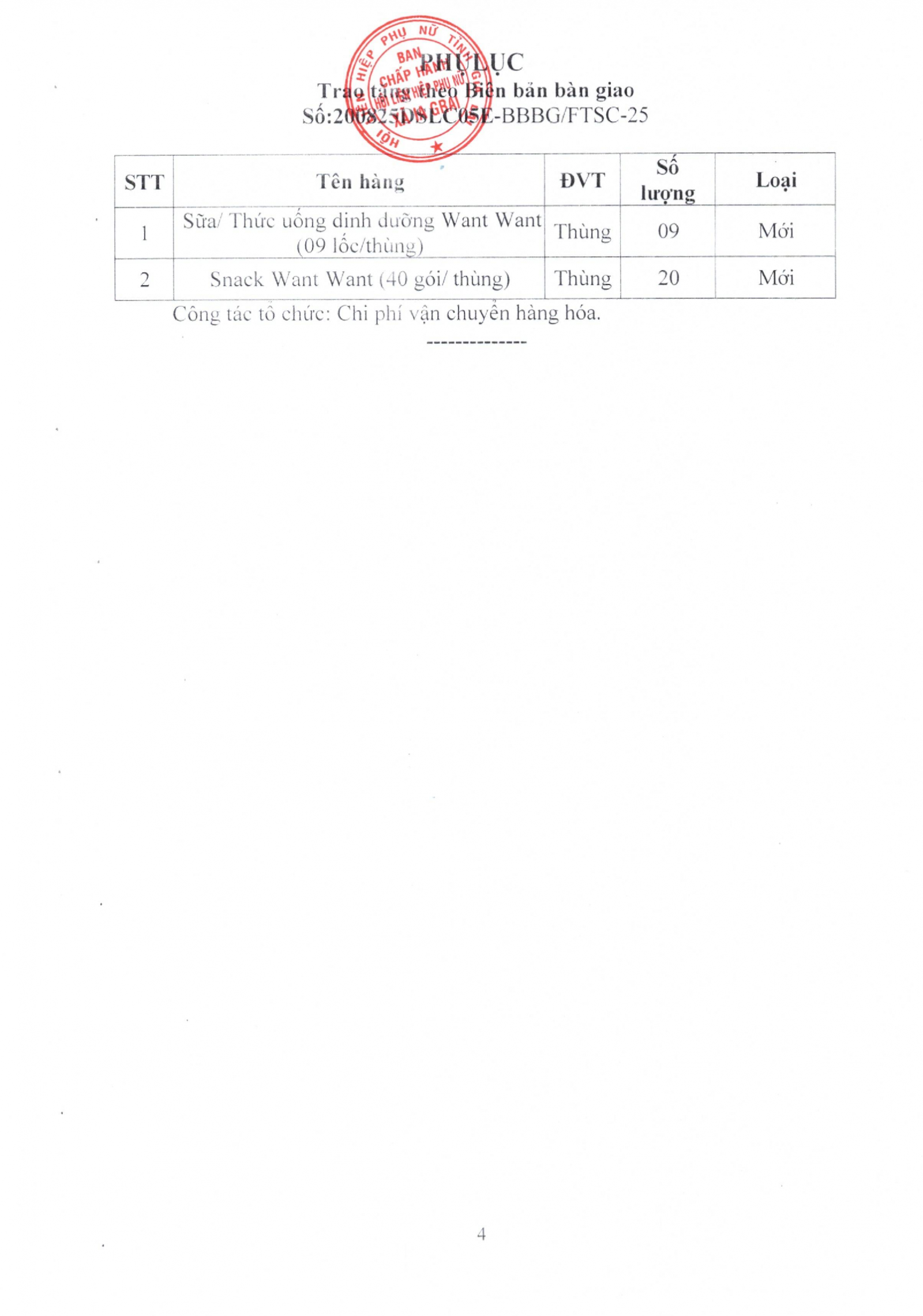Biên bản bàn giao hàng hóa tài trợ cho Cơ sở bảo trợ và nuôi dưỡng trẻ mồ côi Long Hoa, số 1250/41 Huỳnh Tấn Phát, phường Tân Mỹ, TP. Hồ Chí Minh