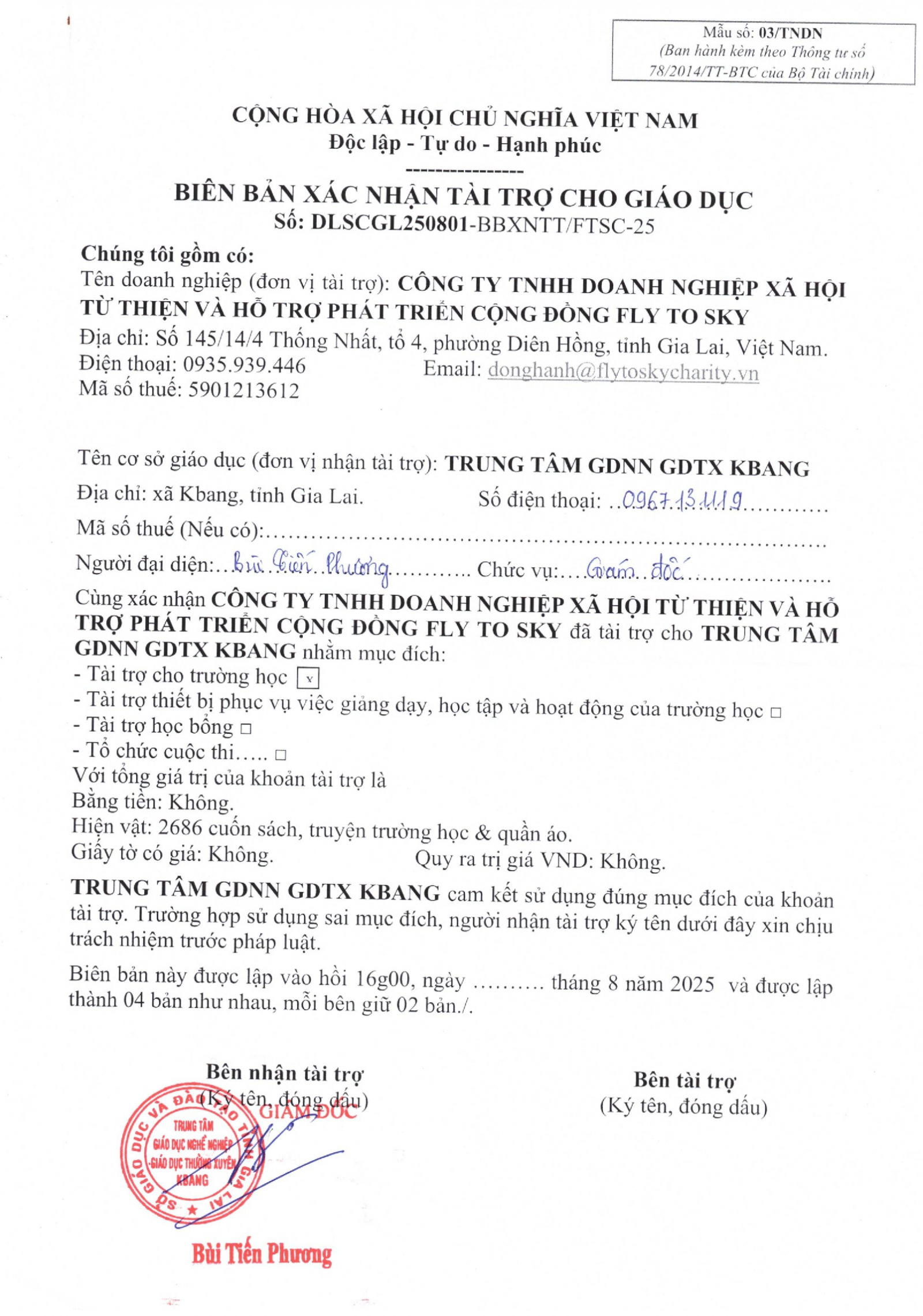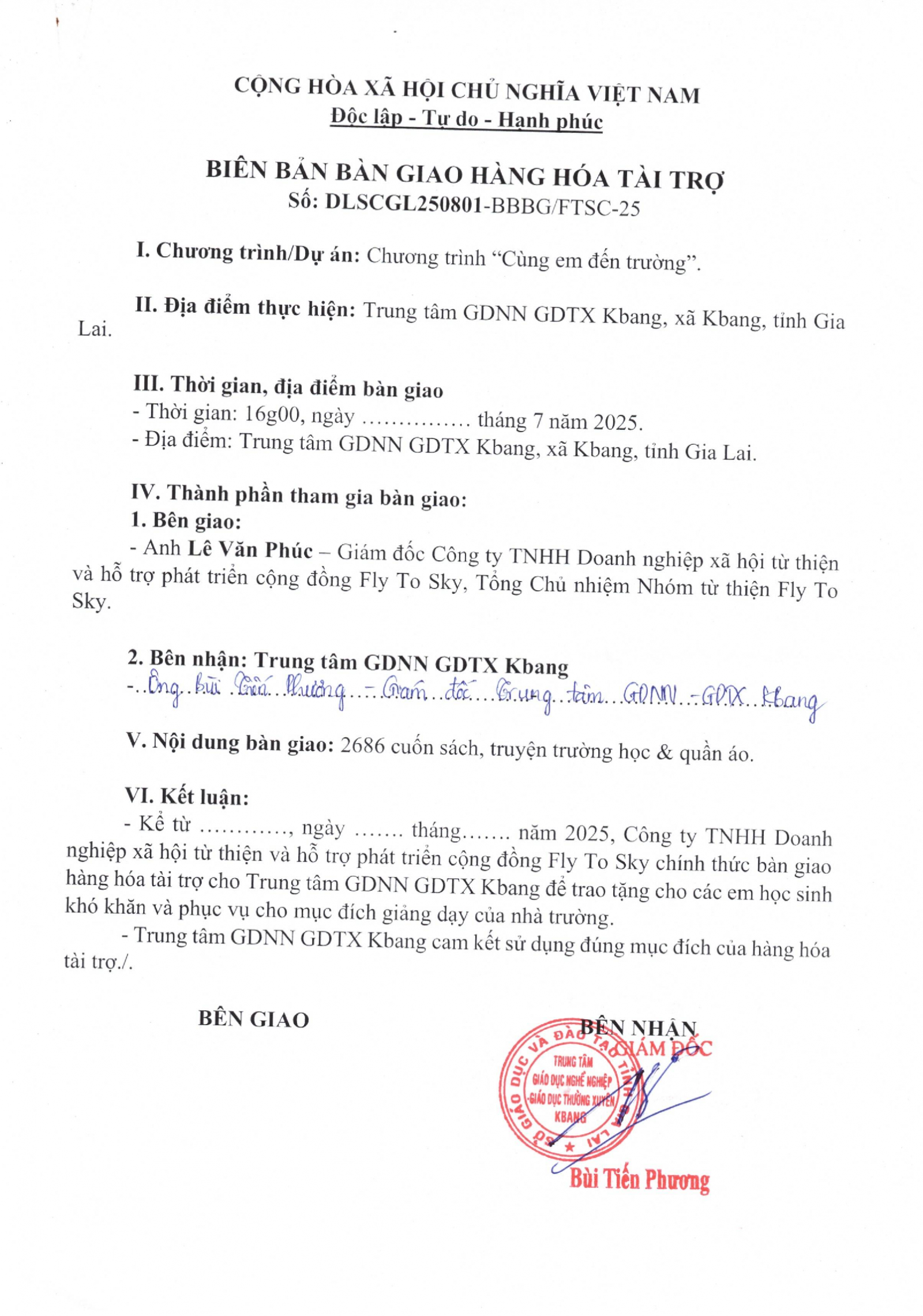 Biên bản xác nhận tài trợ và Biên bản bàn giao hàng hóa tài trợ cho Trung tâm GDNN GDTX KBang, xã KBang, tỉnh Gia Lai
