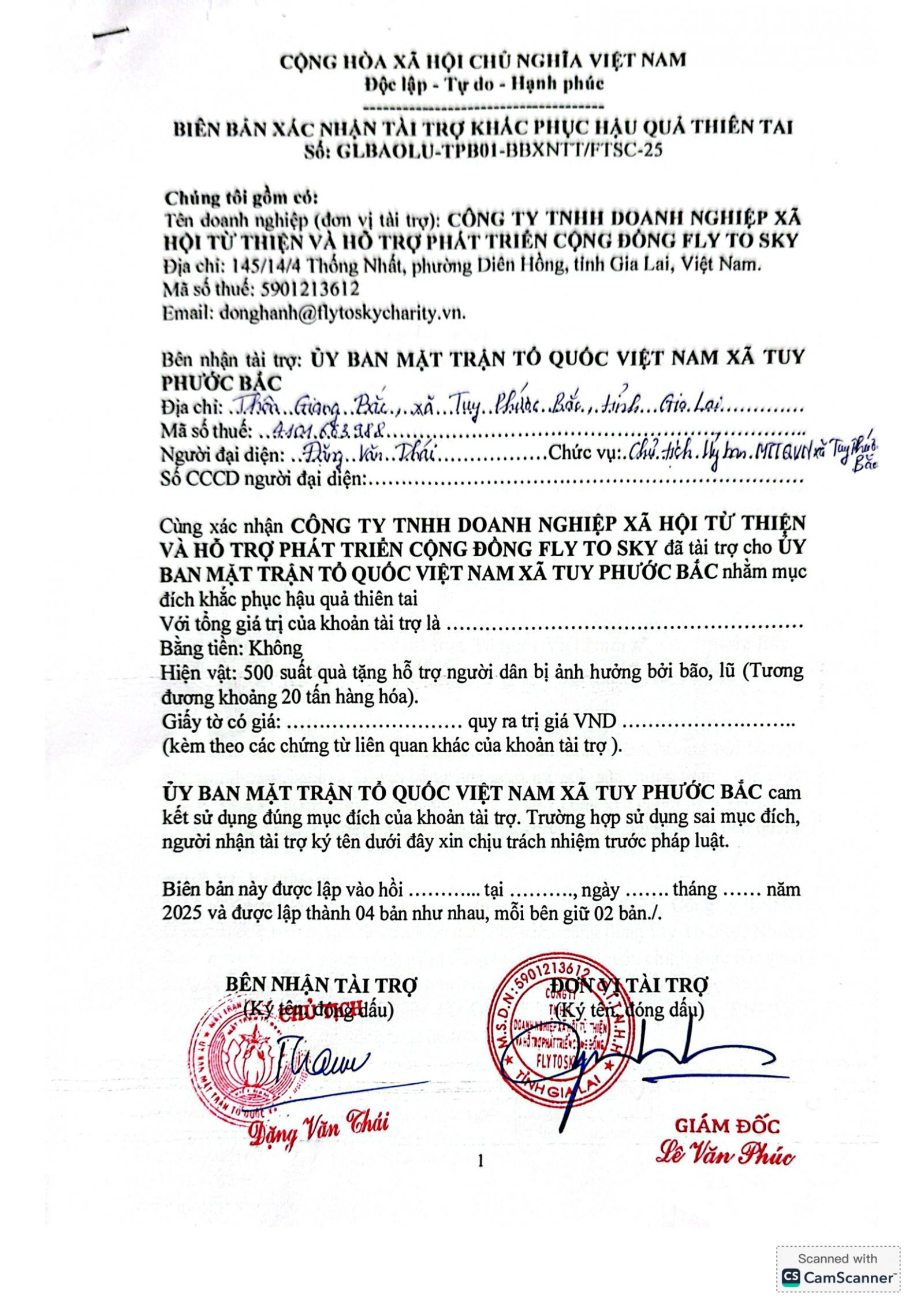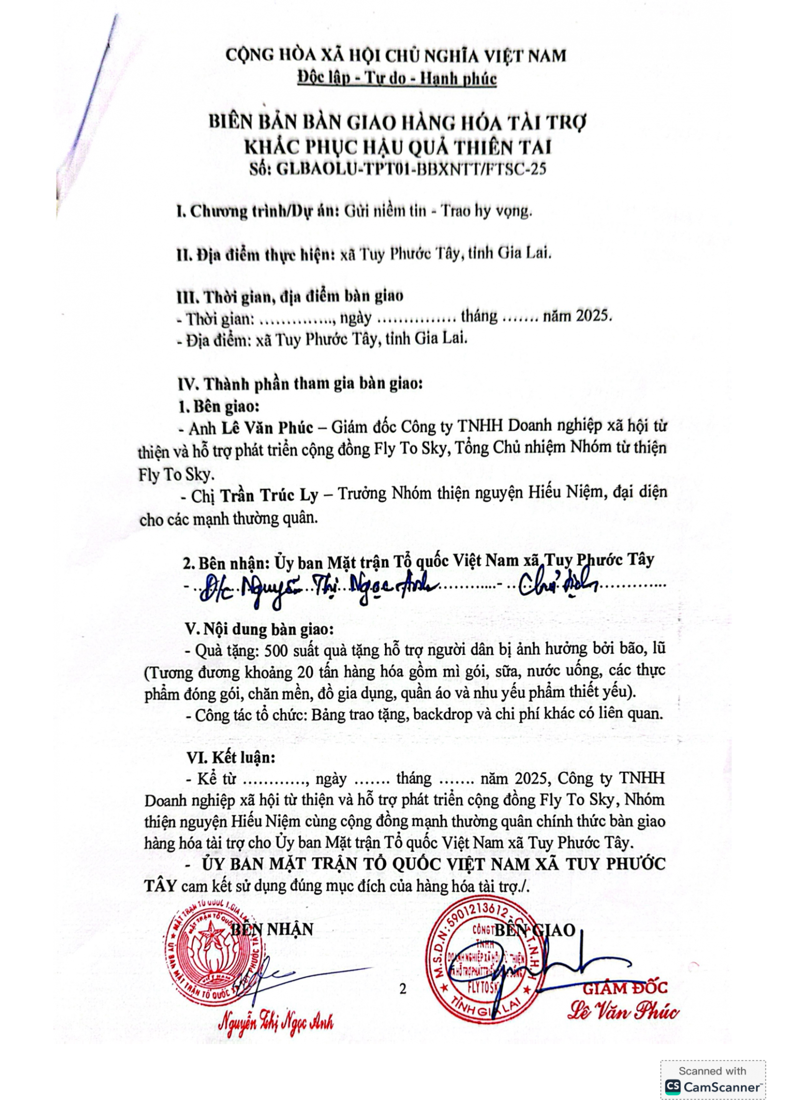 Biên bản xác nhận tài trợ và biên bản bàn giao tài trợ cho Trường Tiểu học Số 2 Phước Sơn, Xóm 12 - Lộc Thượng, Xã Tuy Phước Đông, tỉnh Gia Lai