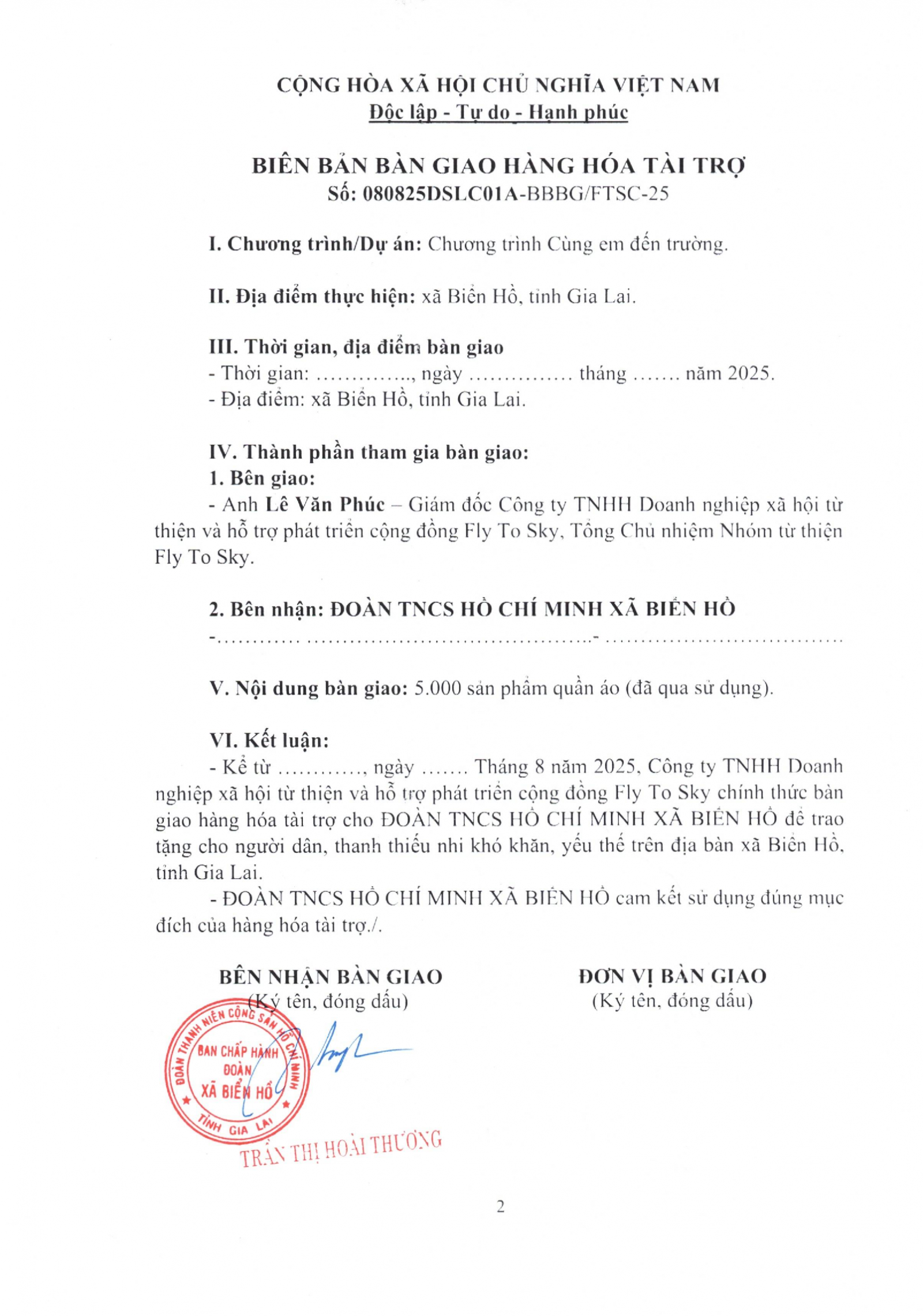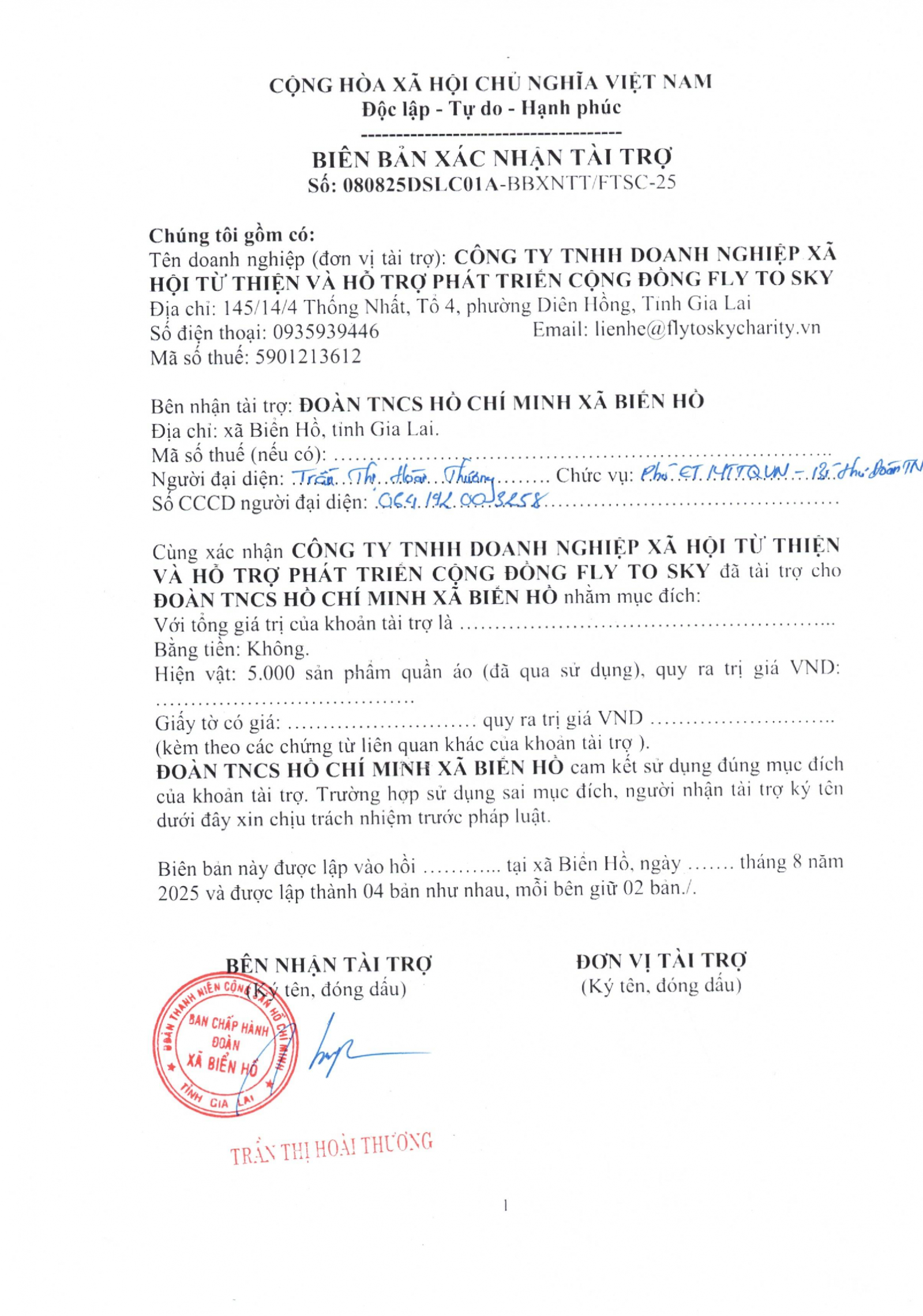 Biên bản xác nhận tài trợ và Biên bản bàn giao tài trợ cho Đoàn TNCS Hồ Chí Minh xã Biển Hồ