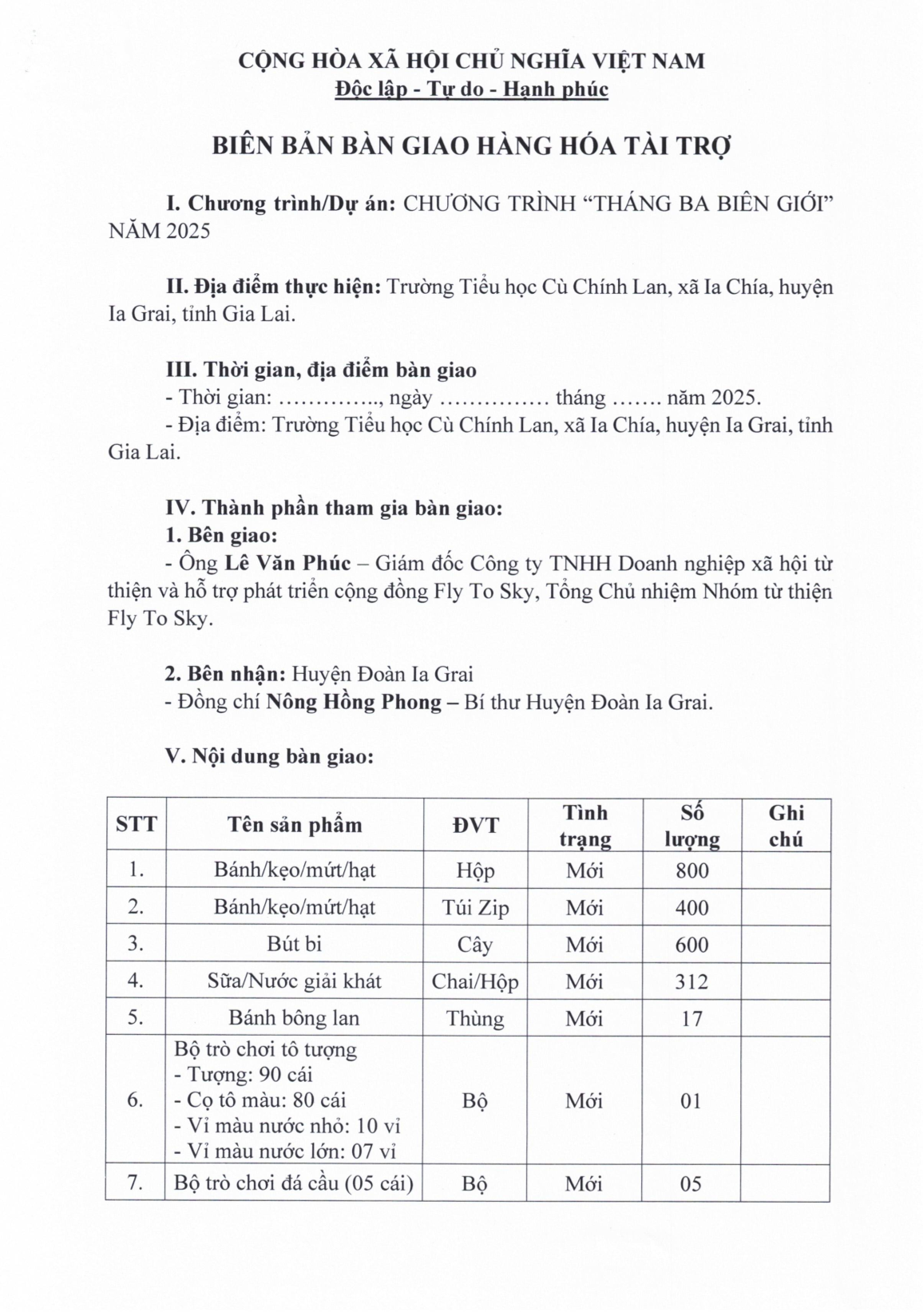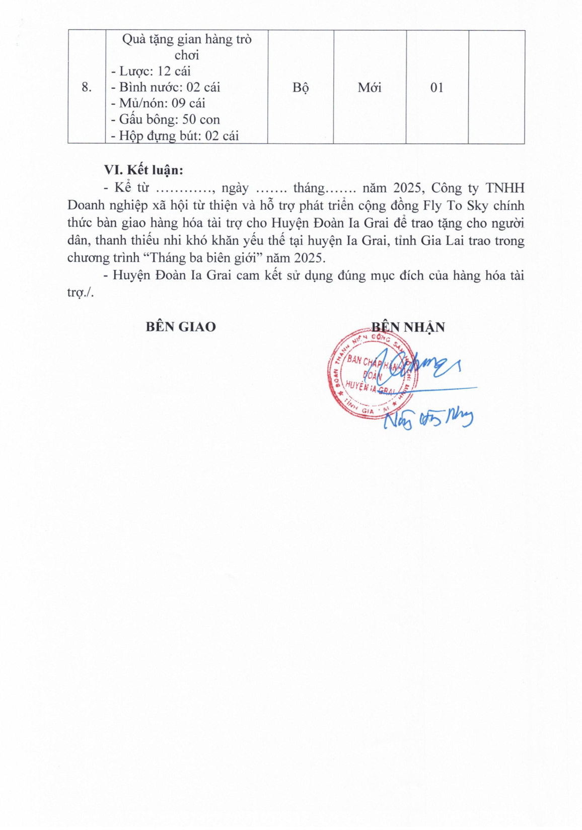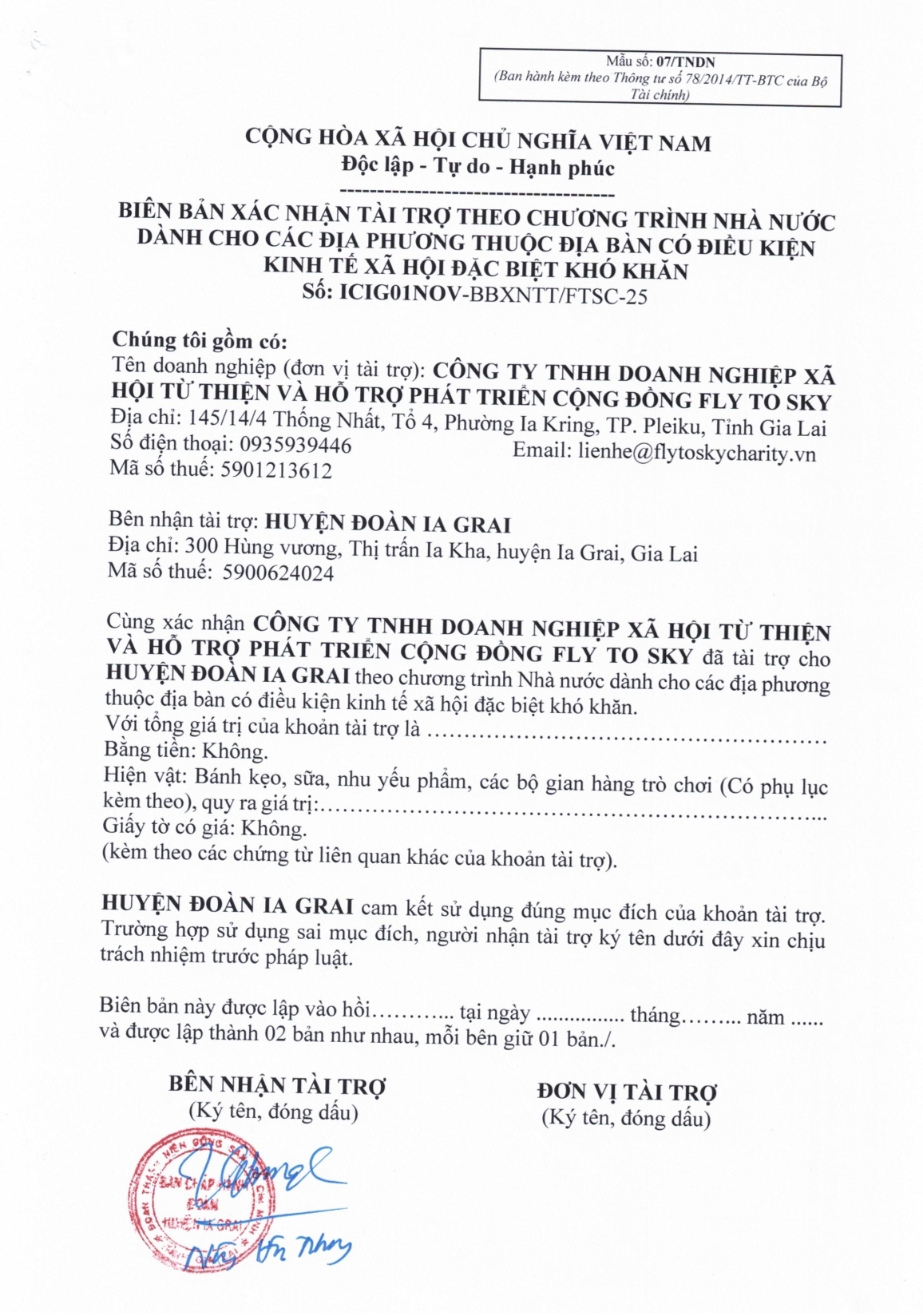 Biên bản xác nhận tài trợ và Biên bản bàn giao tài trợ cho Huyện Đoàn Ia Grai, 300 Hùng Vương, Thị trấn Ia Kha, Huyện Ia Grai, tỉnh Gia Lai