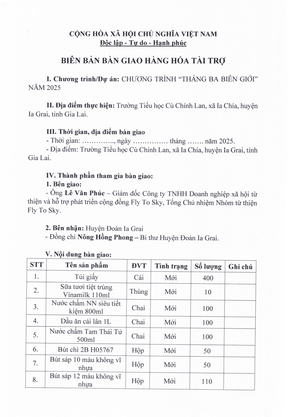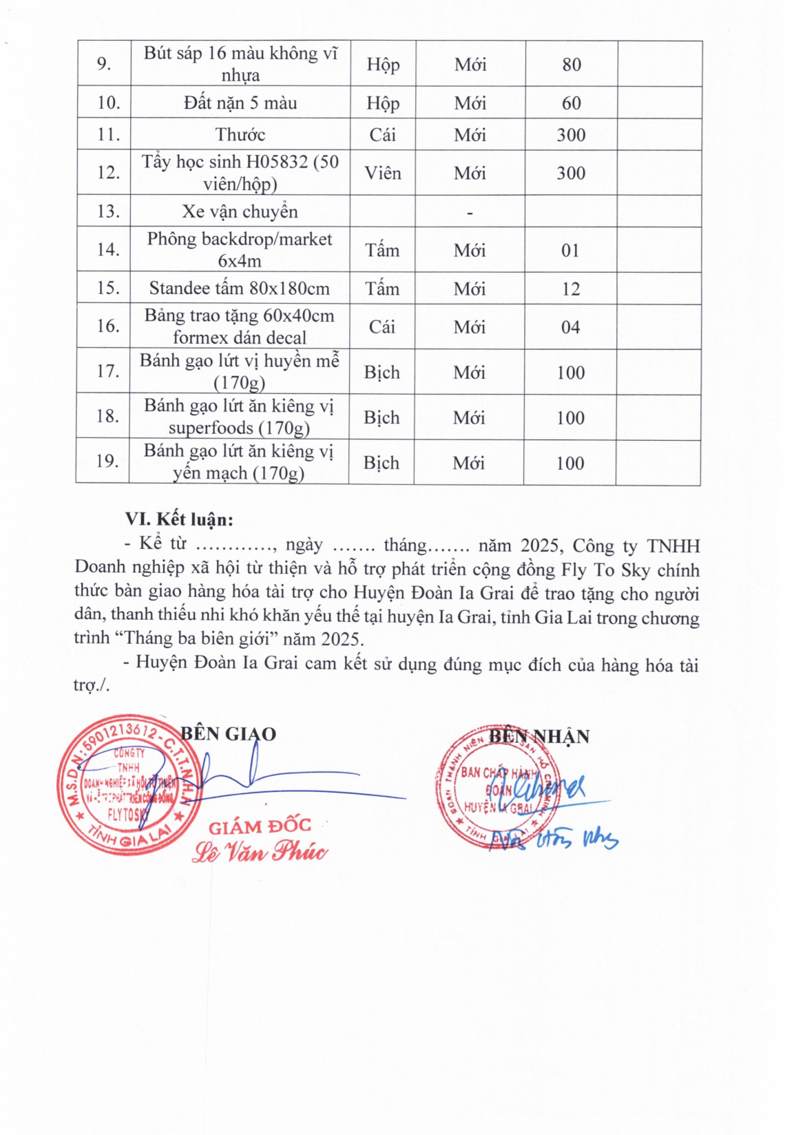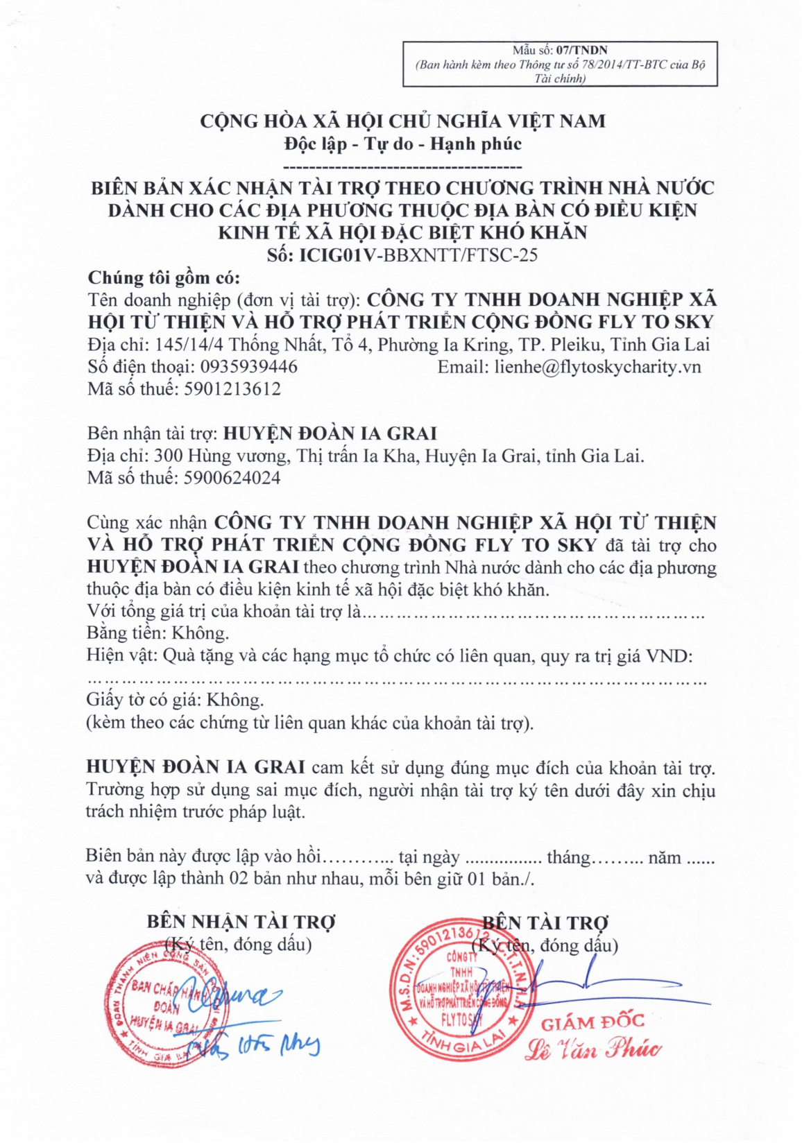 Biên bản xác nhận tài trợ và Biên bản bàn giao tài trợ cho Huyện Đoàn Ia Grai, 300 Hùng Vương, Thị trấn Ia Kha, Huyện Ia Grai, tỉnh Gia Lai