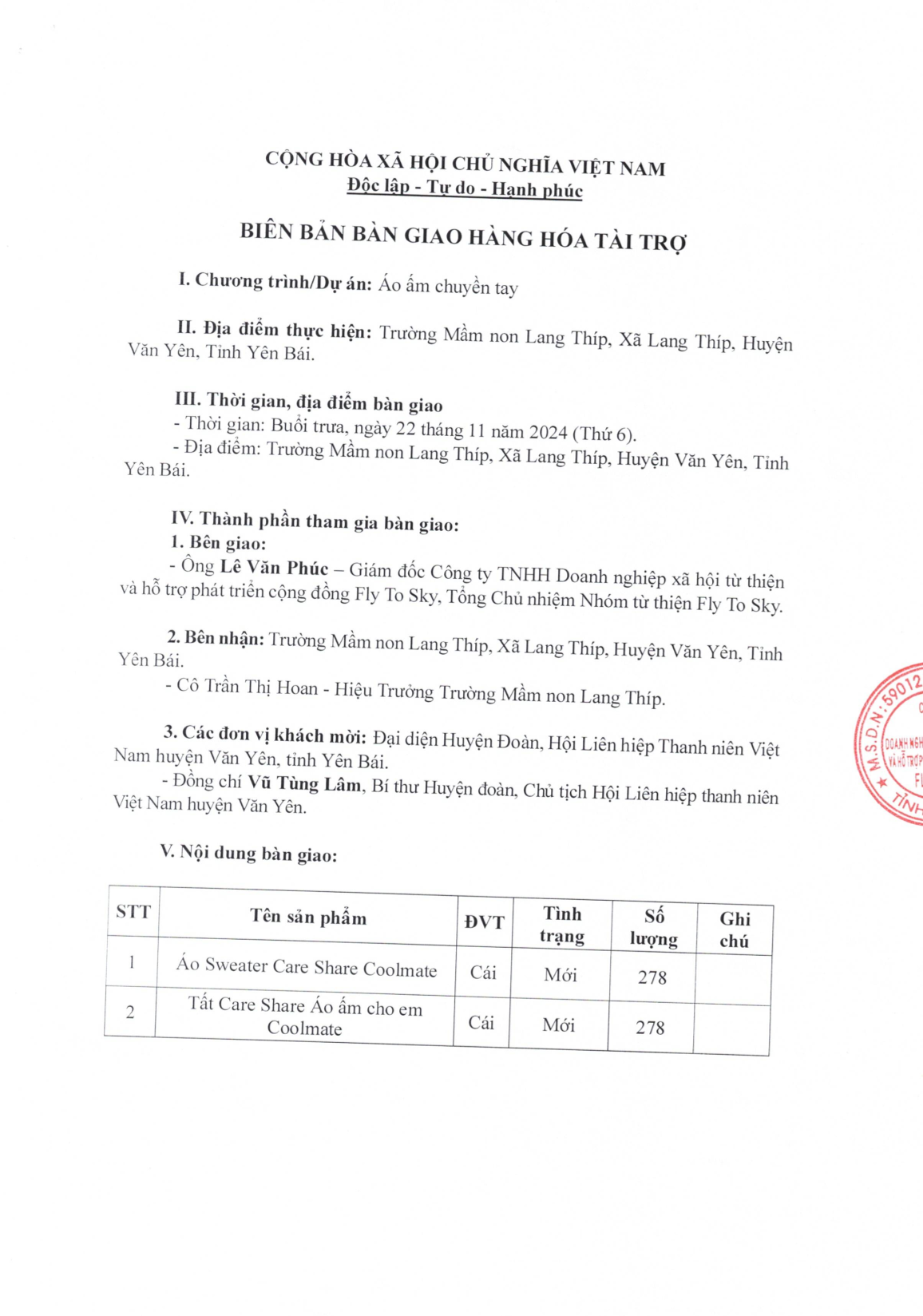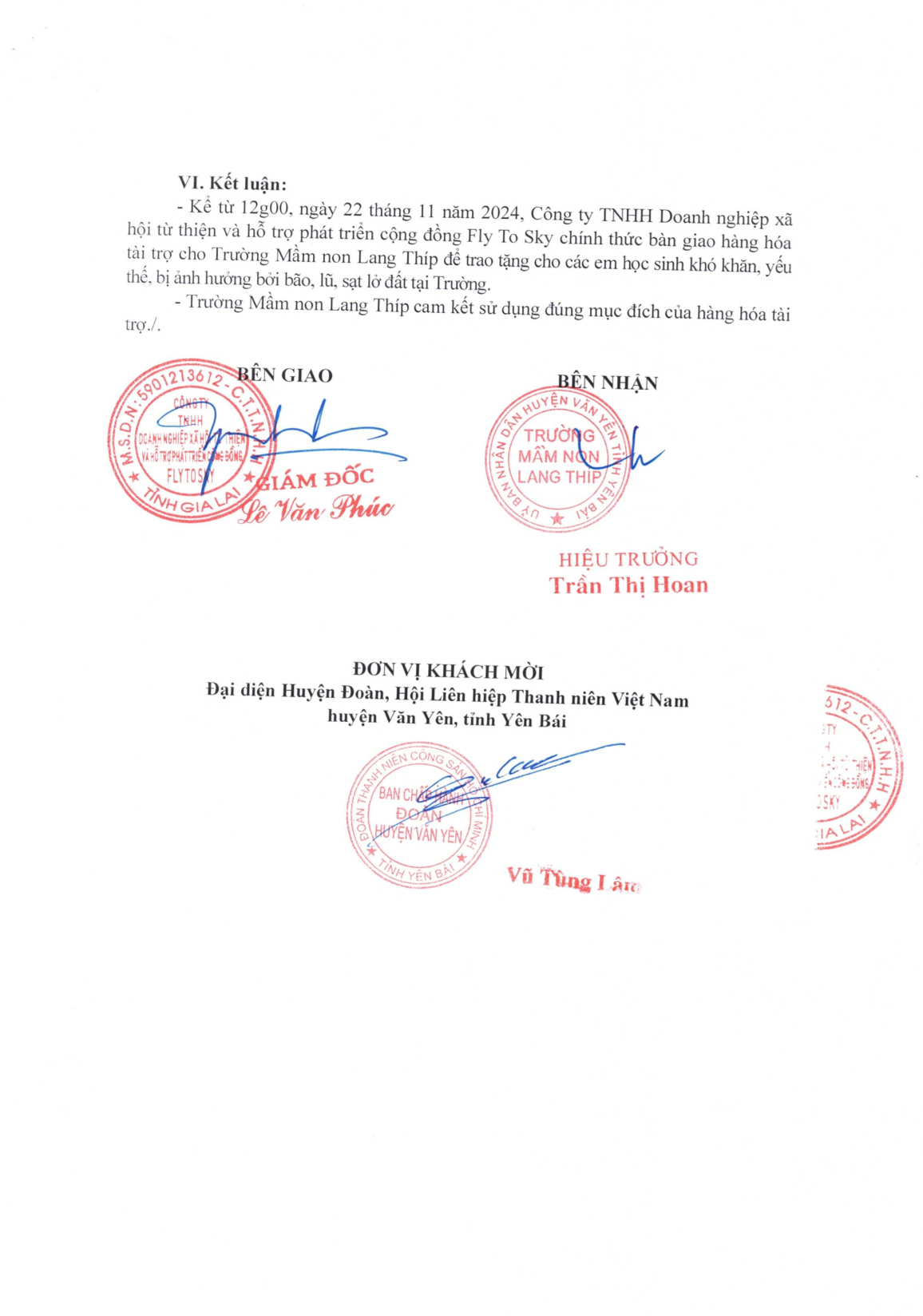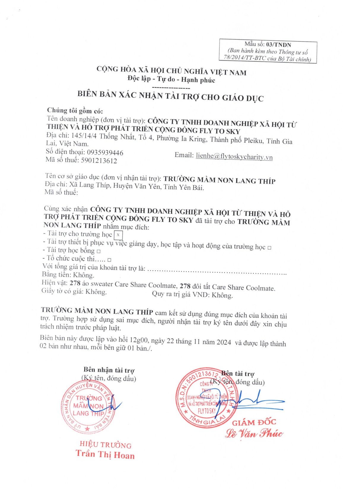 Biên bản xác nhận tài trợ và biên bản bàn giao tài trợ cho Trường Mầm non Lang Thíp, xã Lang Thíp, huyện Văn Yên, tỉnh Yên Bái