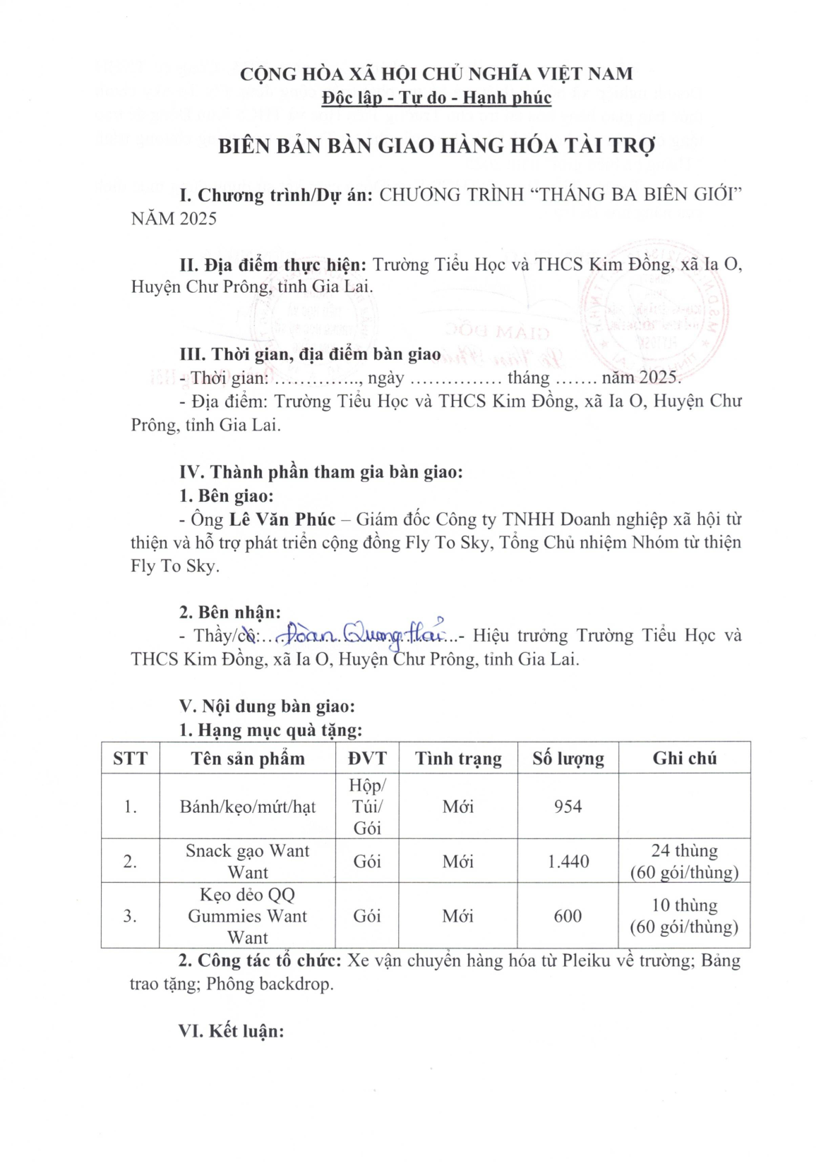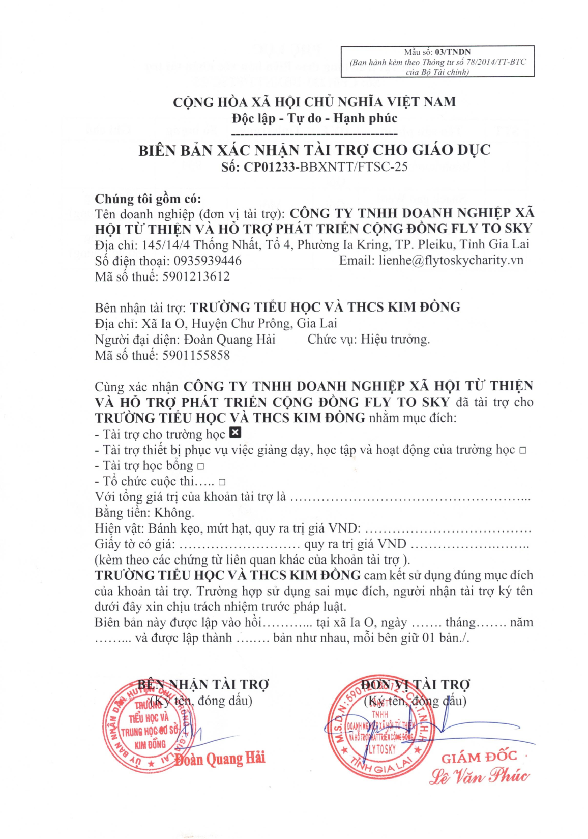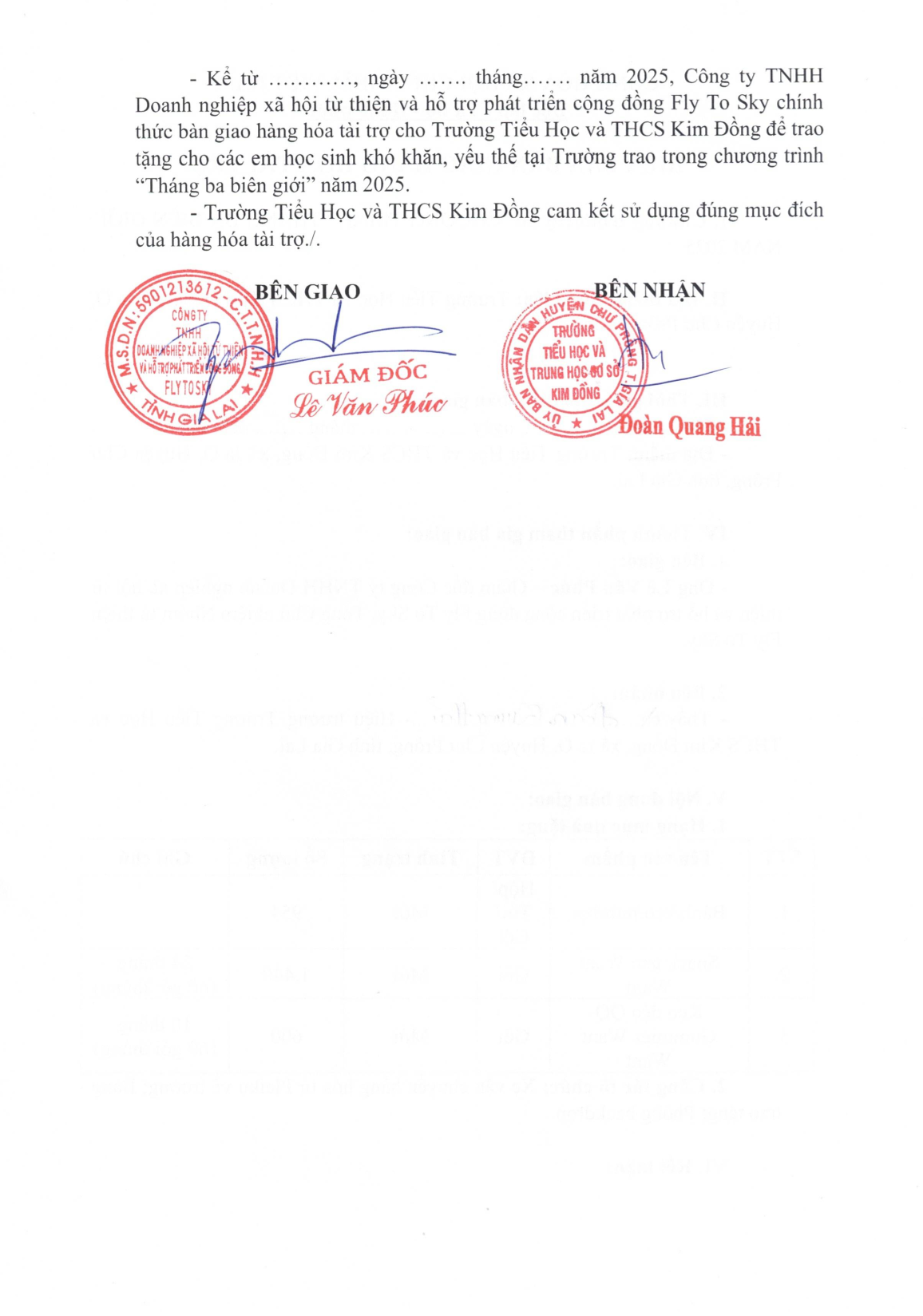 Biên bản xác nhận tài trợ và Biên bản bàn giao tài trợ cho Trường TH và THCS Kim Đồng xã Ia O, huyện Chư Prông, Gia Lai