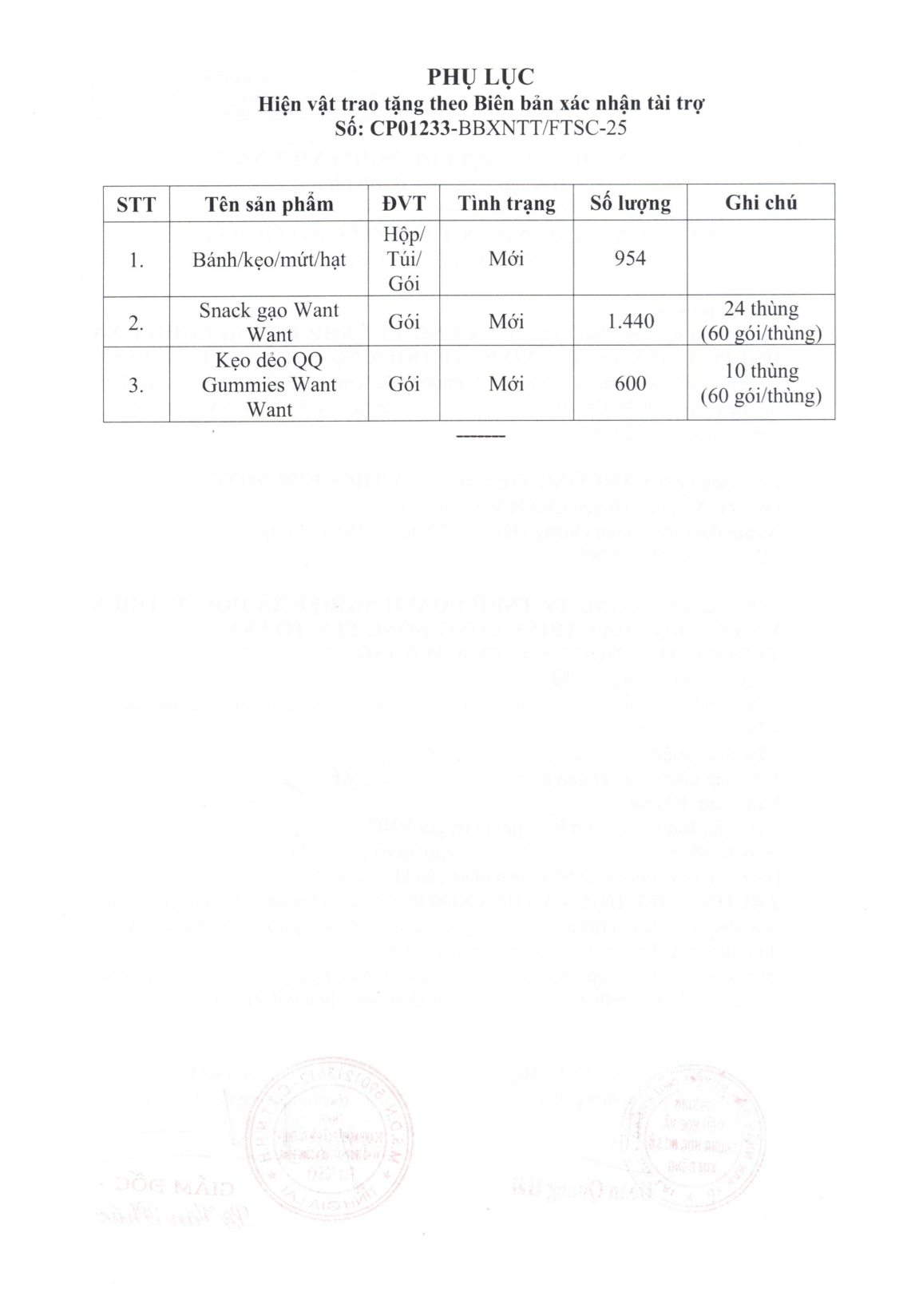 Biên bản bàn giao hàng hóa tài trợ cho Cơ sở bảo trợ và nuôi dưỡng trẻ mồ côi Long Hoa, số 1250/41 Huỳnh Tấn Phát, phường Tân Mỹ, TP. Hồ Chí Minh