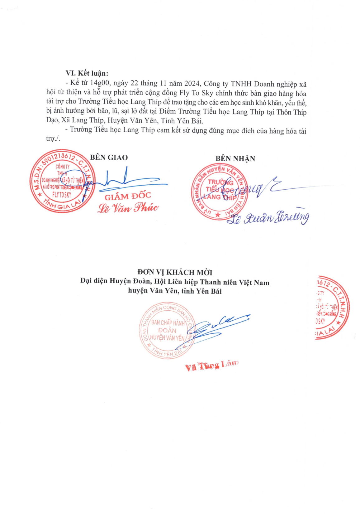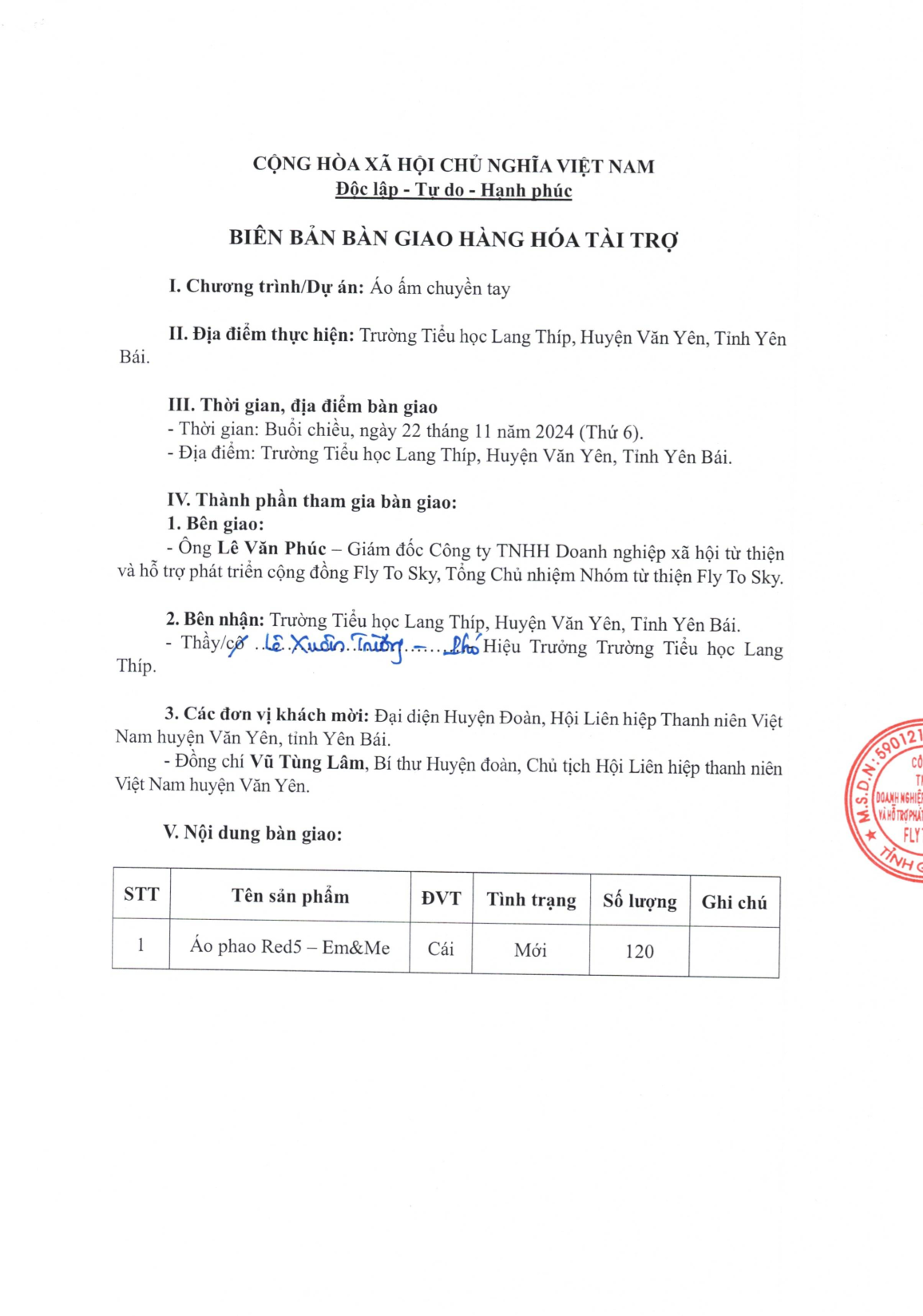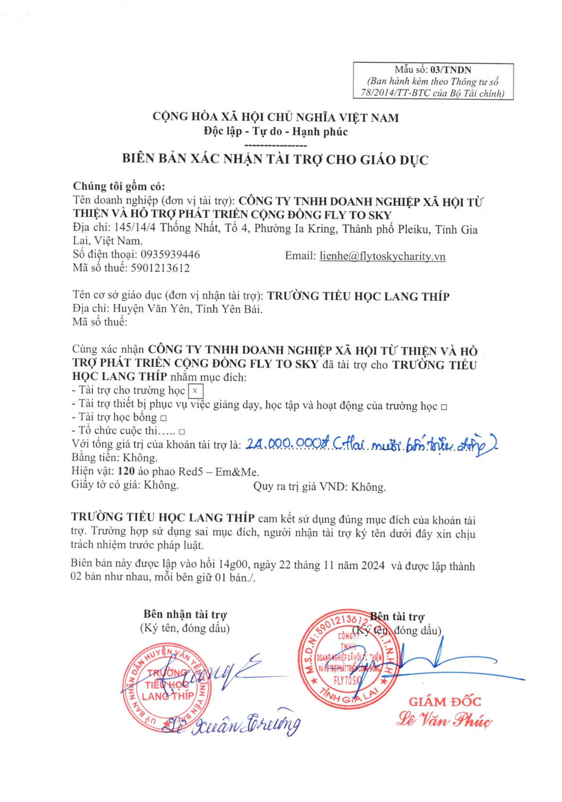 Biên bản xác nhận tài trợ và biên bản bàn giao tài trợ cho Trường Tiểu học Lang Thíp, huyện Văn Yên, tỉnh Yên Bái