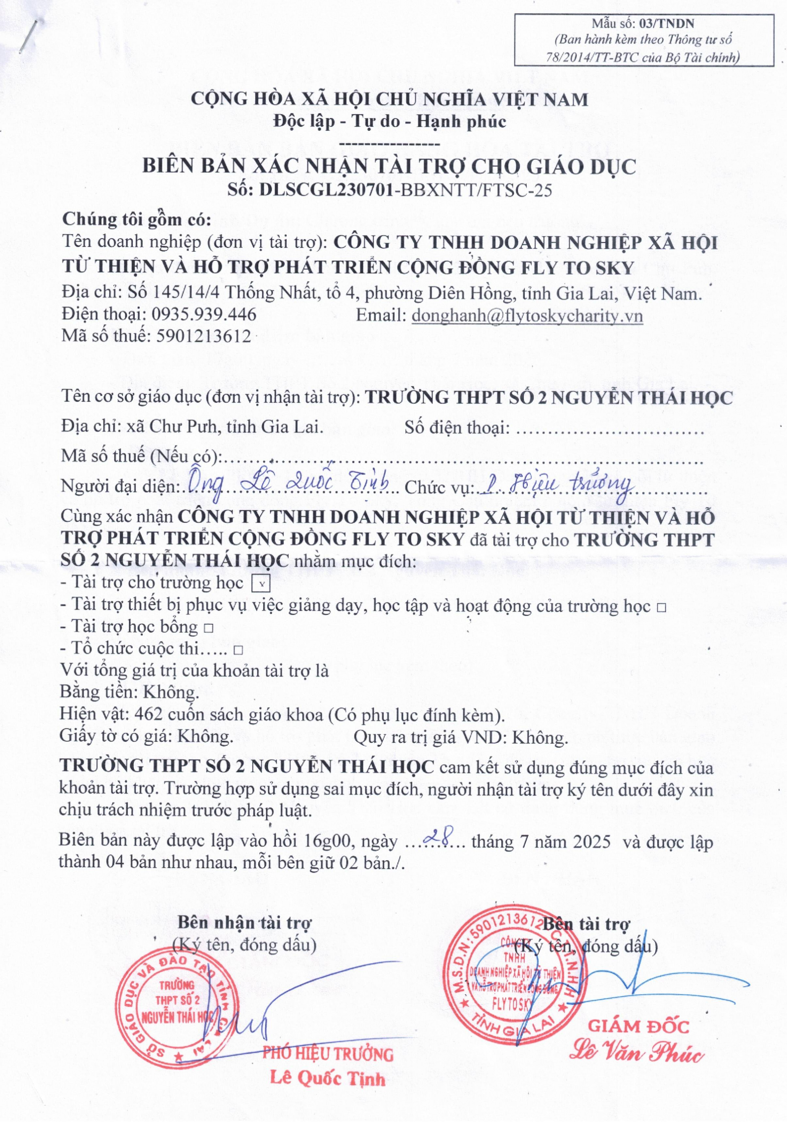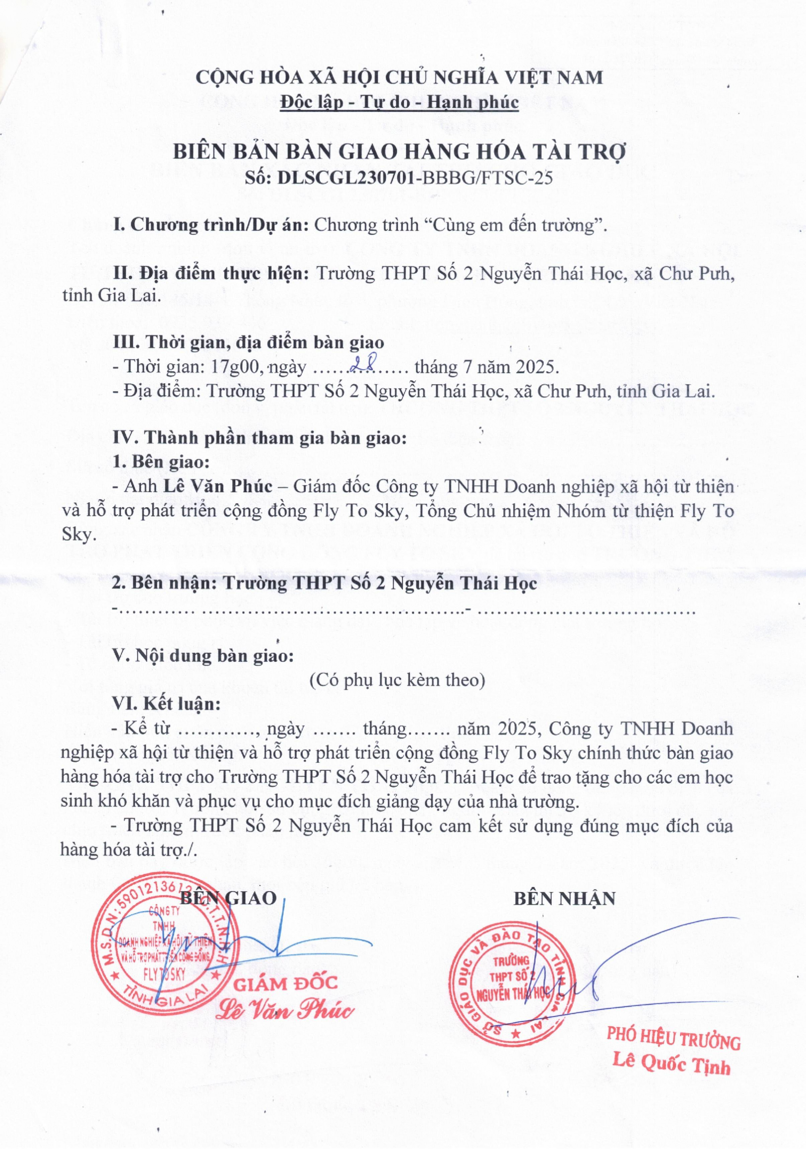 Biên bản xác nhận và Biên bản bàn giao tài trợ cho Trường THPT số 2 Nguyễn Thái Học, xã Chư Pưh, tỉnh Gia Lai