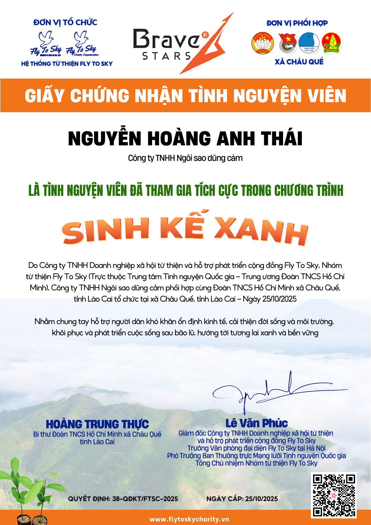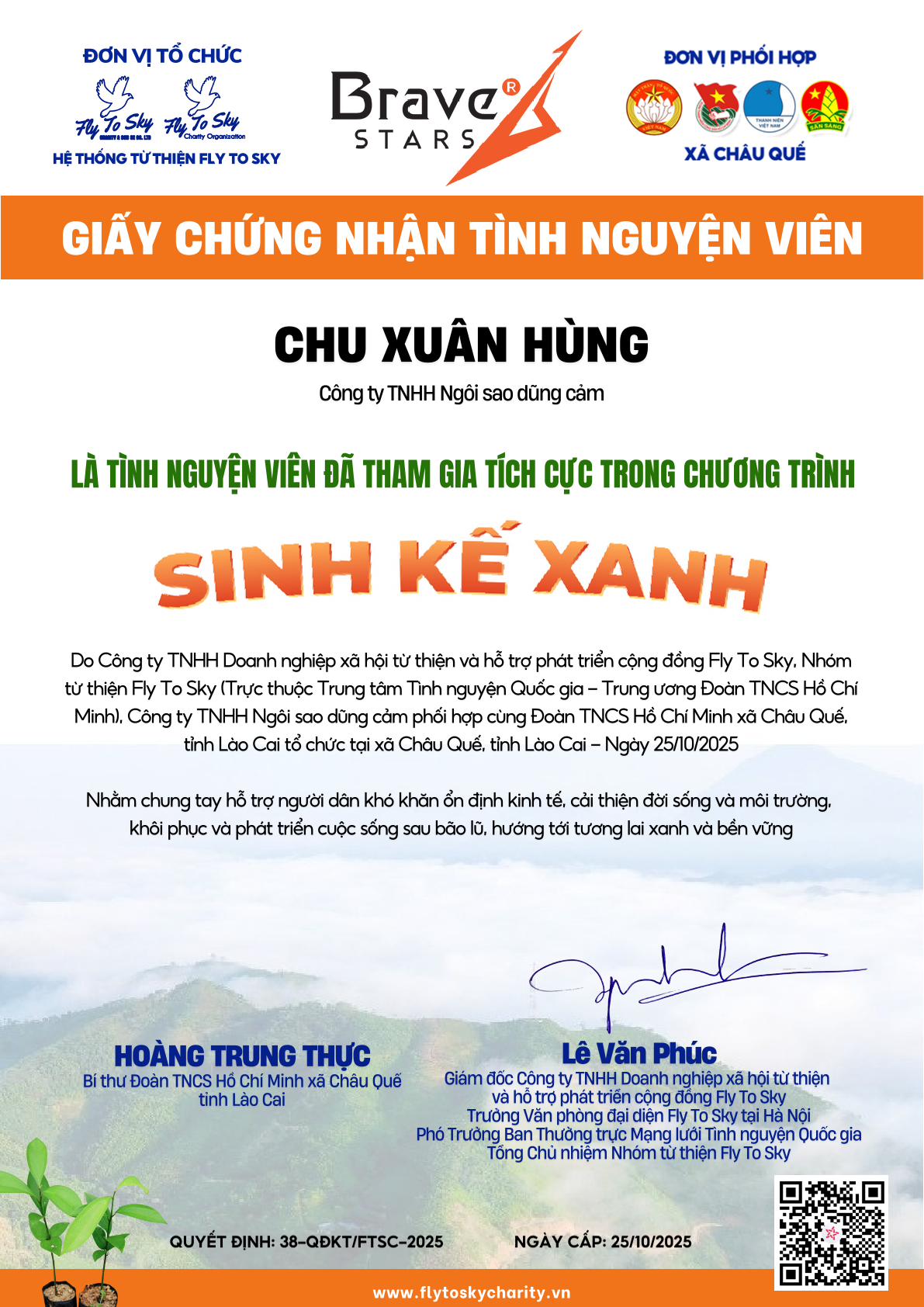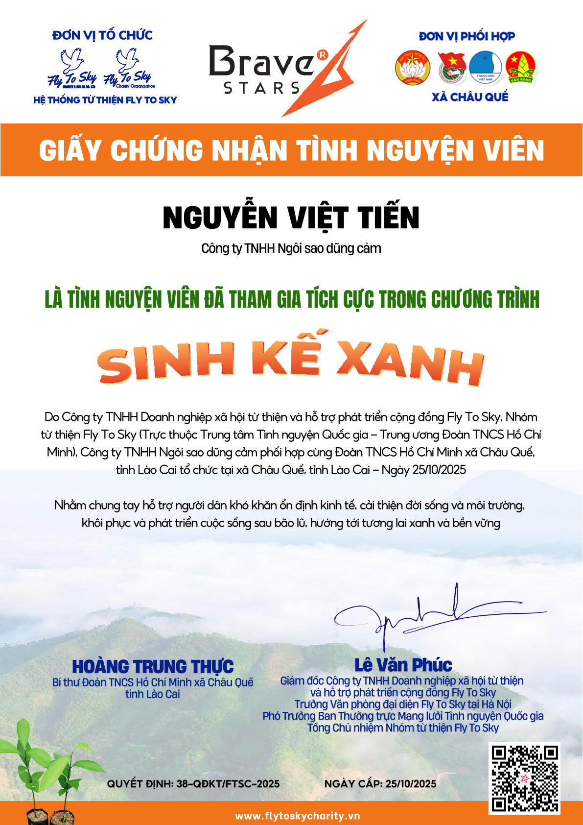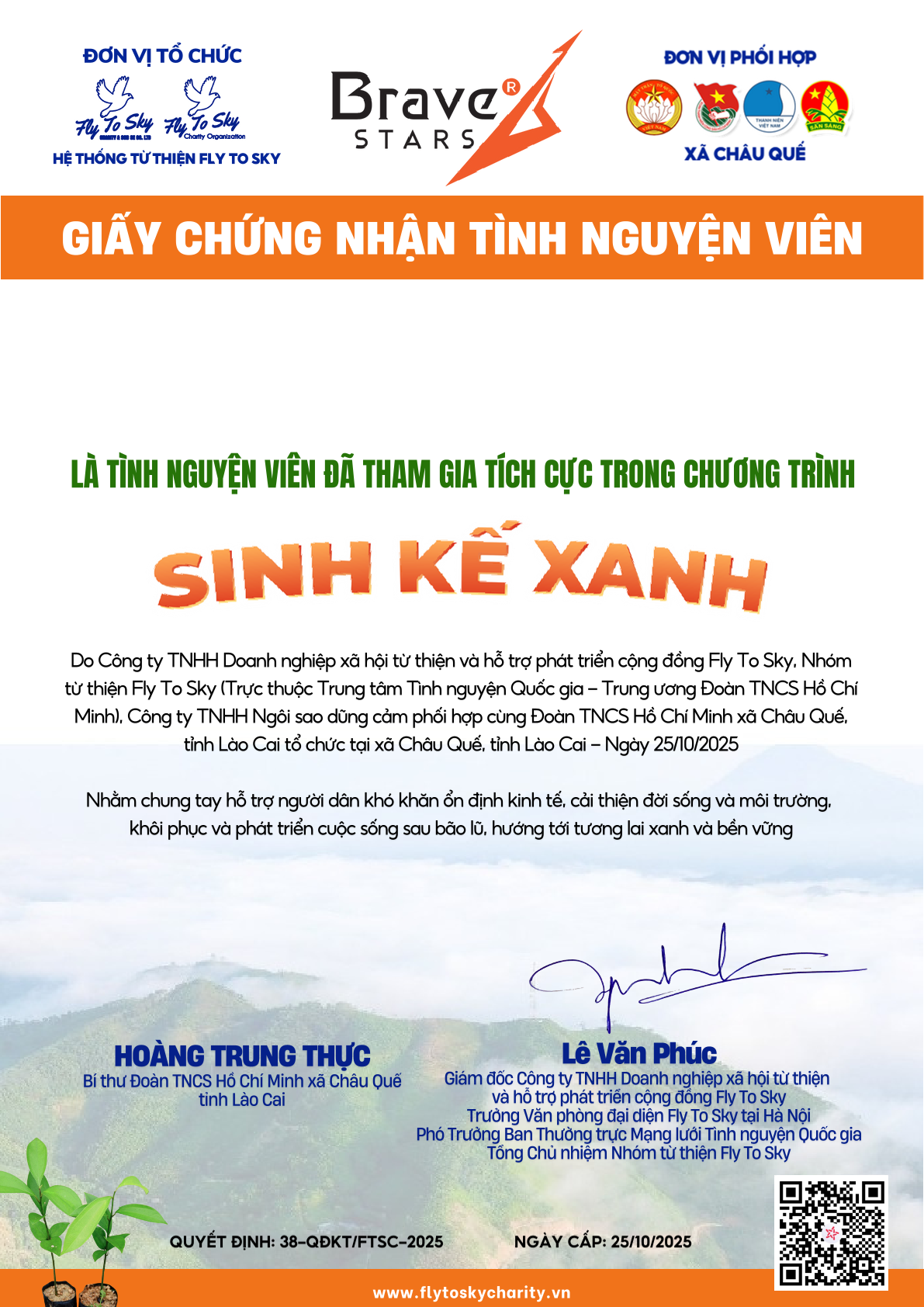 Giấy chứng nhận tình nguyện viên đã tham gia tích cực trong chương trình SINH KẾ XANH tại xã Châu Quế, tỉnh Lào Cai