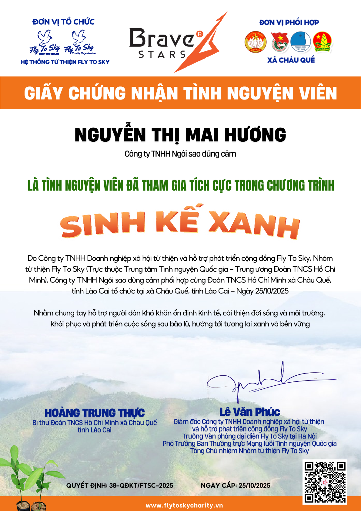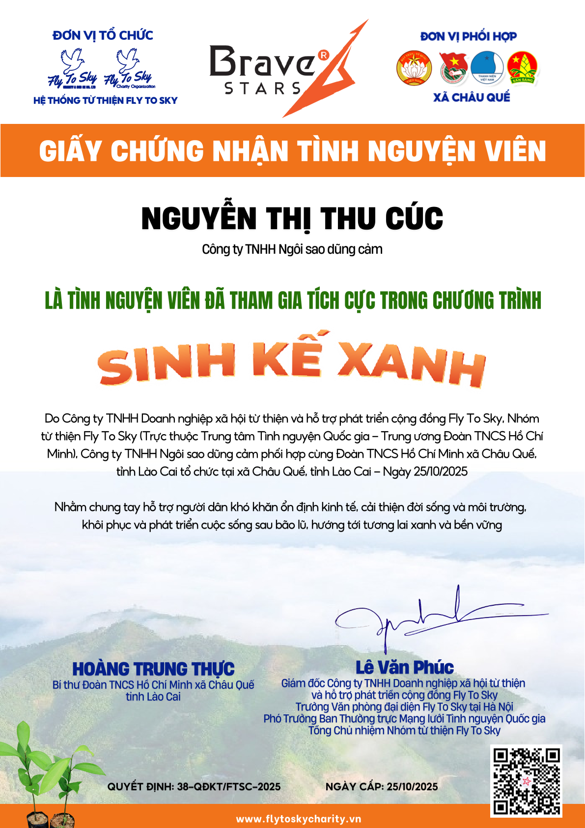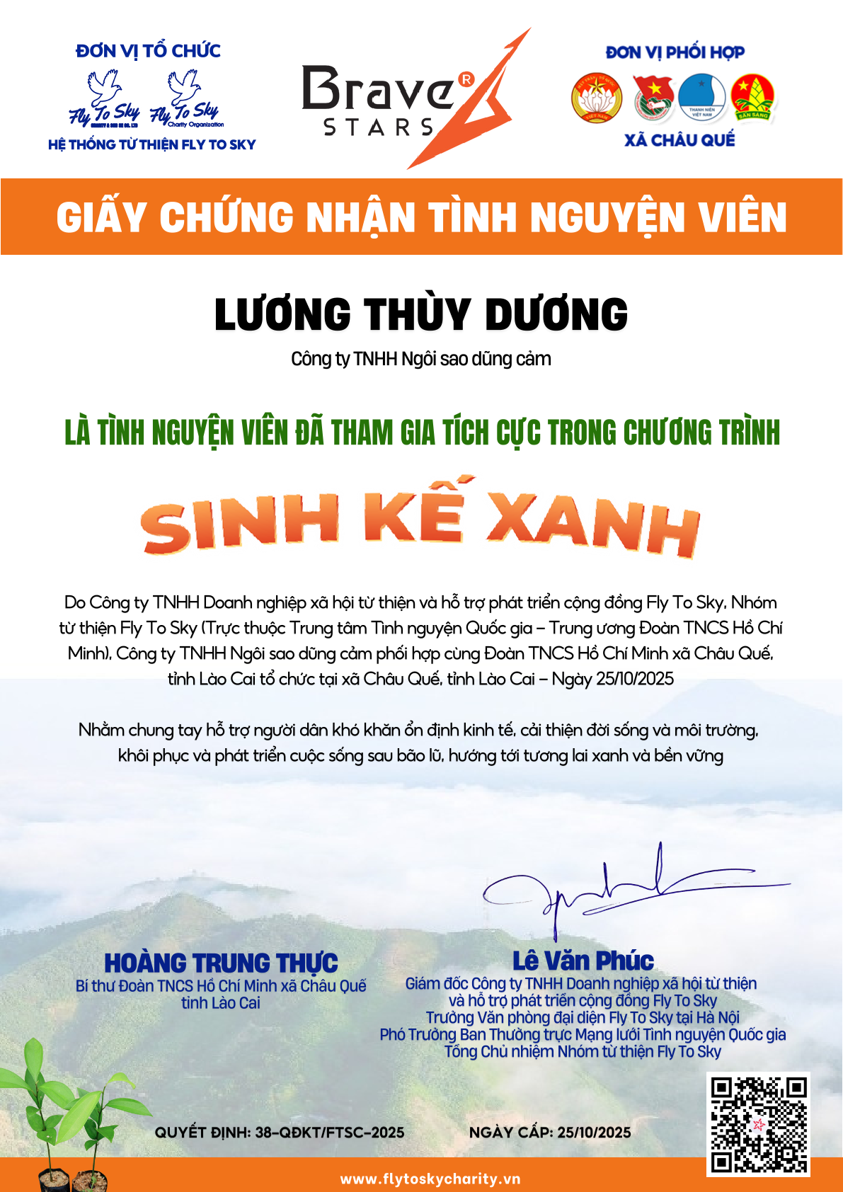 Giấy chứng nhận tình nguyện viên đã tham gia tích cực trong chương trình SINH KẾ XANH tại xã Châu Quế, tỉnh Lào Cai