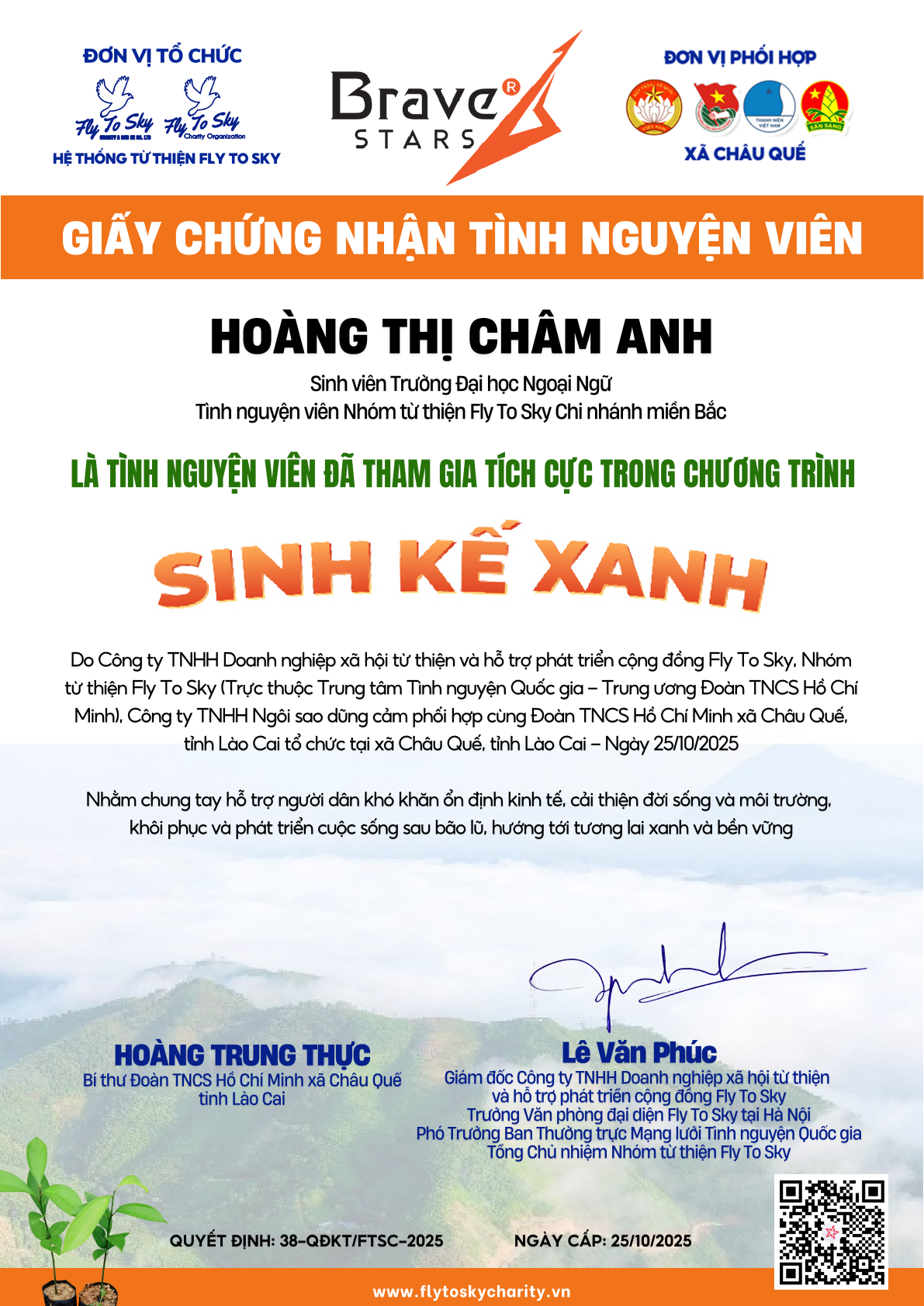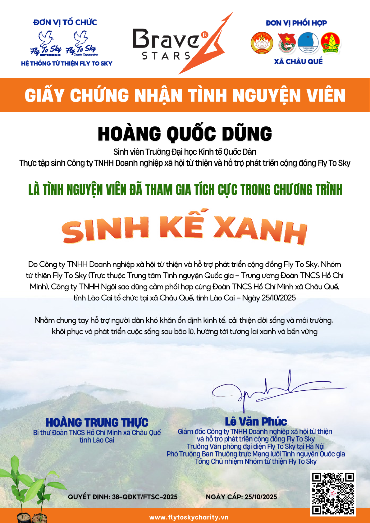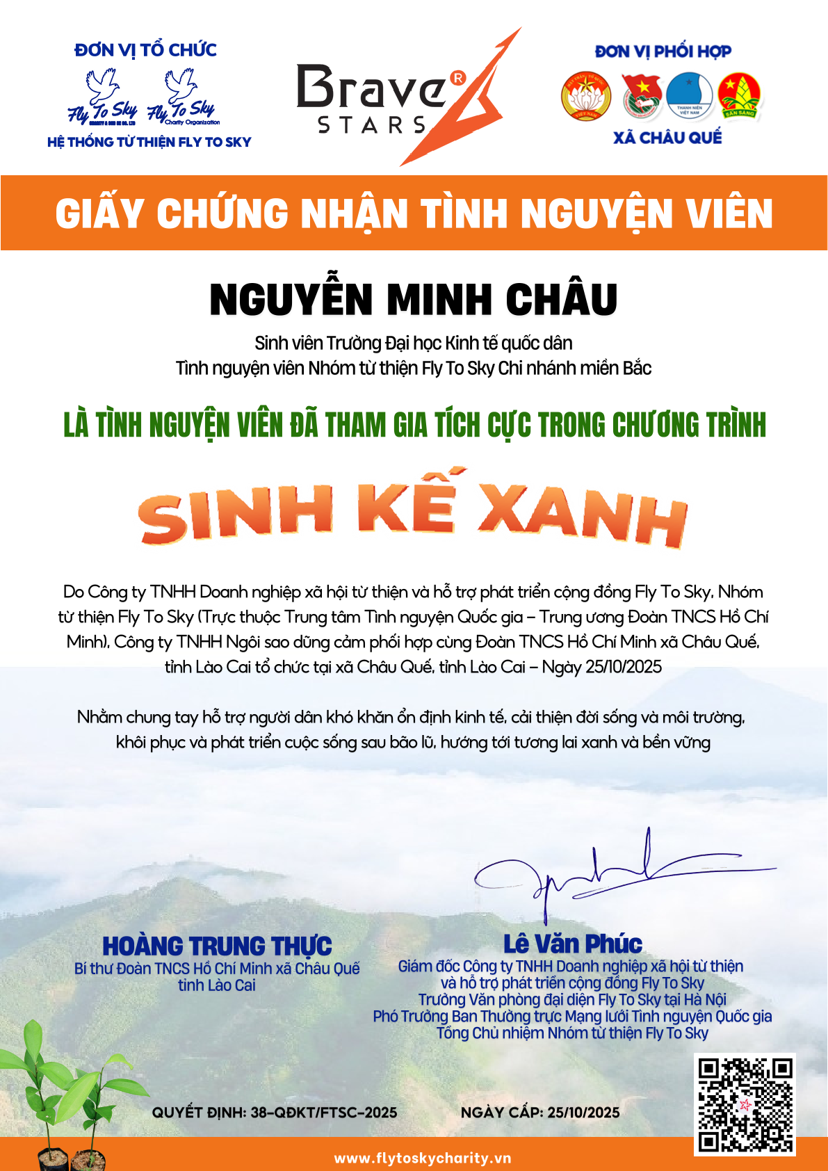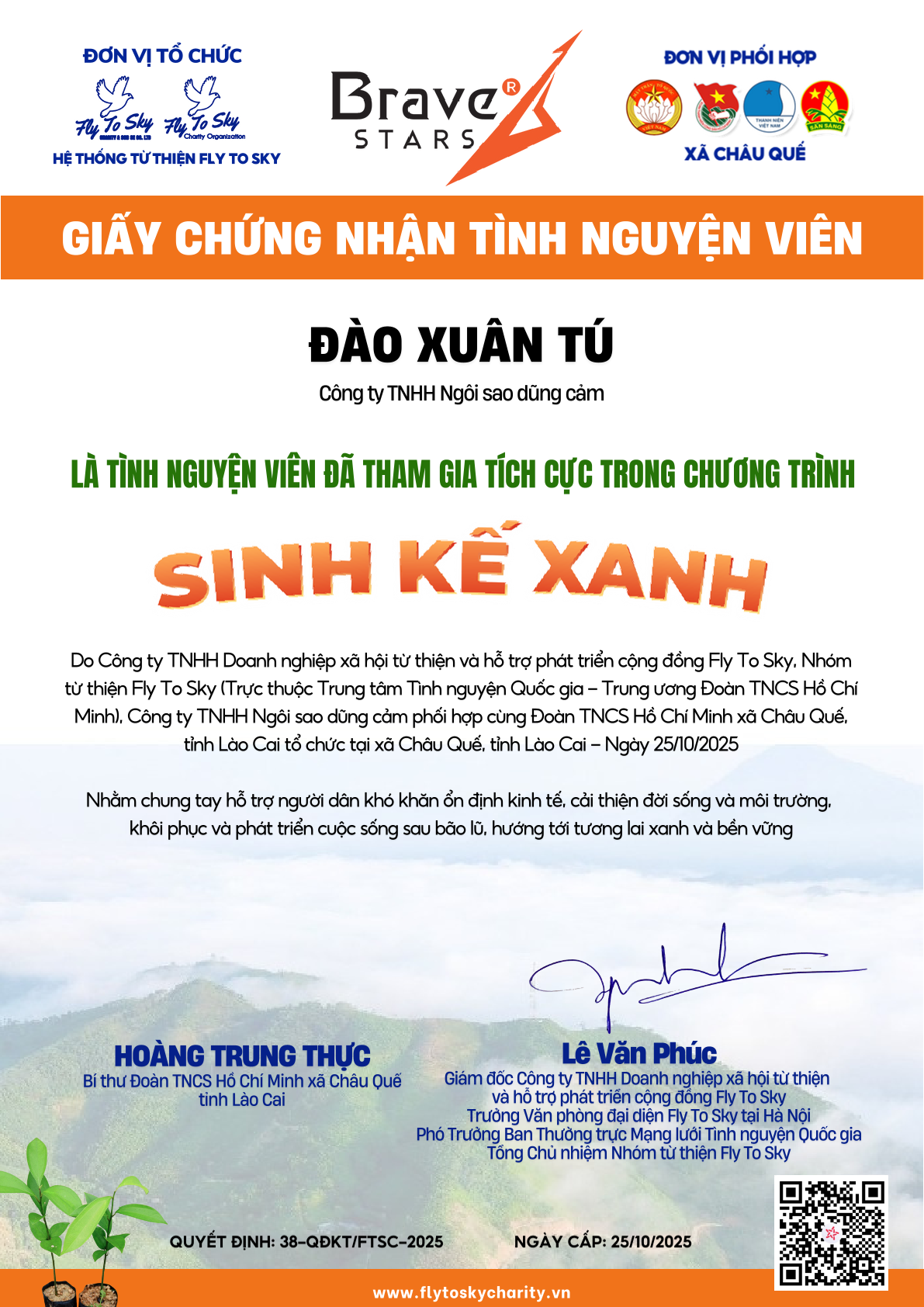 Giấy chứng nhận tình nguyện viên đã tham gia tích cực trong chương trình SINH KẾ XANH tại xã Châu Quế, tỉnh Lào Cai