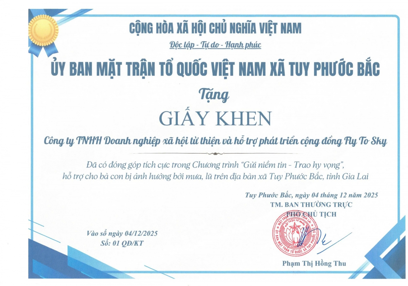 GIẤY KHEN CỦA ỦY BAN MẶT TRẬN TỔ QUỐC VIỆT NAM XÃ TUY PHƯỚC BẮC TẶNG CÔNG TY TNHH DOANH NGHIỆP XÃ HỘI TỪ THIỆN VÀ HỖ TRỢ PHÁT TRIỂN CỘNG ĐỒNG FLY TO SKY