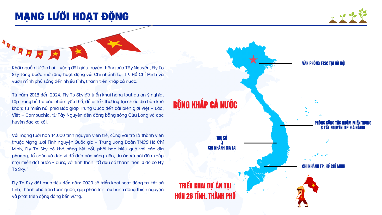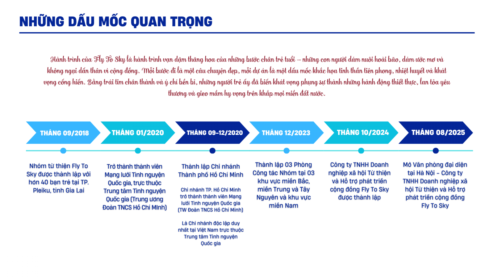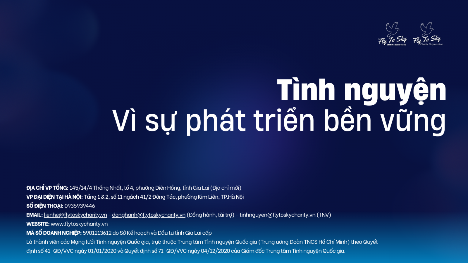 Hành trình này không phải là câu chuyện của một cá nhân hay một tổ chức đơn lẻ — nó là kết quả của những trái tim đồng điệu cùng một niềm tin rằng hành động nhỏ hôm nay có thể mở ra cơ hội lớn cho mai sau. Fly To Sky đã cùng hàng vạn bạn trẻ tình nguyện mang yêu thương đến khắp miền Tổ quốc. Mỗi chương trình, mỗi dự án đều là một dấu ấn khẳng định khát vọng của tuổi trẻ. Đó không chỉ là những hoạt động tình nguyện, mà còn là minh chứng cho tinh thần của những bạn trẻ Fly To Sky góp phần nhỏ bé vào sự phát triển của đất nước trong kỷ nguyên vươn mình.