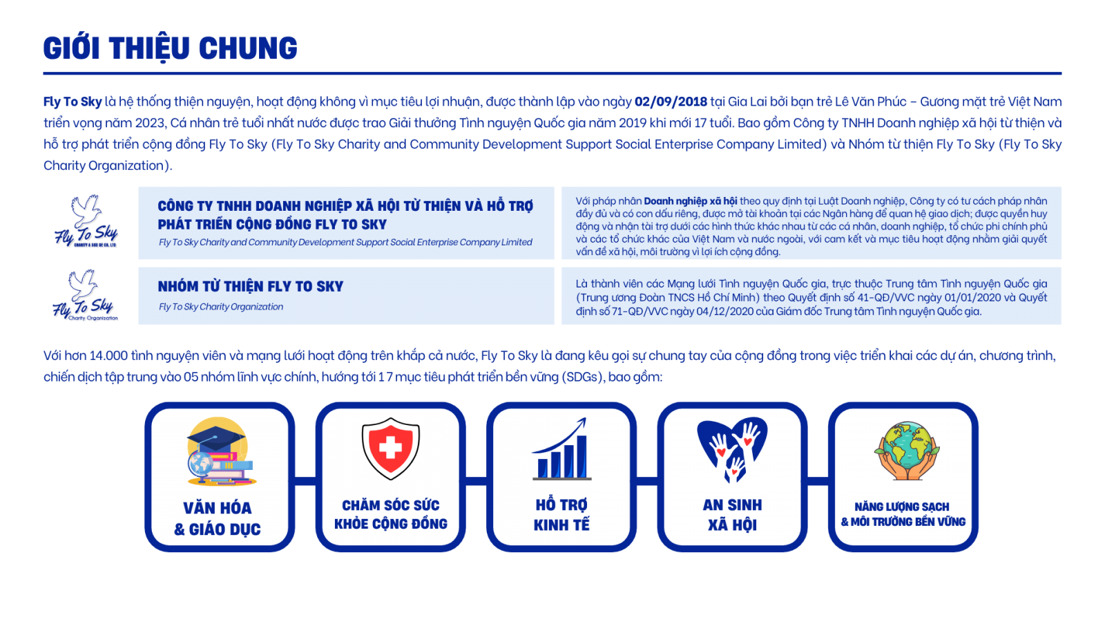Với pháp nhân Doanh nghiệp xã hội theo quy định tại Luật Doanh nghiệp số 59/2020/QH14, Công ty TNHH Doanh nghiệp xã hội từ thiện và hỗ trợ phát triển cộng đồng Fly To Sky có tư cách pháp nhân đầy đủ và có con dấu riêng, được mở tài khoản tại các Ngân hàng để quan hệ giao dịch; được quyền huy động và nhận tài trợ dưới các hình thức khác nhau từ các cá nhân, doanh nghiệp, tổ chức phi chính phủ và các tổ chức khác của Việt Nam và nước ngoài, với cam kết và mục tiêu hoạt động nhằm giải quyết vấn đề xã hội, môi trường vì lợi ích cộng đồng.