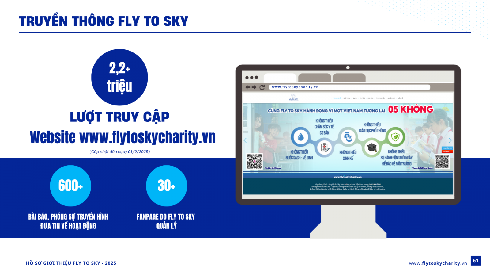 Hàng loạt dự án, chương trình dài hạn và thường niên được duy trì như Dự án “Lớp học miễn phí Smile Class”, Chương trình “Đổi sách lấy cây”, Dự án “Sân chơi Xanh”, Dự án “Chiến sĩ lọc nước”, Dự án “Tủ sách Bồ câu trắng”, Học bổng “Cánh chim xanh”…..đã và đang giúp cho Hệ thống từ thiện Fly To Sky chung tay cùng cộng đồng giải quyết các vấn đề tại địa phương ở hiện tại và tương lai.