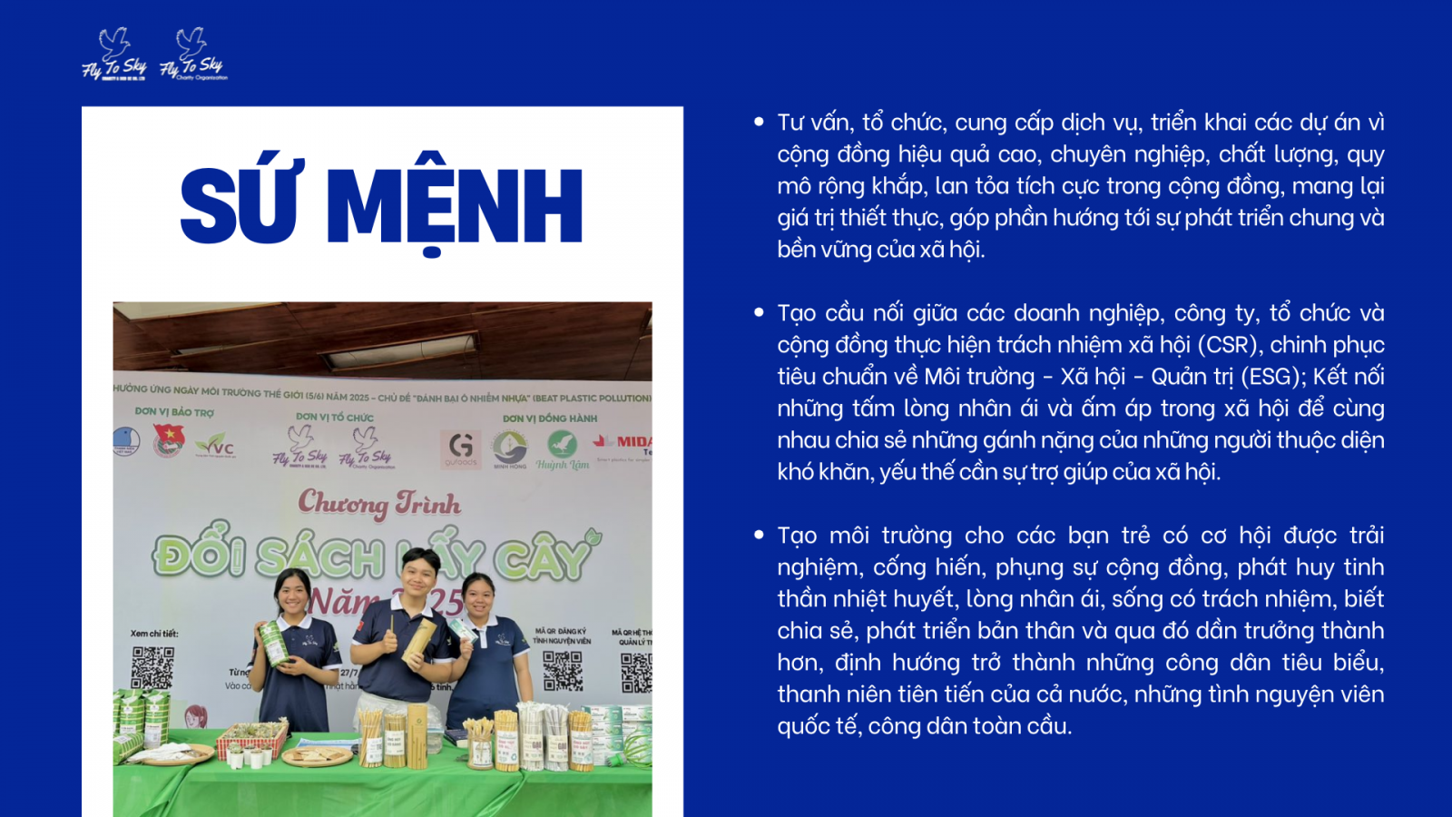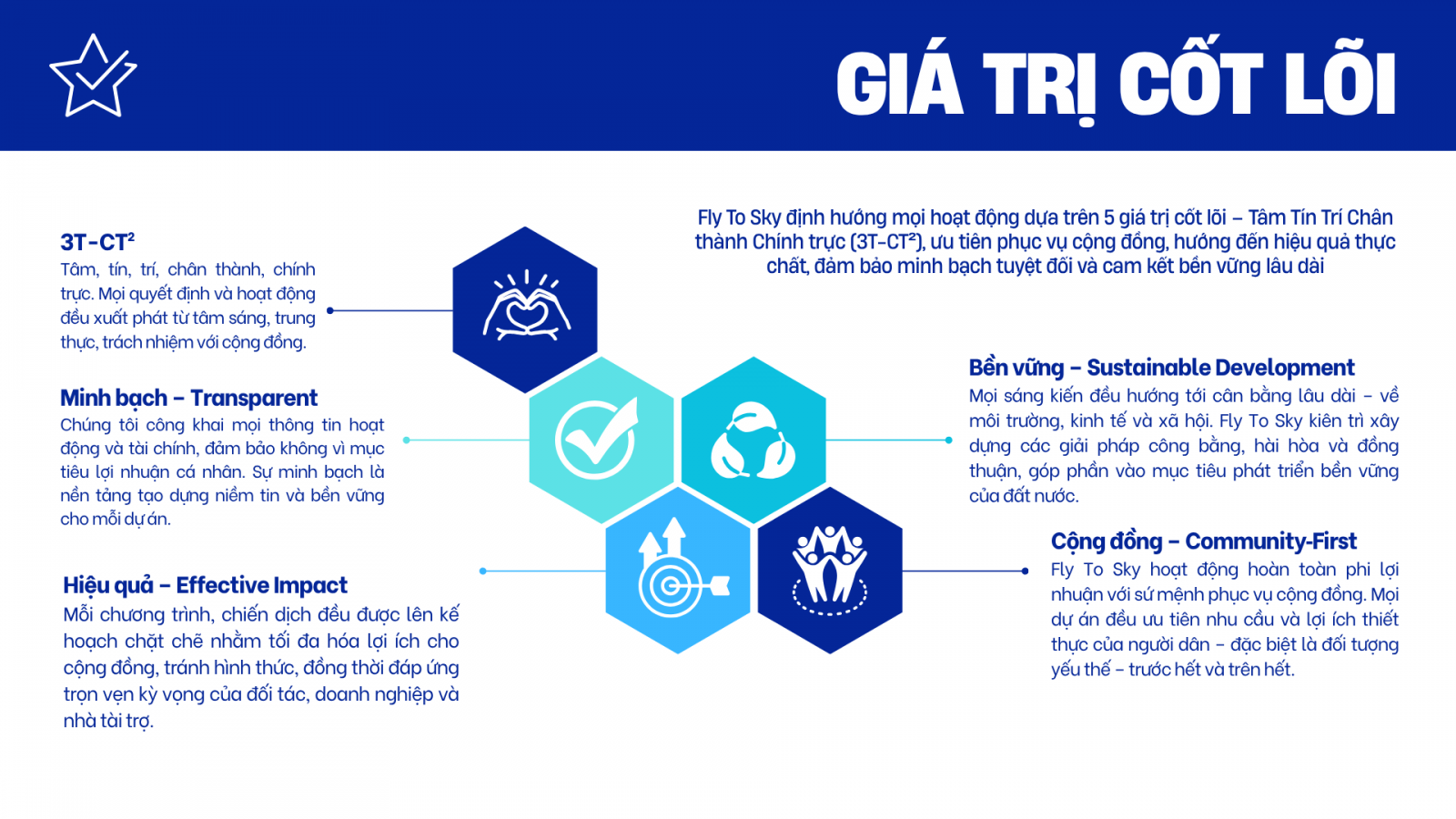 Với Fly To Sky, chúng tôi xác định việc phát triển mỗi dự án, chương trình, chiến dịch phải dựa trên tình hình thực tế, gắn với việc giải quyết các vấn đề của đối tượng thụ hưởng và có hướng đi lâu dài, có kế hoạch cụ thể chứ không đơn thuần là phong trào, nhất thời.