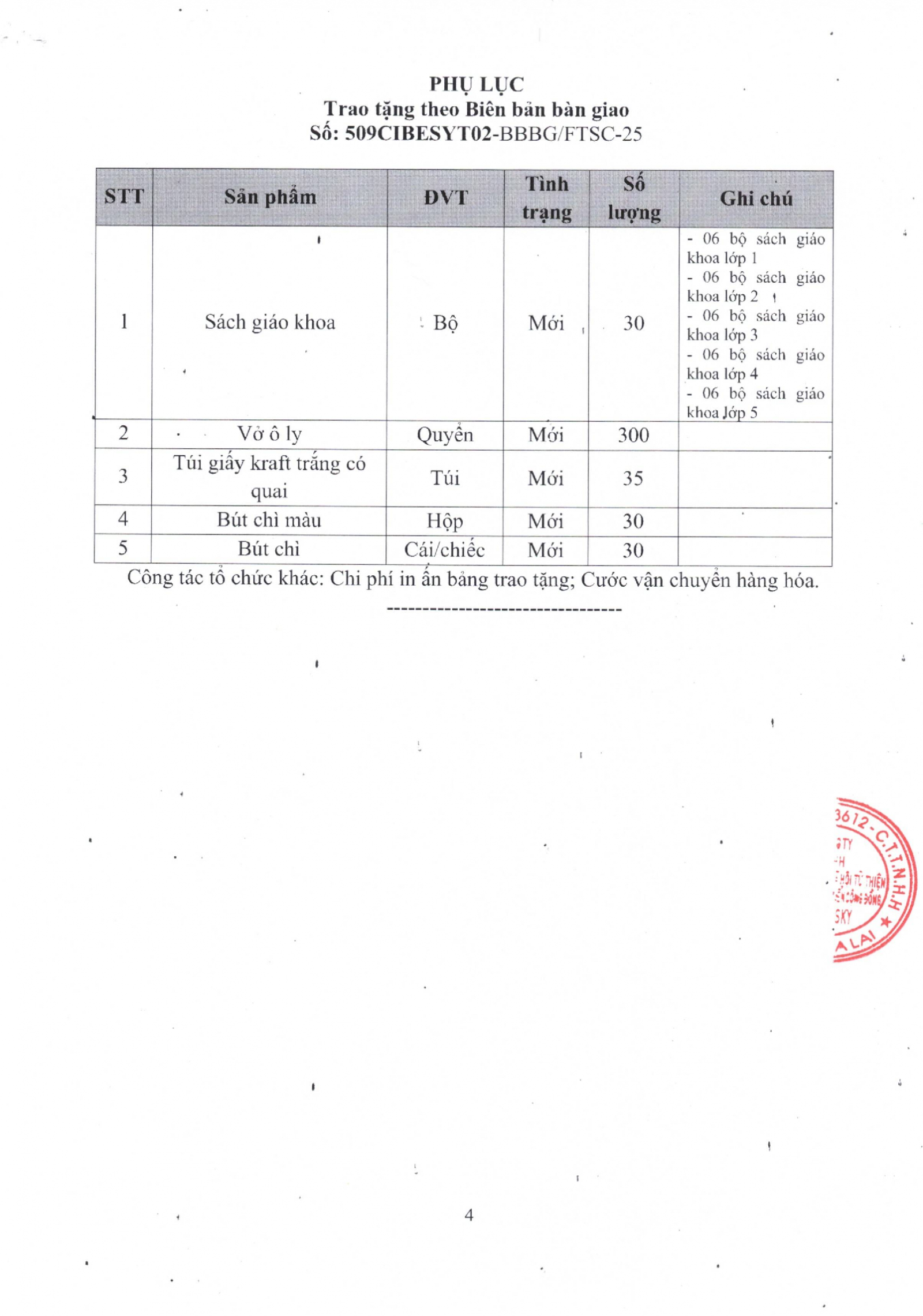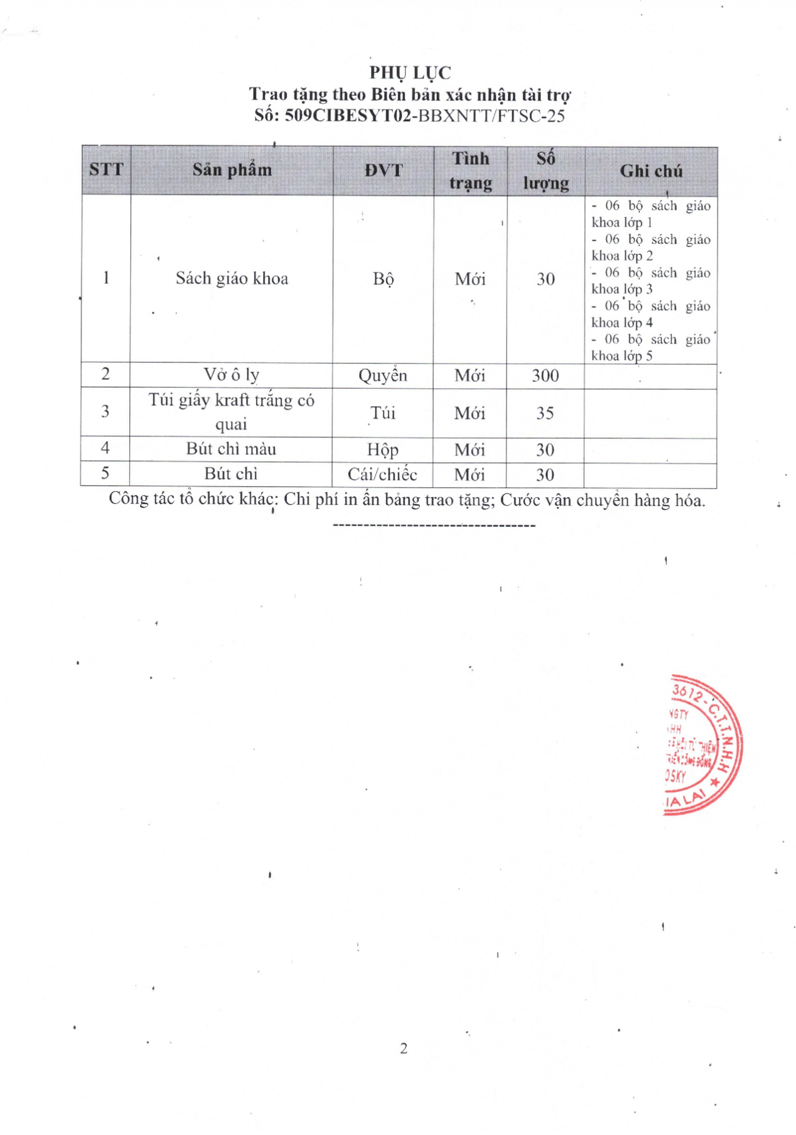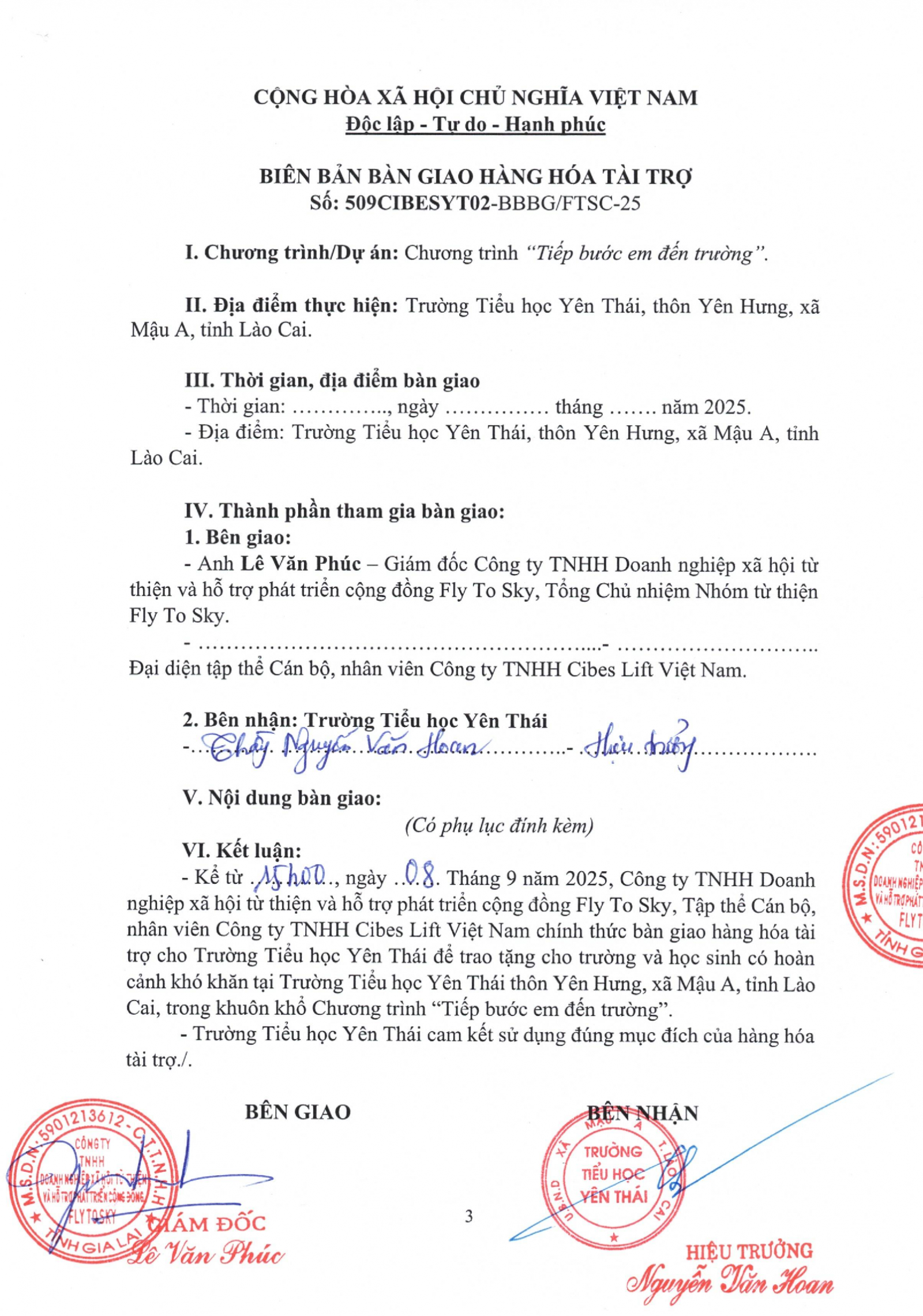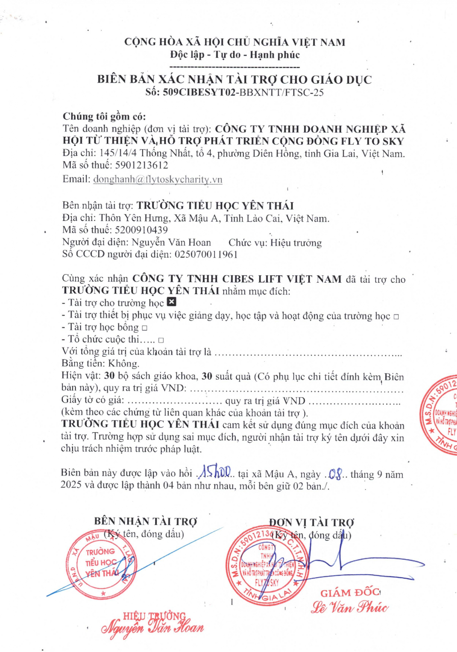 Biên bản xác nhận tài trợ và Biên bản bàn giao tài trợ cho Trường Tiểu học Yên Thái, Thôn Yên Hưng, xã Mậu A, tỉnh Lào Cai