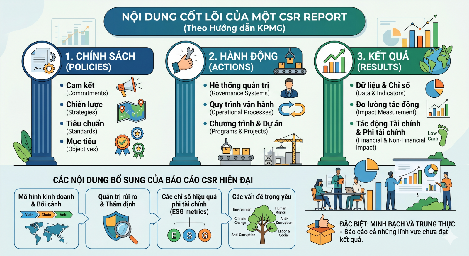 Theo KPMG, một báo cáo CSR hiệu quả cần thể hiện đầy đủ ba yếu tố: chính sách, hành động và kết quả, nhằm đảm bảo tính nhất quán giữa cam kết và thực thi. (Nguồn: KPMG)