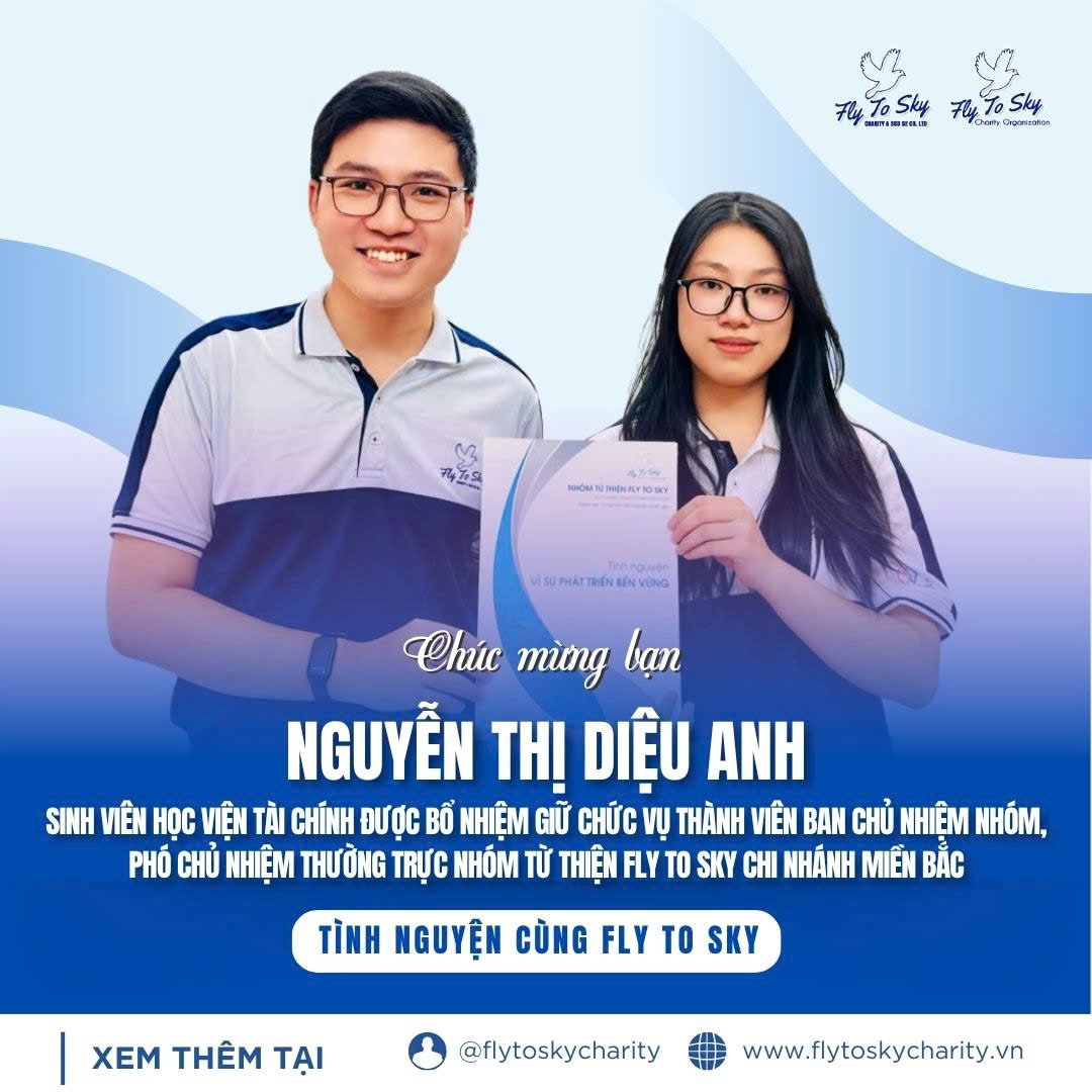 - Bổ nhiệm bạn Nguyễn Thị Diệu Anh - Sinh viên Học viện Tài chính, Tình nguyện viên Nhóm từ thiện Fly To Sky Chi nhánh miền Bắc giữ chức vụ Thành viên Ban Chủ nhiệm Nhóm, Phó Chủ nhiệm Thường trực Nhóm từ thiện Fly To Sky Chi nhánh Miền Bắc.