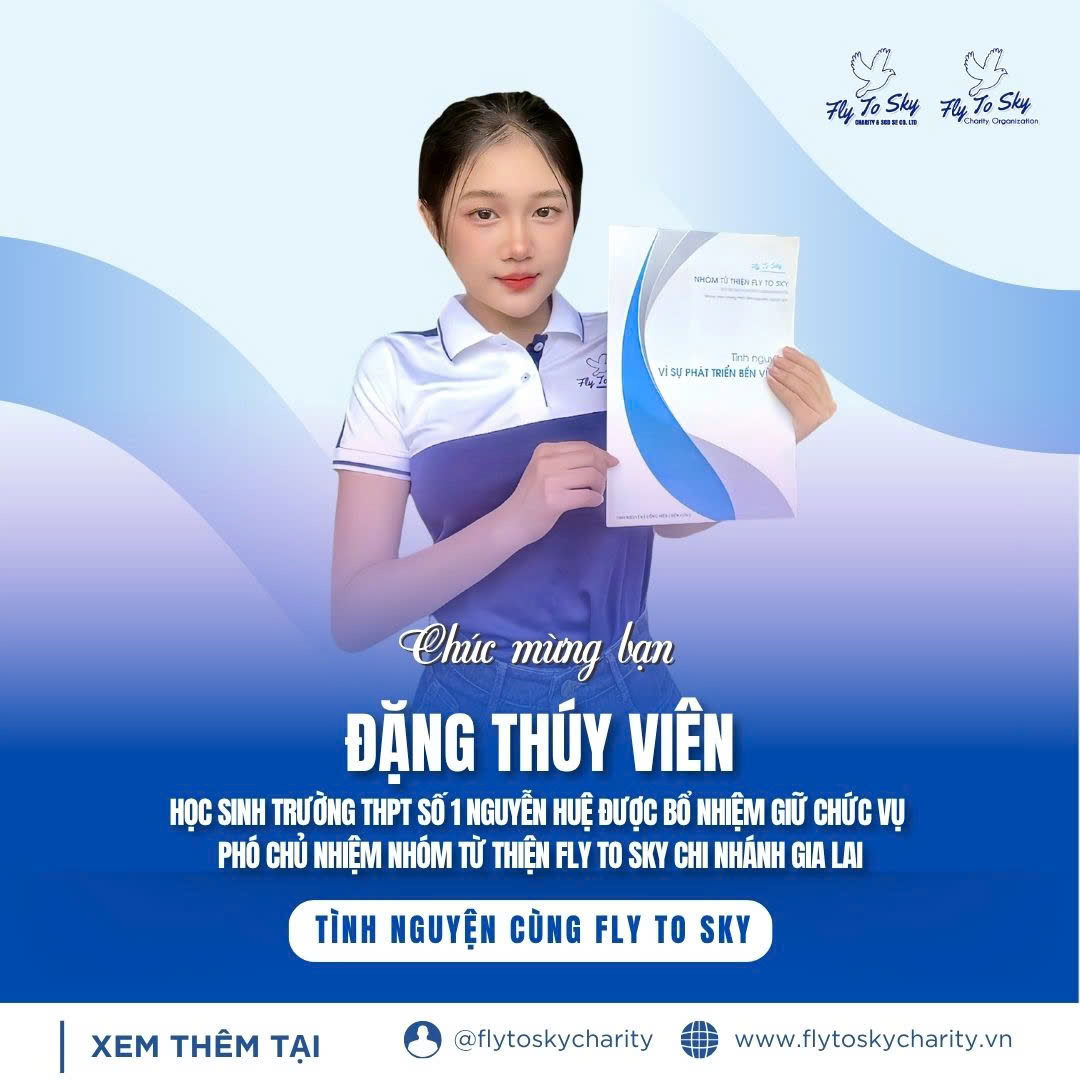 - Bổ nhiệm bạn Đặng Thúy Viên - Học sinh Trường THPT Số 1 Nguyễn Huệ (tỉnh Gia Lai), Tình nguyện viên Nhóm từ thiện Fly To Sky Chi nhánh Gia Lai giữ chức vụ Phó Chủ nhiệm Nhóm từ thiện Fly To Sky Chi nhánh Gia Lai.