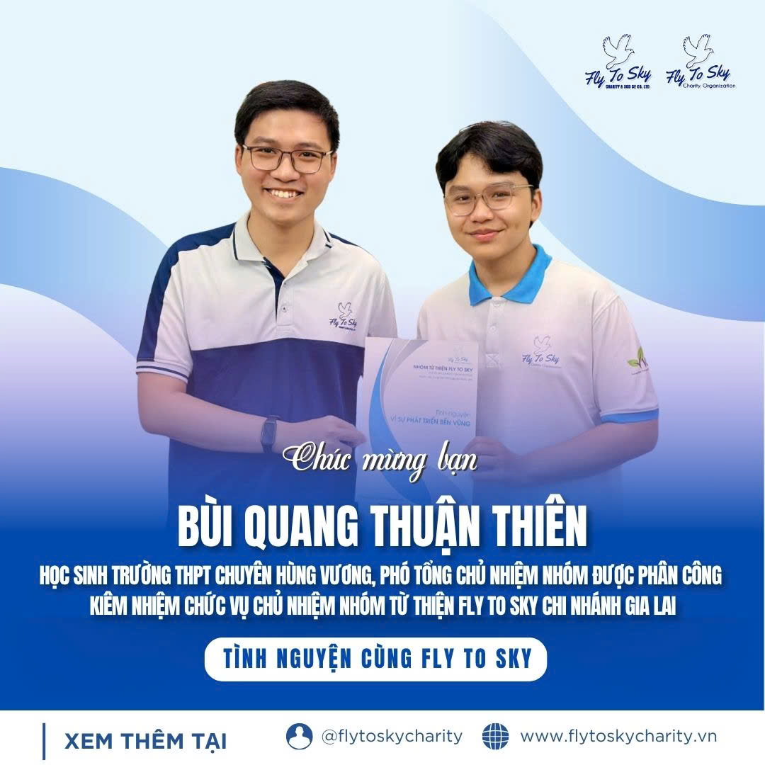 - Phân công bạn Bùi Quang Thuận Thiên - Học sinh Trường THPT Chuyên Hùng Vương, Phó Tổng Chủ nhiệm Nhóm từ thiện Fly To Sky kiêm nhiệm chức vụ Chủ nhiệm Nhóm từ thiện Fly To Sky Chi nhánh Gia Lai.