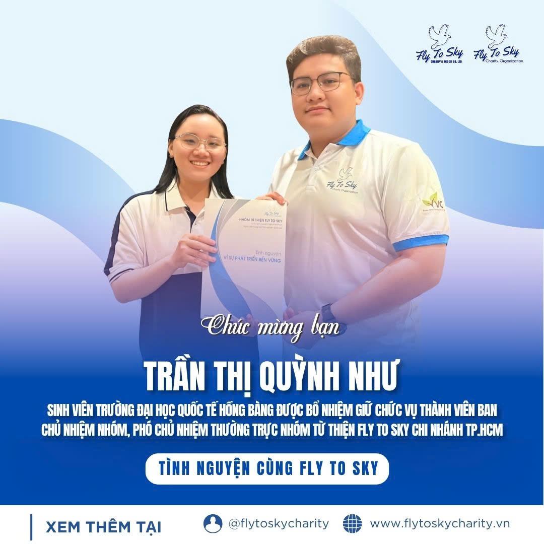 - Phân công bạn Trần Thị Quỳnh Như - Sinh viên Trường Đại học Quốc tế Hồng Bàng, Phó Ban Truyền thông Nhóm từ thiện Fly To Sky kiêm nhiệm giữ chức vụ Thành viên Ban Chủ nhiệm Nhóm, Phó Chủ nhiệm Thường trực Nhóm từ thiện Fly To Sky Chi nhánh TP.HCM.