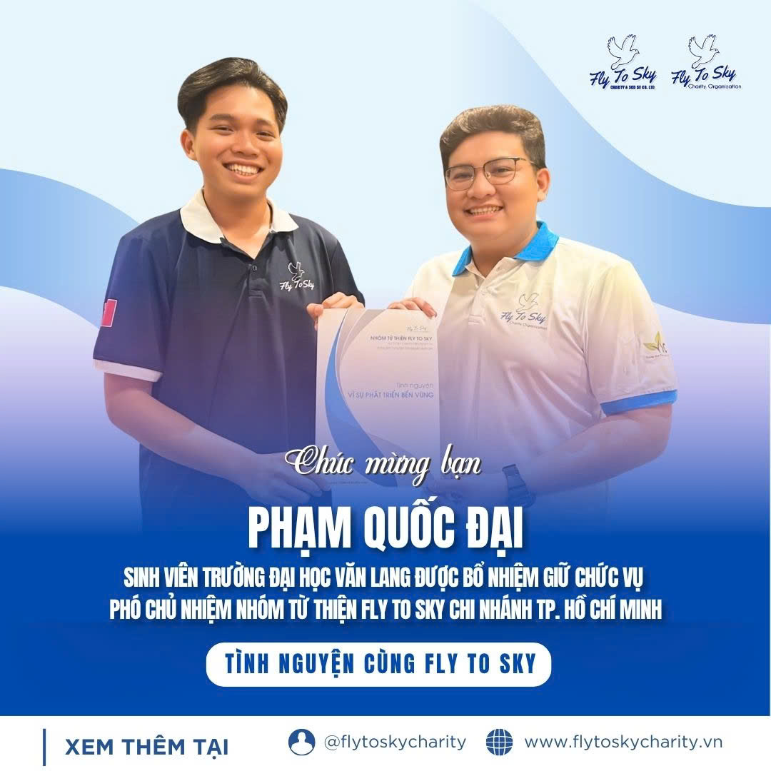 - Bổ nhiệm bạn Phạm Quốc Đại - Sinh viên Trường Đại học Văn Lang, Tình nguyện viên Nhóm từ thiện Fly To Sky Chi nhánh TP.HCM giữ chức vụ Phó Chủ nhiệm Nhóm từ thiện Fly To Sky Chi nhánh TP. Hồ Chí Minh.