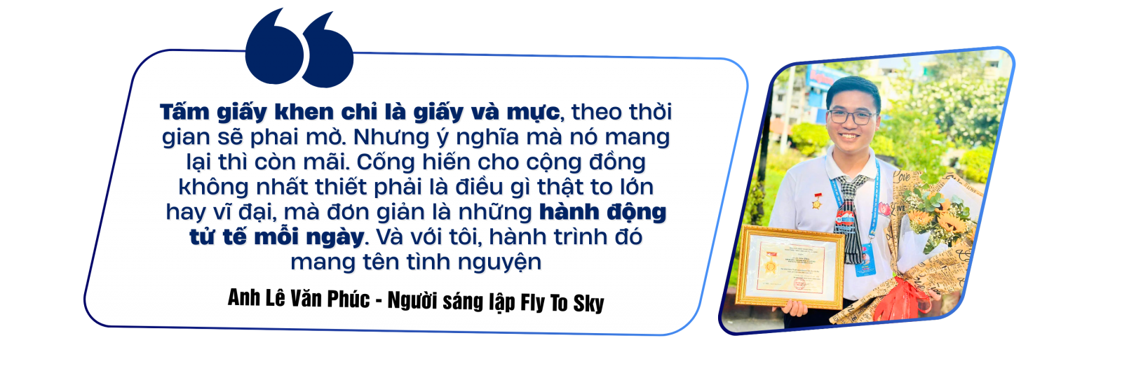 Điều khiến anh Lê Văn Phúc cảm thấy tự hào hơn cả, không nằm ở những lời ca ngợi hay danh hiệu, mà chính là cơ hội được gặp gỡ, giao lưu với những người trẻ cùng chung lý tưởng, cùng đang cống hiến thầm lặng cho đất nước. Những giá trị tốt đẹp Chủ tịch Hồ Chí Minh gửi gắm cho thế hệ trẻ “sống dậy” mạnh mẽ, lan tỏa, thôi thúc anh mang tinh thần thiện nguyện vì cộng đồng của Fly To Sky đến gần hơn với mọi người.
