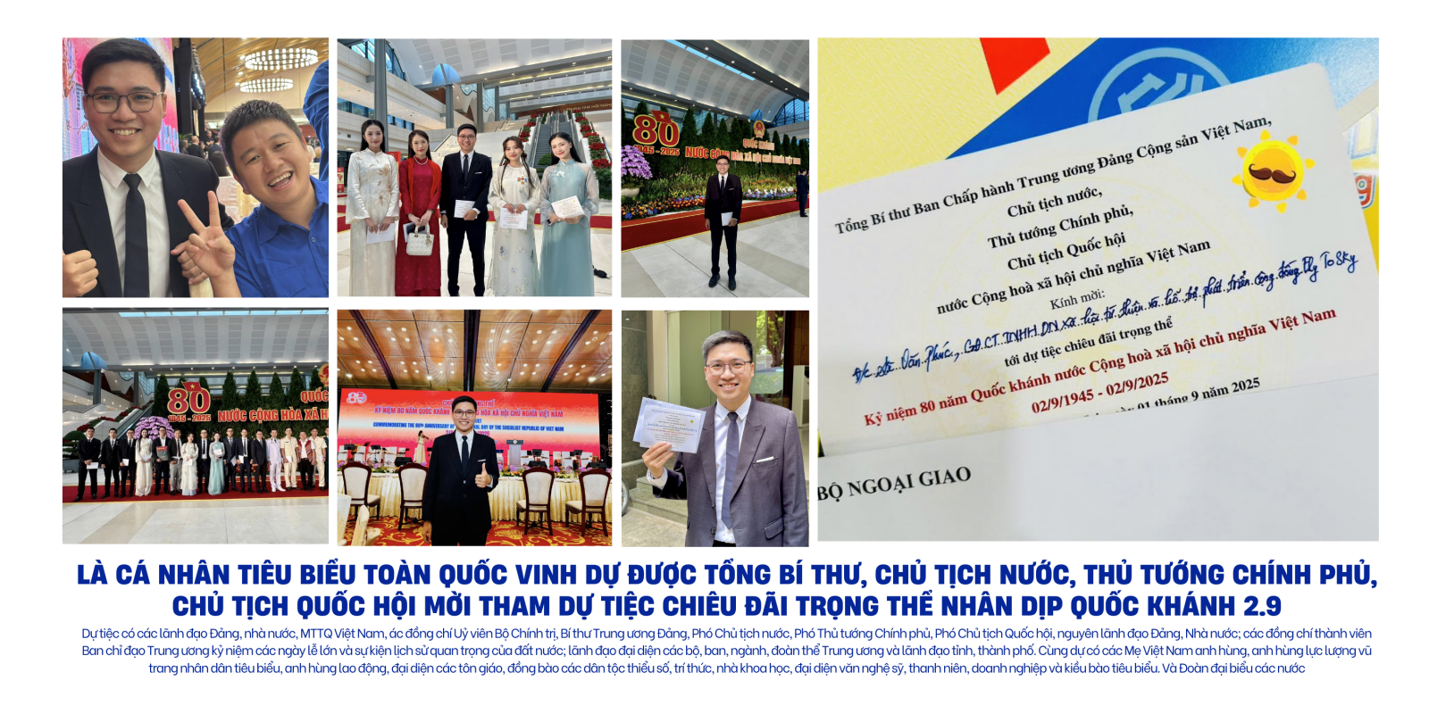 Tối 01/9/2025, tại Trung tâm Hội nghị Quốc gia (Hà Nội), lãnh đạo Đảng và Nhà nước tổ chức chiêu đãi trọng thể kỷ niệm 80 năm Quốc khánh nước Cộng hòa xã hội chủ nghĩa Việt Nam – sự kiện chính trị, đối ngoại đặc biệt quan trọng, quy tụ lãnh đạo cấp cao, các nhân vật tiêu biểu trong nước và bạn bè quốc tế. Trong không khí trang nghiêm và giàu cảm xúc ấy, anh Lê Văn Phúc – người sáng lập Fly To Sky – vinh dự là đại biểu thanh niên tiêu biểu toàn quốc, nhận Thư mời của các đồng chí lãnh đạo cao nhất của Đảng và Nhà nước tham dự chương trình. Sự hiện diện của anh tại buổi lễ không chỉ là vinh dự cá nhân, mà còn phản ánh sự ghi nhận đối với những đóng góp bền bỉ của thế hệ trẻ trong công cuộc xây dựng xã hội nhân văn, đoàn kết và phát triển bền vững.