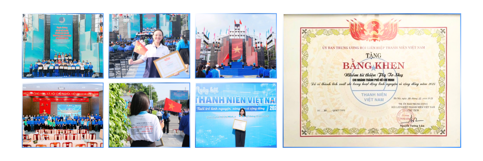 Tại sự kiện này, Trung ương Hội Liên hiệp Thanh niên Việt Nam đã trao 50 Bằng khen cho các tập thể, cá nhân tiêu biểu trong hoạt động tình nguyện toàn quốc. Trong danh sách vinh danh, Nhóm từ thiện Fly To Sky — Chi nhánh Thành phố Hồ Chí Minh được lựa chọn là một trong những tập thể xuất sắc, tiếp nối hành trình 7 năm liên tiếp Fly To Sky có mặt trong các dịp tôn vinh toàn quốc. Việc được công nhận ngay tại một sự kiện tầm quốc gia như Ngày hội Thanh niên không chỉ là phần thưởng cho những chương trình đã thực hiện, mà còn là minh chứng cho sức trẻ, tính sáng tạo và khả năng tổ chức của một hệ thống thiện nguyện do người trẻ dẫn dắt.