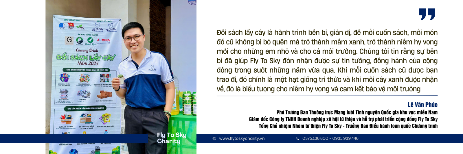Trong suốt 7 năm, chương trình “Đổi sách lấy cây” do Fly To Sky khởi xướng đã trở thành một hoạt động cộng đồng định kỳ, vừa góp phần lan tỏa văn hóa đọc vừa gieo mầm ý thức bảo vệ môi trường. Tính đến năm 2025, chương trình đã thu hút hơn 43.000 người tham gia và gần 100 tấn sách, giấy được quy đổi, nguồn lực ấy được phân loại, chuyển tiếp thành hàng nghìn bộ sách giáo khoa, nhiều tấn quần áo và phần quà trao tới vùng khó khăn, đồng thời đóng góp cho hoạt động tái chế gây quỹ cho các dự án cộng đồng.