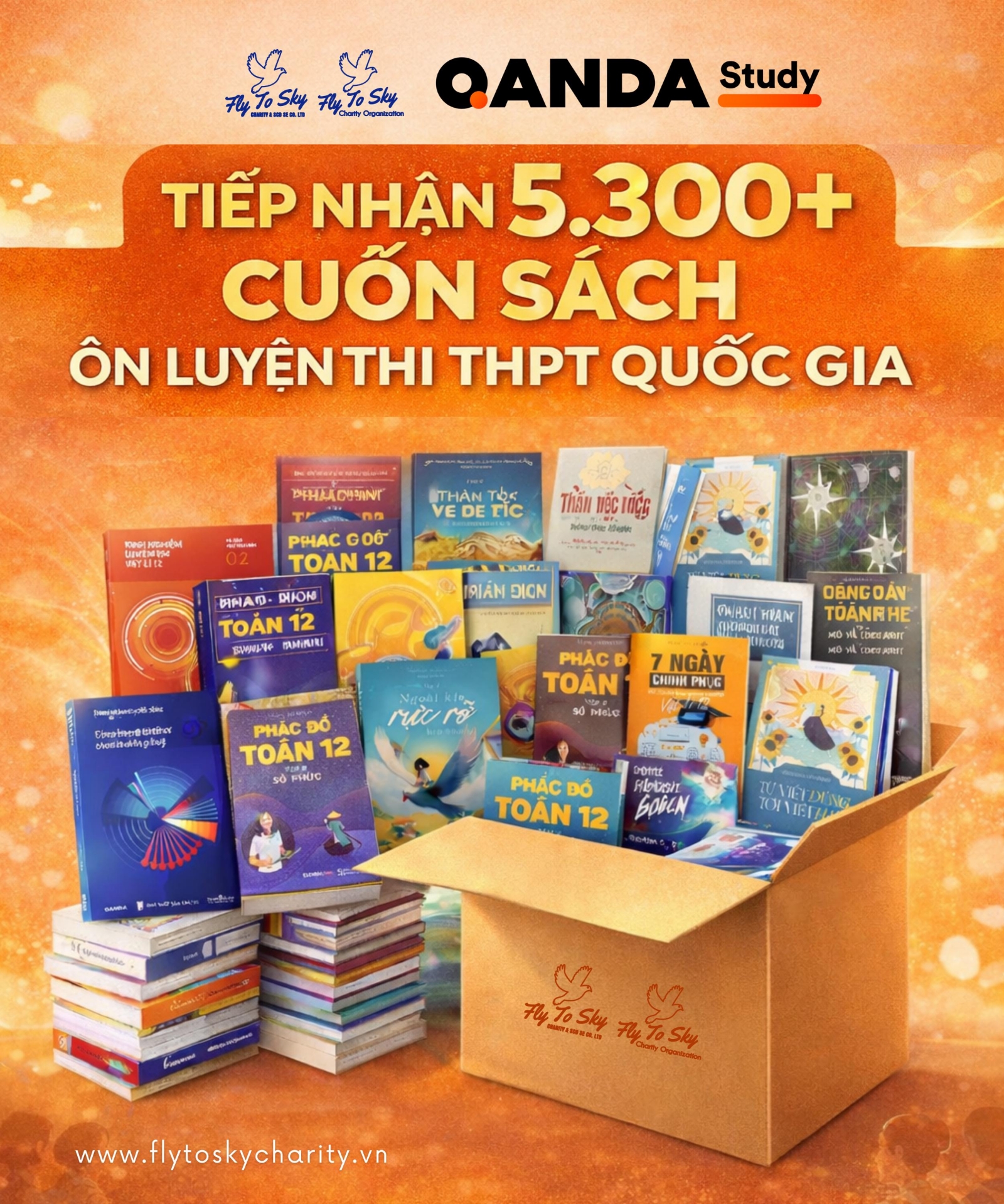 Vừa qua, Fly To Sky đã tiếp nhận hơn 5.300 cuốn sách ôn luyện kỳ thi THPT Quốc gia do Qanda Study tài trợ, sẵn sàng gửi trao đến các trường học và học sinh có hoàn cảnh khó khăn trong thời gian tới.