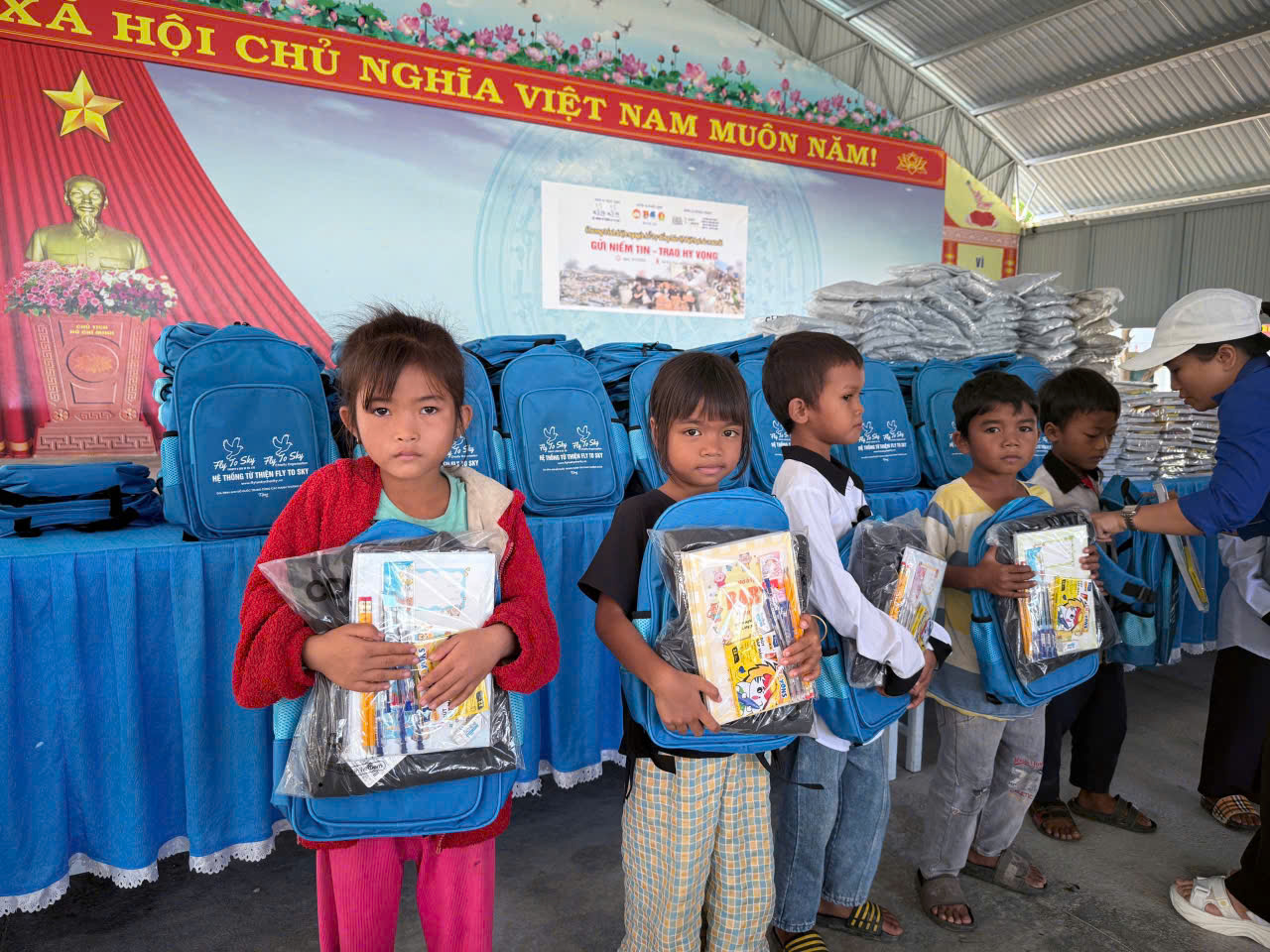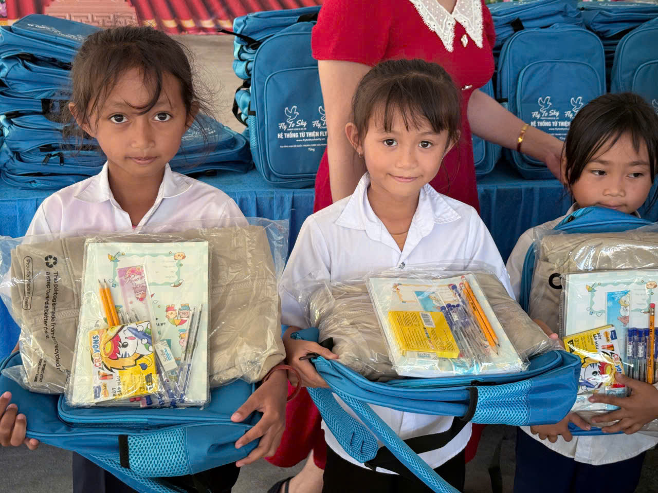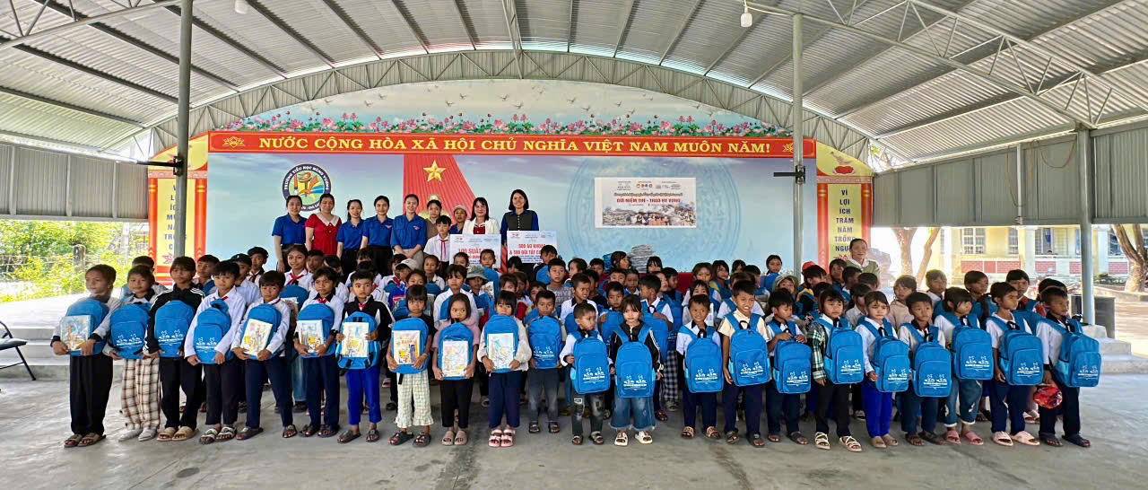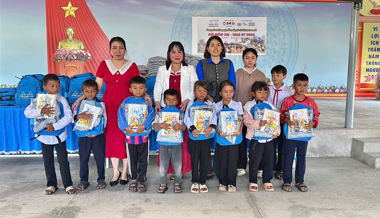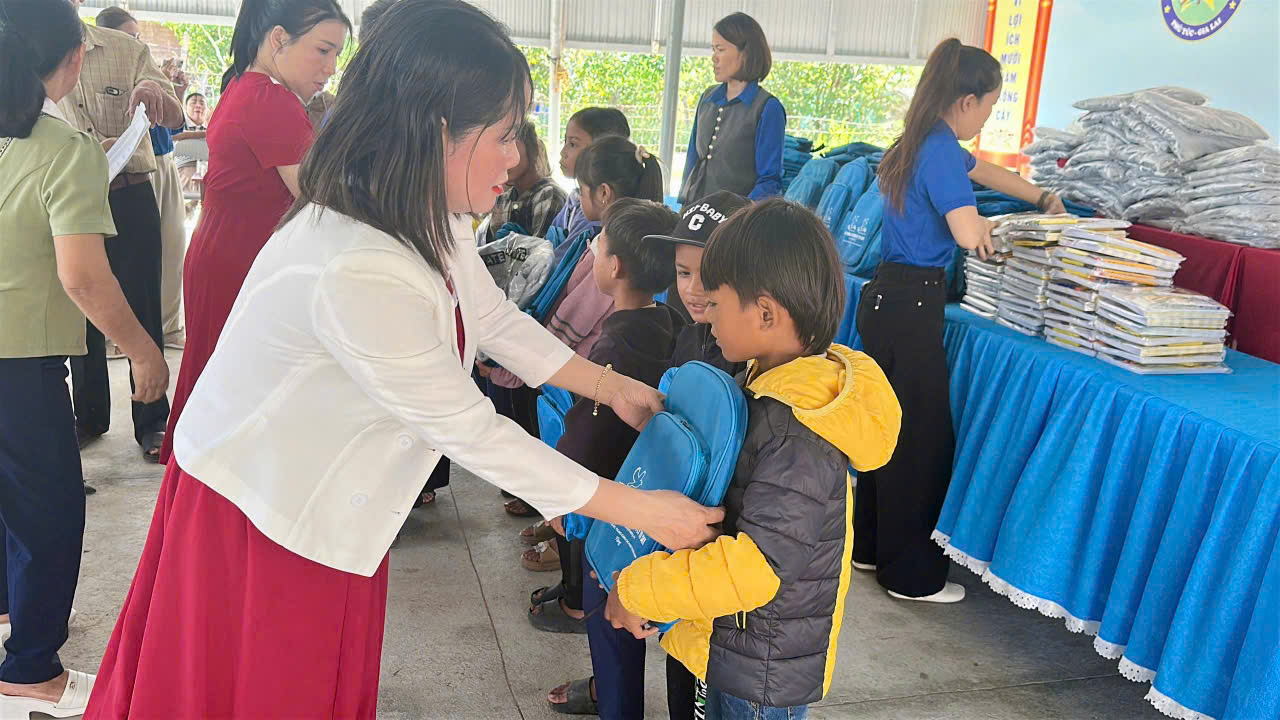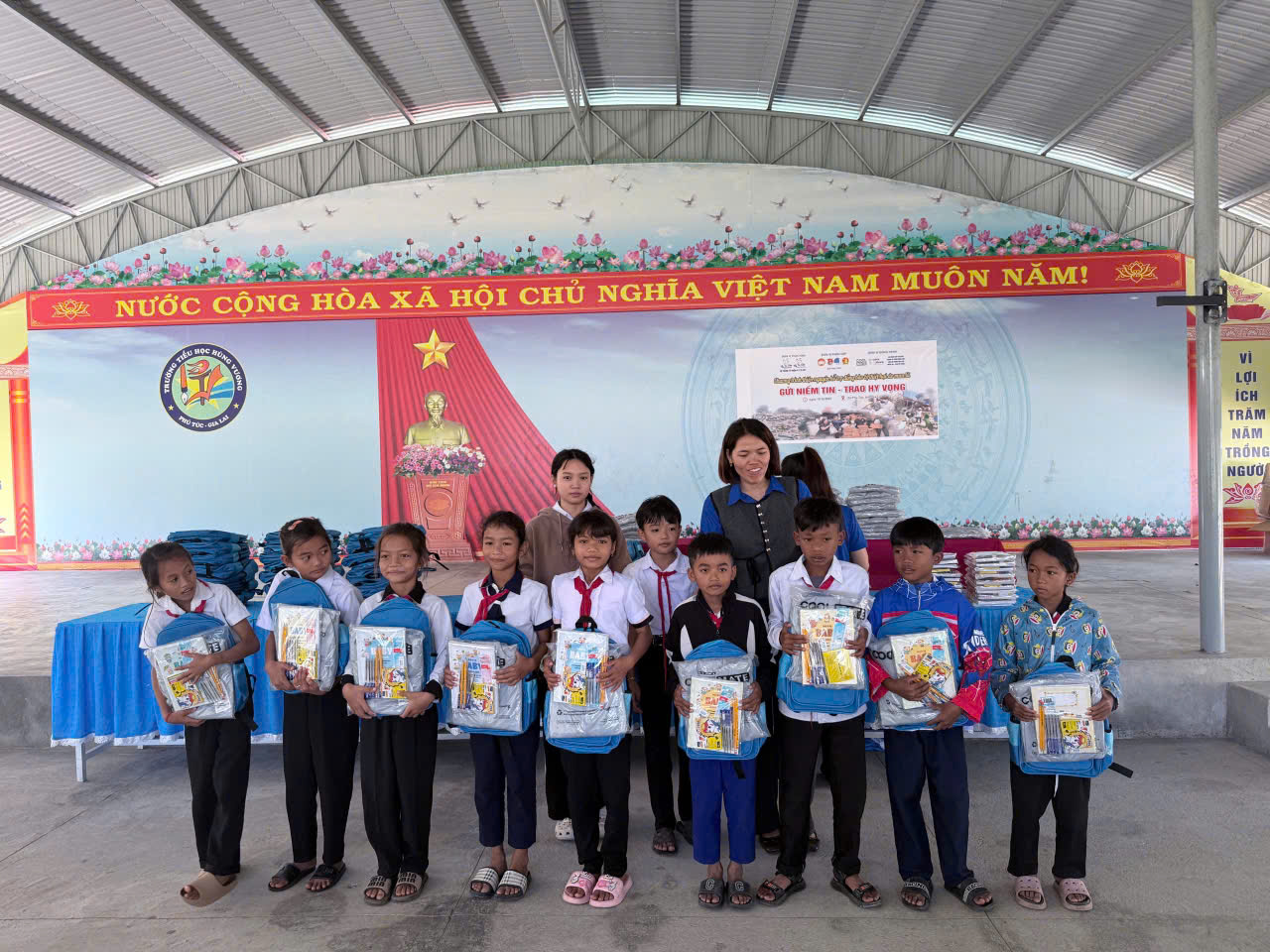 Hình: Chương trình đã trao 100 suất quà mỗi suất gồm balo, tập vở và đồ dùng học tập cho các em học sinh, tiếp sức cho các em đến trường.