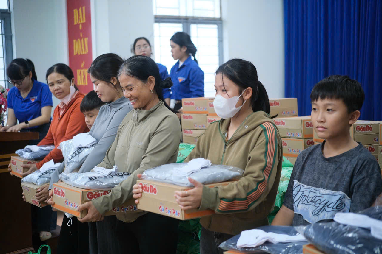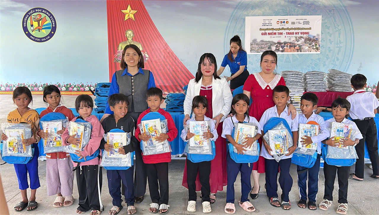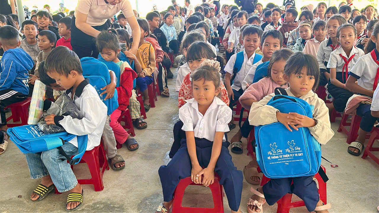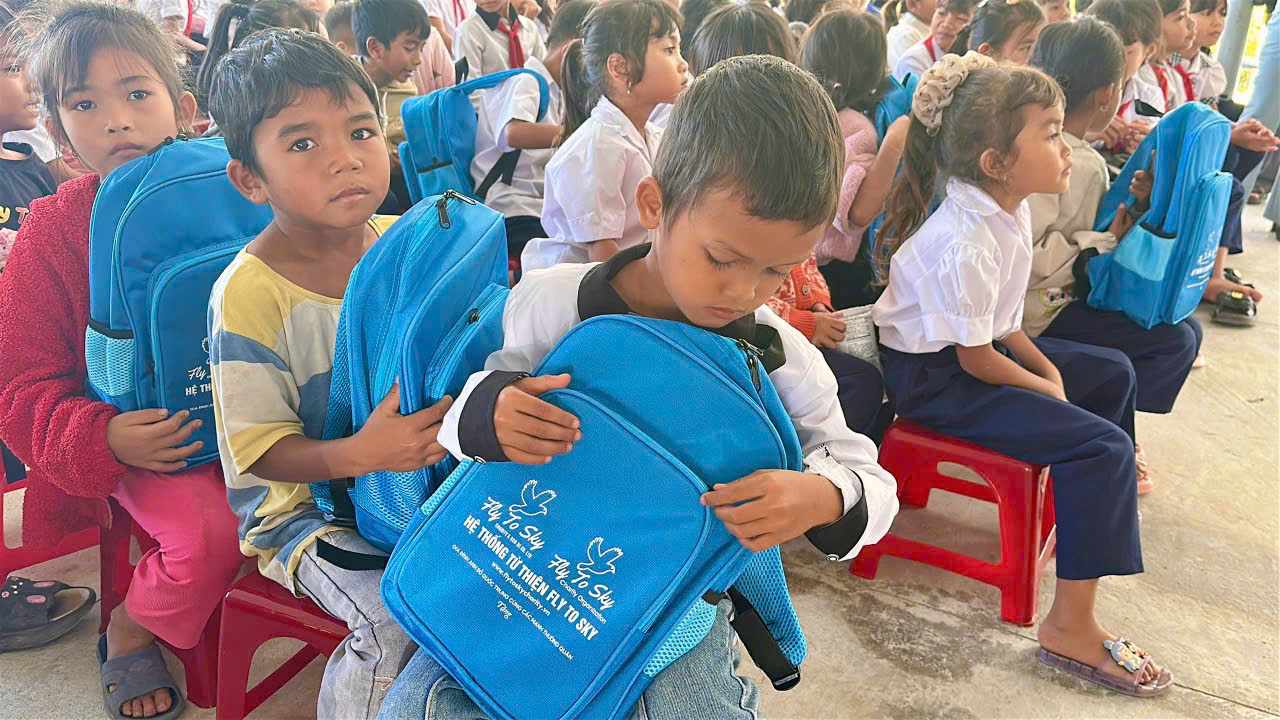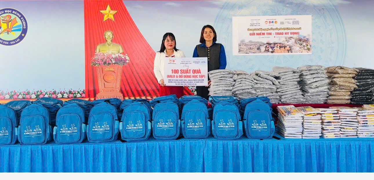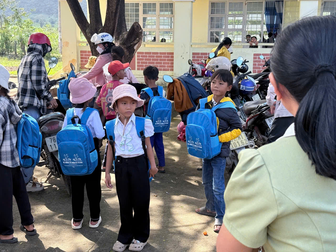 Hình: Chương trình đã trao 100 suất quà mỗi suất gồm balo, tập vở và đồ dùng học tập cho các em học sinh, tiếp sức cho các em đến trường.