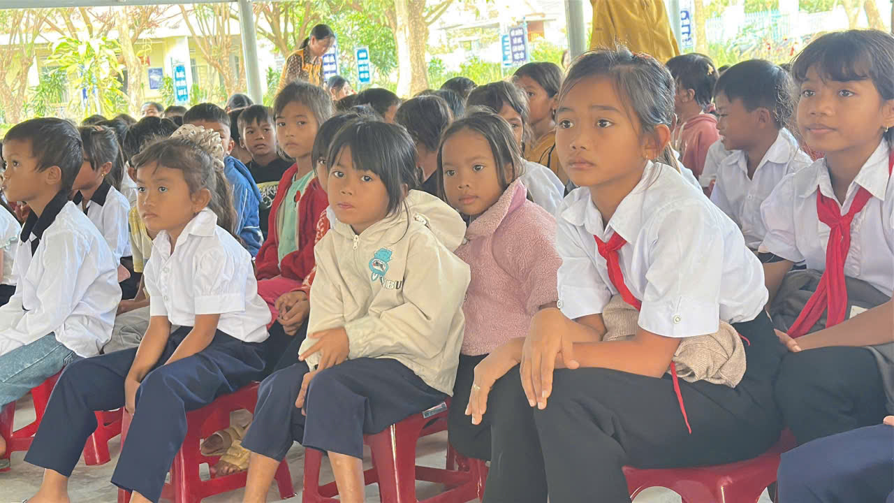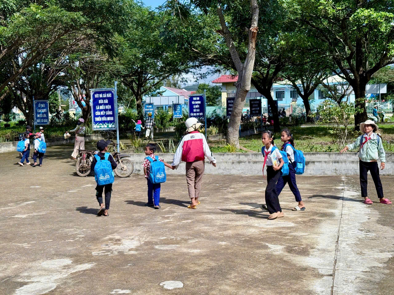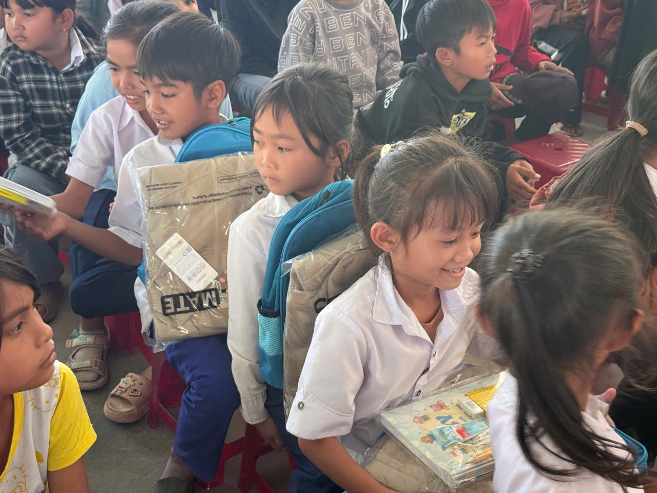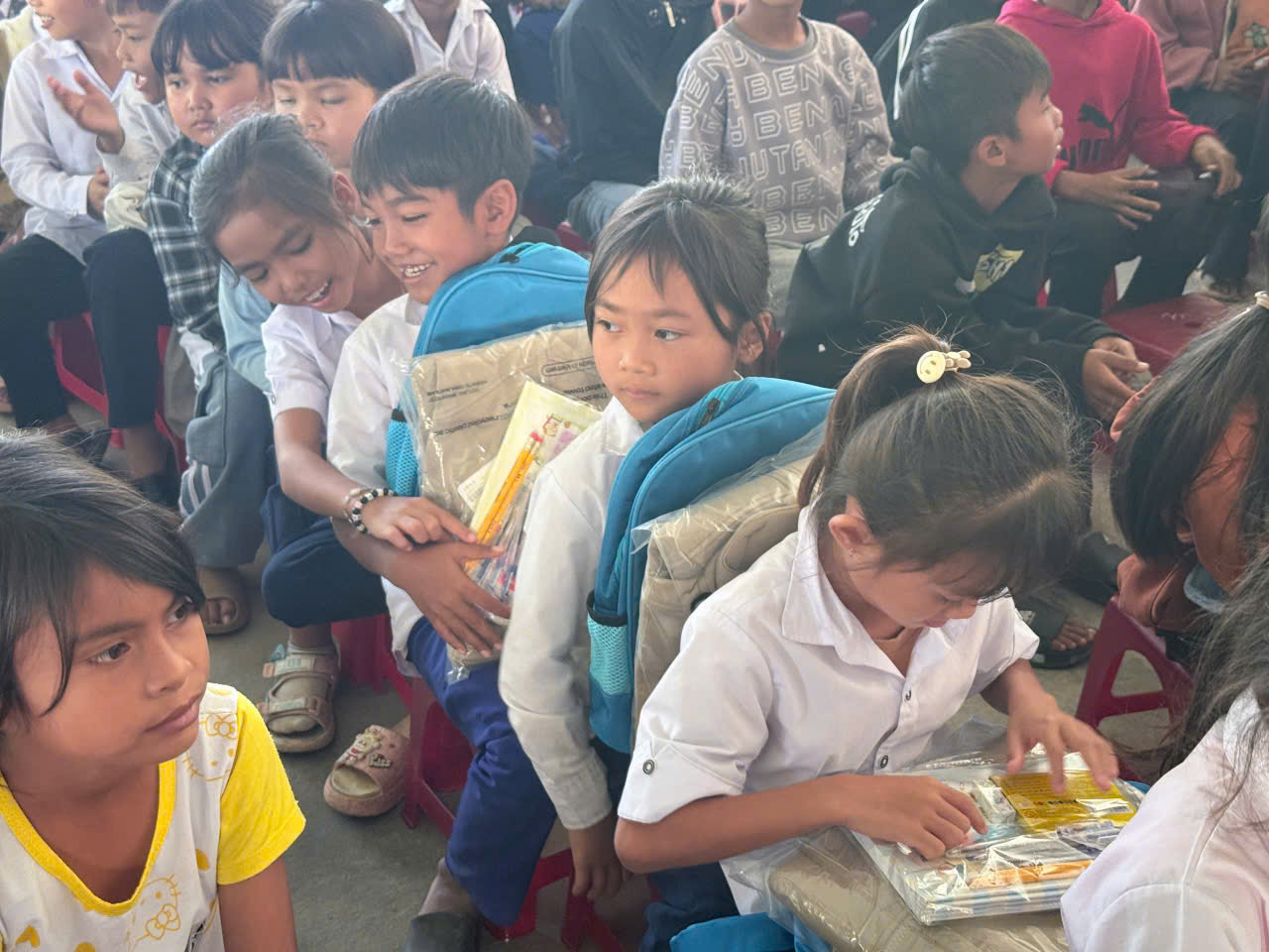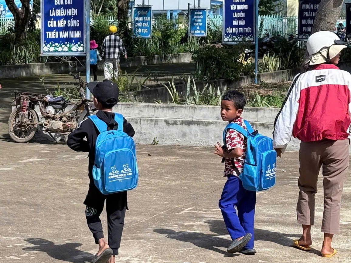 Hình: Chương trình đã trao 100 suất quà mỗi suất gồm balo, tập vở và đồ dùng học tập cho các em học sinh, tiếp sức cho các em đến trường.