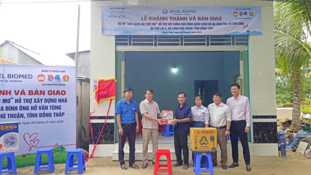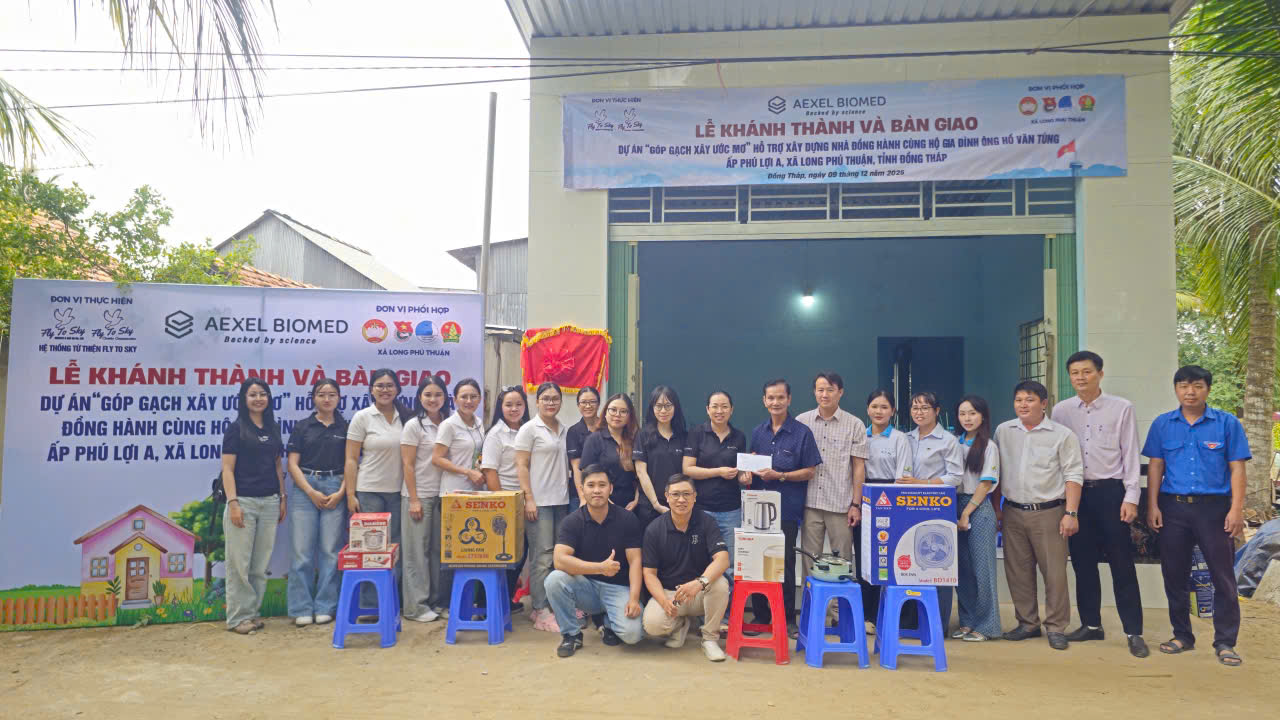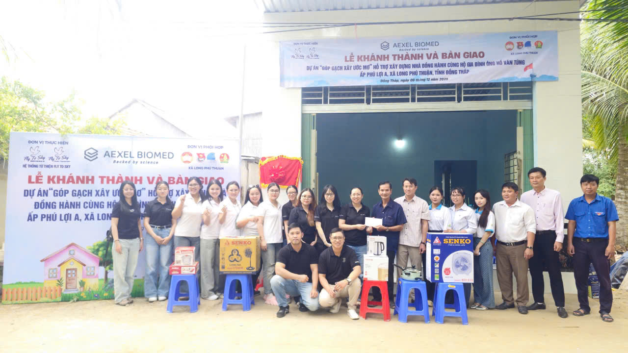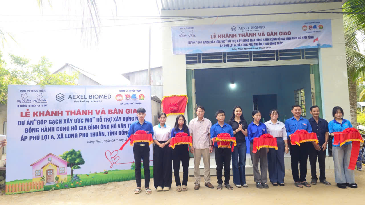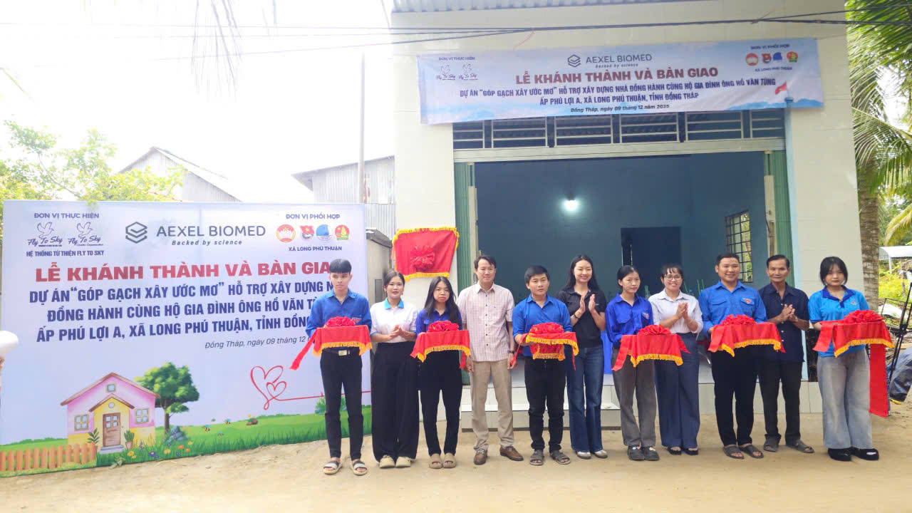 Trưa ngày 09/12/2025, Công ty TNHH Doanh nghiệp xã hội từ thiện và hỗ trợ phát triển cộng đồng Fly To Sky, Nhóm từ thiện Fly To Sky (Trực thuộc Trung tâm Tình nguyện Quốc gia – Trung ương Đoàn TNCS Hồ Chí Minh) cùng với Aexel Biomed đã tổ chức lễ khánh thành và bàn giao ngôi nhà trong khuôn khổ dự án “Góp gạch xây ước mơ” cho gia đình chú Hồ Văn Tùng (Ấp Phú Lợi A, xã Long Phú Thuận, tỉnh Đồng Tháp).