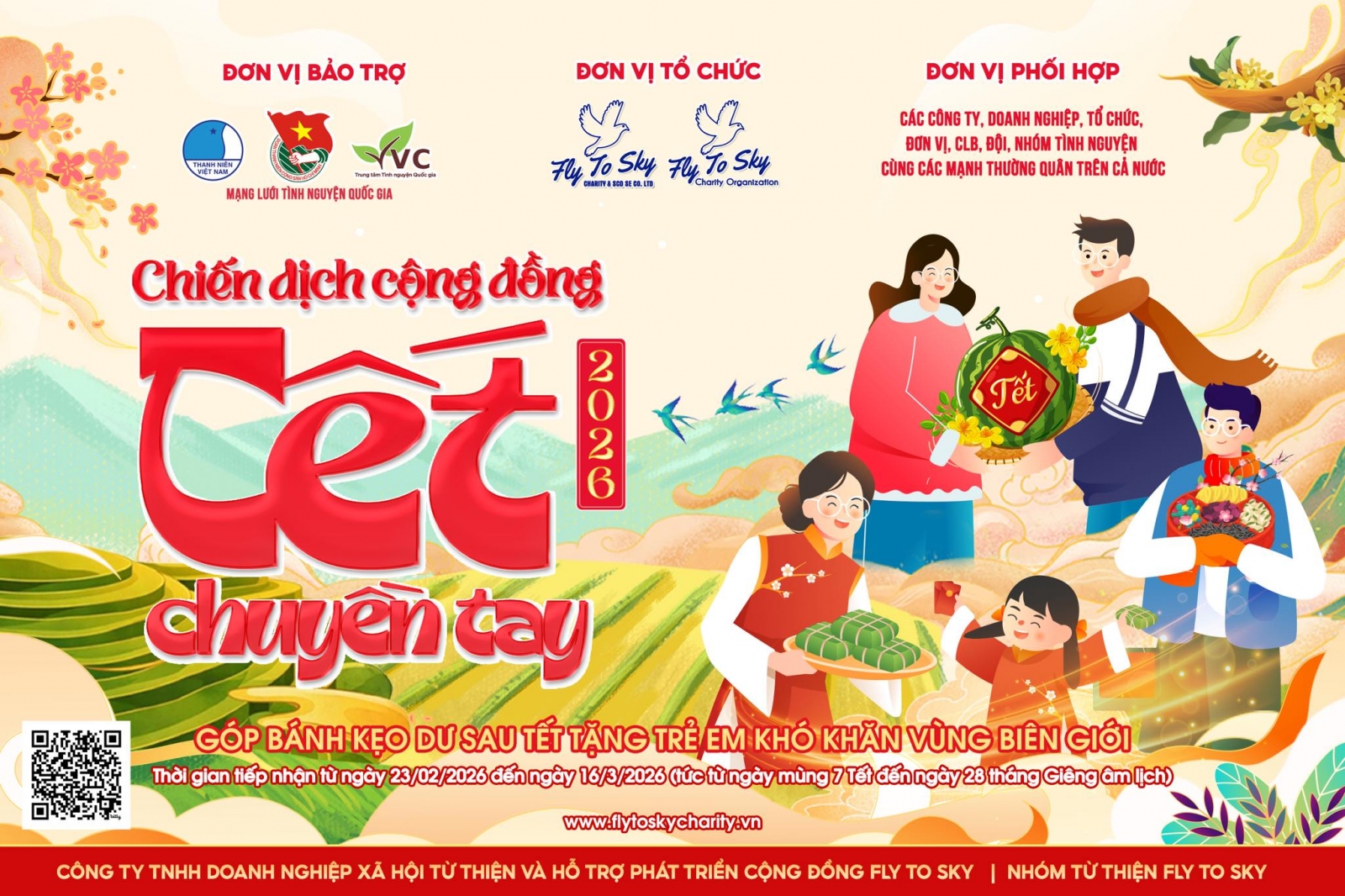 Công ty TNHH Doanh nghiệp xã hội từ thiện và hỗ trợ phát triển cộng đồng Fly To Sky, Nhóm từ thiện Fly To Sky, cùng sự hỗ trợ và đồng hành của các công ty, doanh nghiệp, tổ chức, đơn vị, CLB, Đội, Nhóm tình nguyện cùng các mạnh thường quân trên khắp mọi miền đất nước tiếp tục phát động Chiến dịch cộng đồng “Tết chuyền tay” năm 2026 trên toàn quốc với mong muốn chia sẻ những phần bánh, kẹo, mứt, hạt ấy, “chuyền tay” không khí và niềm vui của những ngày Tết vừa qua đến với trẻ em vùng cao, trẻ em có hoàn cảnh khó khăn tại khu vực biên giới, đồng thời góp phần hạn chế lãng phí và giảm thiểu thực phẩm thừa sau Tết.