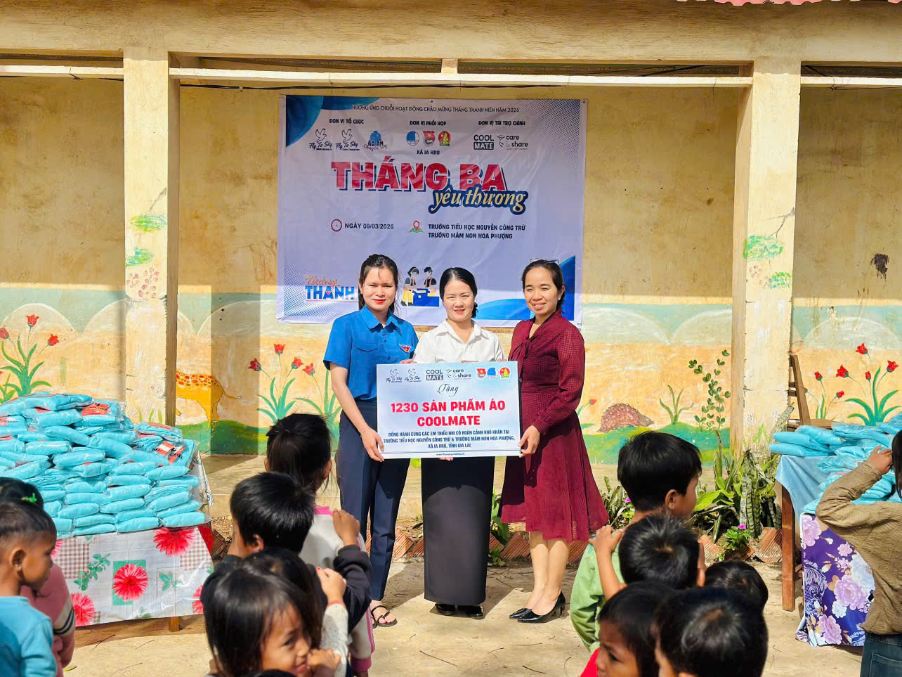 Ngày 09/3/2026, Công ty TNHH Doanh nghiệp xã hội từ thiện và hỗ trợ phát triển cộng đồng Fly To Sky, Nhóm từ thiện Fly To Sky cùng sự đồng hành của Dự án Care & Share (Coolmate) đã trao tặng 1.230 chiếc áo mới cho các em học sinh tại Trường Tiểu học Nguyễn Công Trứ và Trường Mầm non Hoa Phượng, thuộc xã Ia Hrú, tỉnh Gia Lai trong khuôn khổ chương trình “Tháng ba yêu thương”
