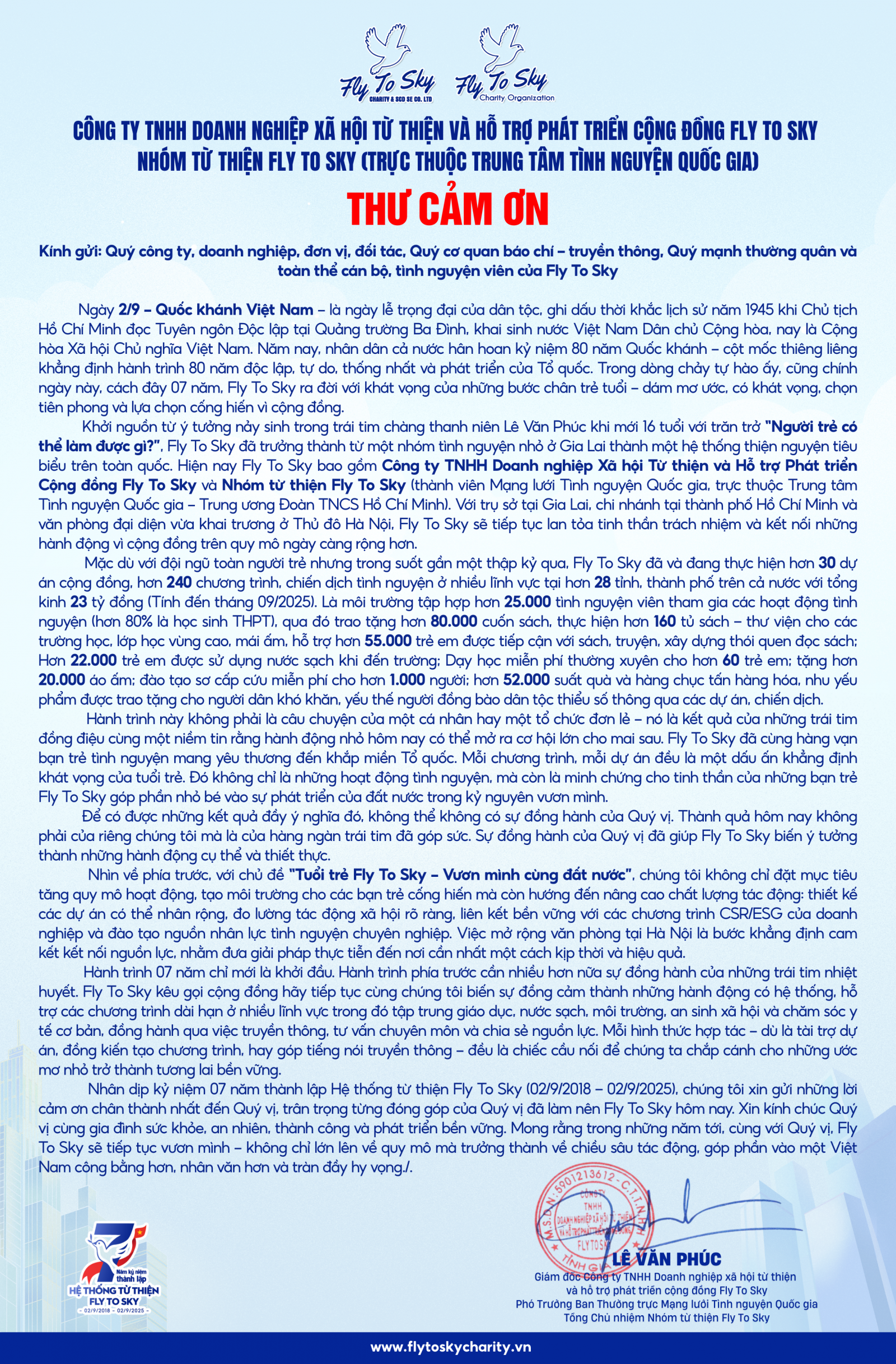 Nhân dịp kỷ niệm 07 năm thành lập Hệ thống từ thiện Fly To Sky (02/9/2018 – 02/9/2025), chúng tôi xin gửi những lời cảm ơn chân thành nhất đến Quý vị, trân trọng từng đóng góp của Quý vị đã làm nên Fly To Sky hôm nay. Xin kính chúc Quý vị cùng gia đình sức khỏe, an nhiên, thành công và phát triển bền vững. Mong rằng trong những năm tới, cùng với Quý vị, Fly To Sky sẽ tiếp tục vươn mình — không chỉ lớn lên về quy mô mà trưởng thành về chiều sâu tác động, góp phần vào một Việt Nam công bằng hơn, nhân văn hơn và tràn đầy hy vọng./.