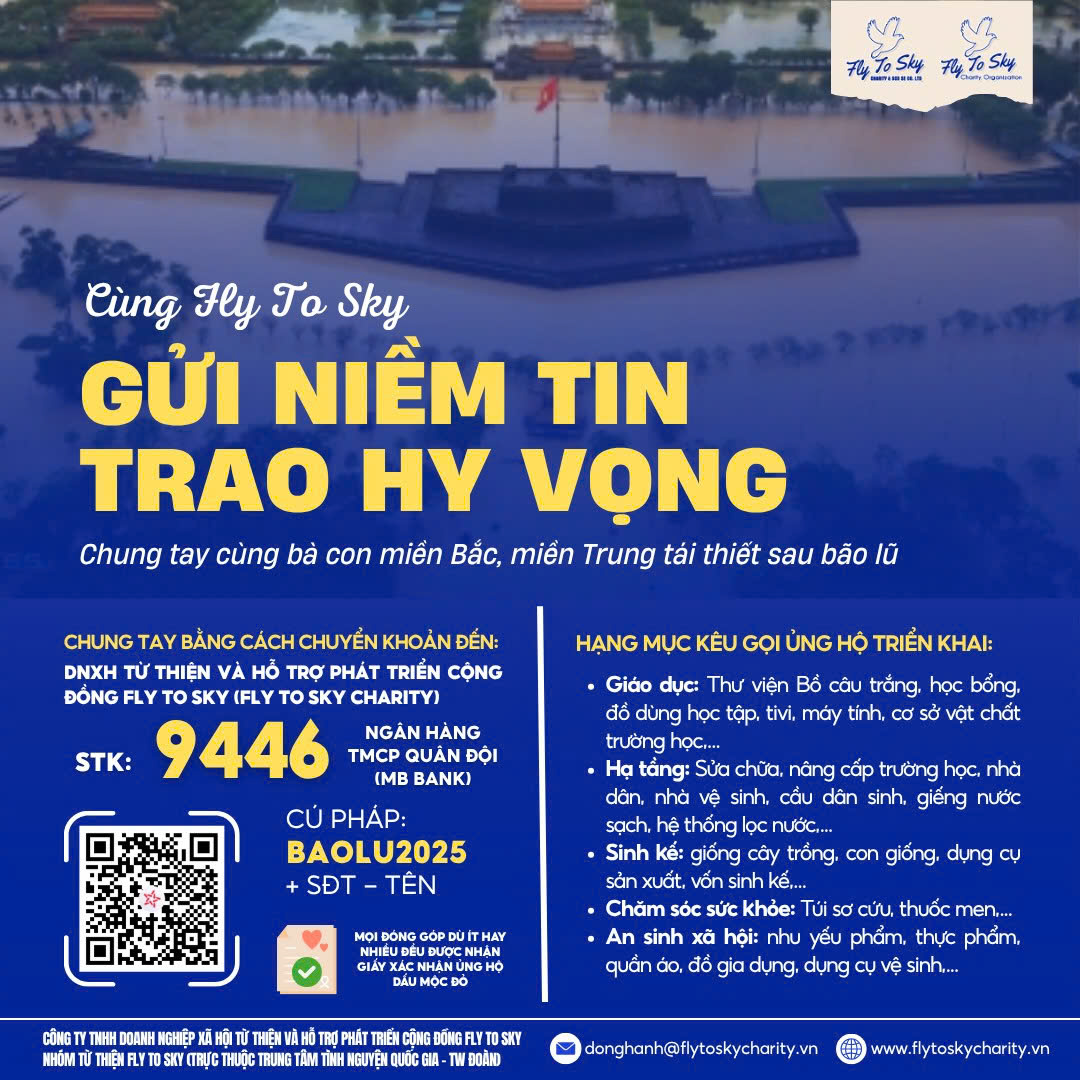 Hãy cùng Fly To Sky gửi niềm tin - trao hy vọng cho miền Trung. Mỗi hành động, dù nhỏ, đều góp phần kiến tạo sự thay đổi bền vững.