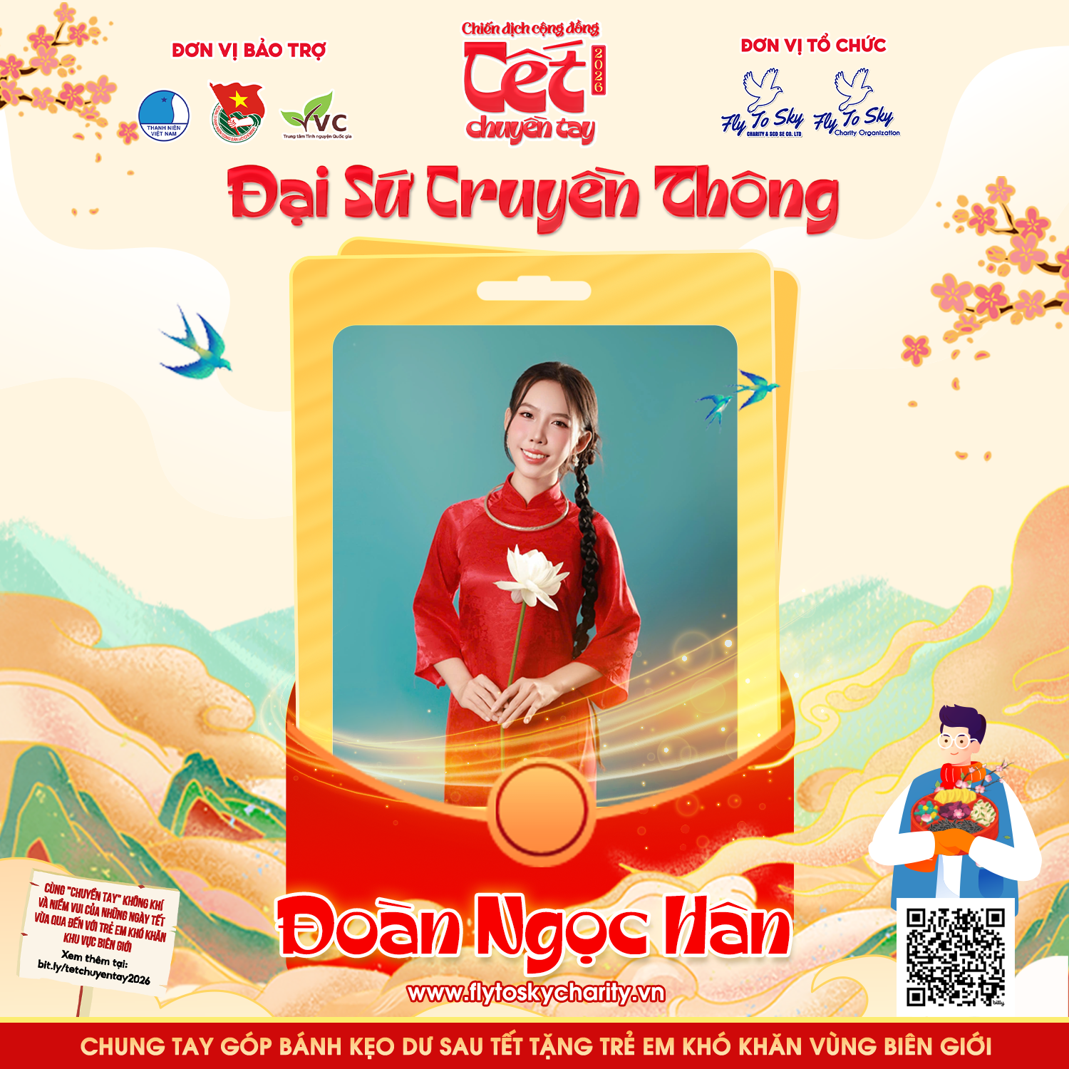 Viết tiếp ánh đèn sân khấu sau danh hiệu Hoa khôi Đại sứ Văn hóa ASEAN 2022, Đoàn Ngọc Hân tiếp tục chọn ghi dấu ấn bằng sự dấn thân và những hành động thực tế vì cộng đồng. Chiến dịch cộng đồng “Tết chuyền tay” năm 2026 vô cùng hào hứng khi có sự đồng hành của Ngọc Hân - một gương mặt đại diện cho thế hệ trẻ tài sắc, bản lĩnh và luôn tràn đầy năng lượng tích cực.